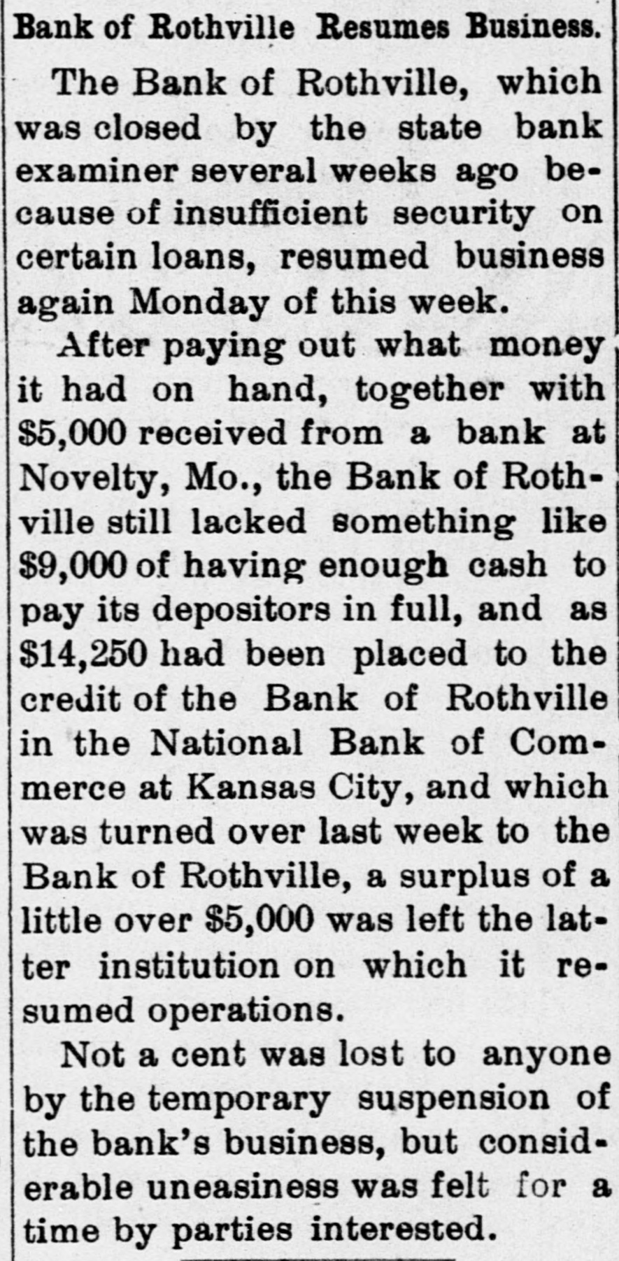 Rothville Bank Trouble Speaking of the suspension of business by the Bank of Rothville, the Rothville Record gives the following account of the affair: "Rothville has been in a state of worry and anxiety for the past week, caused by the fact that the of Rothville was practicalclosed since Bank Examiner had his ly Friday arrived, Bank having Tuesday. suspicions Biggs Last aroused at the Bank of Novelty, the finding Mo., by which of some had bogus notes there been floated by E. W. Settle, president of the Rothville bank, find and he was not surprised to $14,000 of the same kind of paper here. Settle had wired to Ciyde Riddell, the cashier, send this paper to Kansas City, but he had not had time to do so. Clyde was astounded to find that the collateral was bogus. Biggs at once commenced work to get Settle to make the shortage good and gave him until Monday to the do so. Biggs practically closed bank, but he and the cashier both considered it unwise to post formal statement until every means a had been used to make Settle raise the money. 'Wednesday the excitement ran very high among the depositors and fully 200 people were in gathered around the bank groups, while a low muttering murmuring monotone of despairing anger was plainly to .be heard in every direction. About 11 o'clock the Bank of Commerce of Kansas City wired the that they held $14,000 to credit of the Bank of Rothville, and this satisfied the crowd for awhile, but their suspicions already aroused, were soon as active as ever, and all kinds of suppositions were rife. They then soon began to disperse and J. Clyde Riddell and W. H. Long for took the afternoon train Kansas City. Telegrams Thurs- deday morning confirmed the posit of the money and it is supposed that everybody will now be paid in full. "The $14,000 deposited in Bank of Commerce has been held u.p. on settlement by bank, but it has given notice to Bank by was held and of money Rothville, telegram, would that not be paid. This means litigation Bank was closed Friday morn- F. ing by bank examiner, and F. Hamilton was appointed as special agent until the appointment of receiver by circuit indicourt. Appearances now cate that depositors will be paid in full. The business men are not seriously affected and bank's of failure will not injure business town." LATER:-Just before the COUto press we learn in the RIER $5,000 goes deposited Mr. Bank Set- that of Novelty, Mo., in which tle is also interested, to the cred- has it of the Bank of Rothville, or will be turned over to the latter institution. Nothing further, however, has yet been done in regard to the $14,000 at in the Bank of Commerce Kansas City. With the excep- of tion of the $5,000 in the Bank Novelty, matters stand as they did last week. Herefords for Sale. I have six registered Here