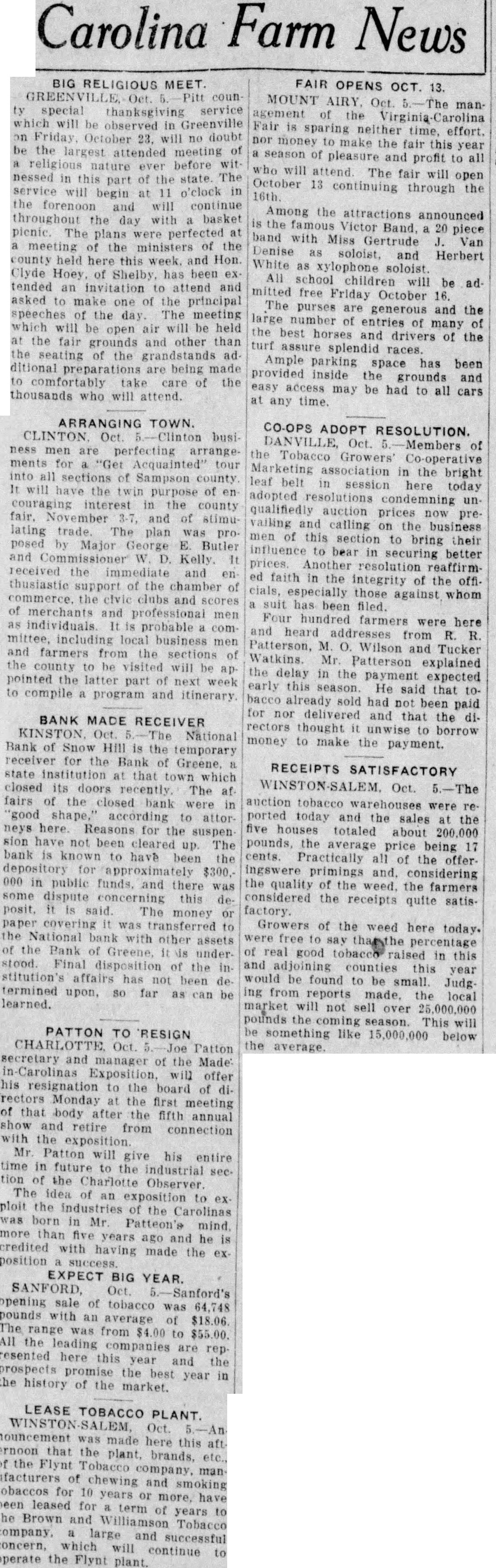 Carolina Farm News BIG RELIGIOUS MEET. GREENVILLE, Oct. Pitt coun ty special thanksgiving service which will be observed in Greenville on Friday. October 23. will no doubt be the largest attended meeting of religious nature ever before wit nessed in this part of the state. The service will begin at 11 o'clock in the forenoon and will continue throughout the day with basket pienic. The plans were perfected at meeting of the ministers of the county held here this week. and Hon. Clyde Hoey, of Shelby, has been extended an invitation to attend and asked to make one of the principal speeches of the day. The meeting which will be open air will be held at the fair grounds and other than the seating of the grandstands additional preparations are being made to comfortably take care of the thousands who will attend. ARRANGING TOWN. CLINTON Oct. Clinton business men are perfecting arrangements for a "Get Acquainted" tour into all sections of Sampson county It will have the twin purpose of en couraging interest in the county fair. November 3-7, and of stimulating trade. The plan was proposed by Major George E. Butler and Commissioner W. D. Kelly. It received the immediate and enthusiastic support of the chamber of commerce. the civic clubs and scores of merchants and professional men as individuals. It is probable com mittee, including local business men and farmers from the sections of the county to be visited will be appointed the latter part of next week to compile a program and itinerary BANK MADE RECEIVER KINSTON. Oct. The National Bank of Snow Hill is the temporary receiver for the Bank of Greene, state institution at that town which closed its doors recently. The af fairs of the closed bank were in "good shape," according to attor neys here. Reasons for the suspen sion have not been cleared up. The bank is known to have been the depository for approximately $300.000 in public funds, and there was some dispute concerning this deposit, it is said. The money or paper covering it was transferred to the National bank with other assets of the Bank of Greene, It is under stood. Final disposition of the in stitution's affairs has not been determined upon, so far as can be learned. PATTON TO RESIGN CHARLOTTE Oct. 5.-Joe Patton secretary and manager of the Made: in -Carolinas Exposition, will offer his resignation to the board of directors Monday at the first meeting of that body after the fifth annual show and retire from connection with the exposition Mr. Patton will give his entire time in future to the industrial sec tion of the Charlotte Observer. The idea of an exposition to ex ploit the industries of the Carolinas was born in Mr. Patteon's mind. more than five years ago and he is credited with having made the ex position success. EXPECT BIG YEAR. SANFORD. Oct. 5.-Sanford's opening sale of tobacco was 64,748 pounds with an average of $18.06 The range was from $4.00 to $55.00. All the leading companies are rep. resented here this year and the prospects promise the best year in the history of the market. LEASE TOBACCO PLANT. WINSTON-SALEM, Oct. 5.-An nouncement was made here this aft. ernoon that the plant, brands, etc., of the Flynt Tobacco company. manufacturers of chewing and smoking tobaccos for 10 years or more, have been leased for a term of years to the Brown and Williamson Tobacco company. a large and successful concern, which will continue to operate the Flynt plant. FAIR OPENS OCT. 13. MOUNT AIRY. Oct. management of the Virginia Carolina Fair is sparing neither time, effort. nor money to make the fair this year season of pleasure and profit to all who will attend The fair will open October 16th. 13 continuing through the Among the attractions announced is the famous Victor Band, a 20 piece band with Miss Gertrude J. Van Denise as soloist, and Herbert White as xylophone soloist. All school children will be admitted free Friday October 16. The purses are generous and the large number of entries of many of the best horses and drivers of the turf assure splendid races. Ample parking space has been provided inside the grounds and easy access may be had to all cars at any time. COOPS ADOPT RESOLUTION. DANVILLE, Oct. 5.-Members of the Tobacco Growers' Co-operative Marketing association in the bright leaf belt in session here today adopted resolutions condemning unqualifiedly auction prices now prevailing and calling on the business men of this section to bring their influence to bear in securing better prices. Another resolution reaffirmed faith in the integrity of the officials, especially those against whom suit has been filed. Four hundred farmers were here and heard addresses from R. R. Patterson, M. O. Wilson and Tucker Watkins. Mr. Patterson explained the delay in the payment expected early this season. He said that tobacco already sold had not been paid for nor delivered and that the directors thought it unwise to borrow money to make the payment. RECEIPTS SATISFACTORY WINSTON-SALEM. Oct. 5.-The auction tobacco warehouses were reported today and the sales at the five houses totaled about 200.000 pounds, the average price being 17 cents. Practically all of the offeringswere primings and. considering the quality of the weed. the farmers considered the receipts quite satisfactory. Growers of the weed here today. were free to say that the percentage of real good tobacco raised in this and adjoining counties this year would be found to be small. Judging from reports made, the local market will not sell over 25,000,000 pounds the coming season. This will be something like 15,000,000 below the average.