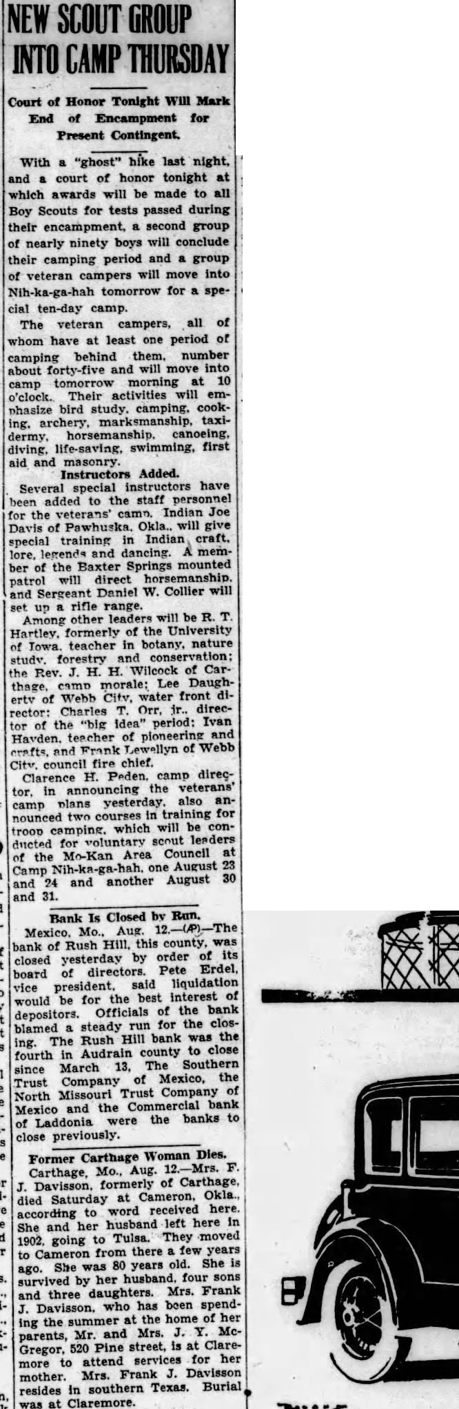 With a "ghost" hike last night, and a court of honor tonight at which awards will be made to all Boy Scouts for tests passed during their encampment, a second group of nearly ninety boys will conclude their camping period and a group of veteran campers will move into Nih-ka-ga-hah tomorrow for a special ten-day camp. The veteran campers, all of whom have at least one period of camping behind them. number about forty-five and will move into camp tomorrow morning at 10 o'clock. Their activities will emphasize bird study. camping, cooking. archery, marksmanship, taxidermy, horsemanship. canoeing, diving, life-saving, swimming, first aid and masonry. Instructors Added. Several special instructors have been added to the staff personnel for the veterans' camp. Indian Joe Davis of Pawhuska. Okla., will give special training in Indian craft. lore, legends and dancing. A member of the Baxter Springs mounted patrol will direct horsemanship. and Sergeant Daniel W. Collier will set up rifle range. Among other leaders will be R. T Hartley. formerly of the University of Iowa. teacher in botany. nature study. forestry and conservation: the Rev. J. H. H. Wilcock of Carthage, camp morale; Lee Daughertv of Webb City, water front director: Charles T. Orr, ir.. director of the "big idea" period: Ivan Havden. teacher of pioneering and crafts. and Frank Lewellyn of Webb City. council fire chief. Clarence H. Peden. camp director, in announcing the veterans' camp plans yesterday. also announced two courses in training for troop camping. which will be conducted for voluntary scout leaders of the Mo-Kan Area Council at Camp Nih-ka-ga-hah. one August 23 and 24 and another August 30 and 31.