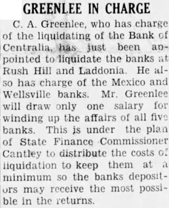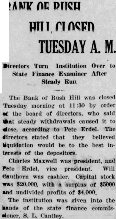 Bank Is Closed by Run. Mexico. Mo., Aug. 12.-(P)-The bank of Rush Hill, this county, was closed yesterday by order of its board of directors. Pete Erdel, vice president. said liquidation would be for the best interest of depositors. Officials of the bank blamed a steady run for the closing. The Rush Hill bank was the fourth in Audrain county to close since March 13, The Southern Trust Company of Mexico, the North Missouri Trust Company of Mexico and the Commercial bank of Laddonia were the banks to close previously.