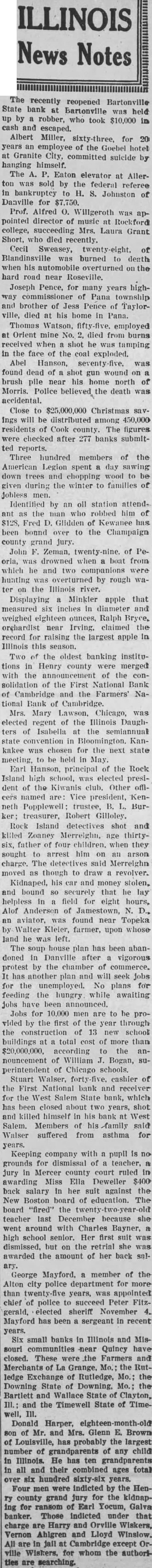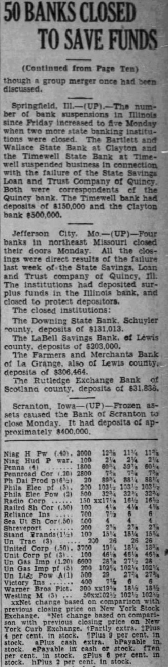 the estate of Elizabeth Bedford, was used to buy stock. When in the Bank of Kenmerged with Bank and the American Southern National Bank, stibsequent duced number shares held the Department of Education to 485. 60 per stock dividend in 1927 number of number owned by the Co-Receiver Appointed. Tenn. Nov. 17 Upon State Attorney General Smith, District Judge Gore late today Rutledge agent for the Tennessee Central Railway, as COreceiver for the properties Caldwell Nashville Smith will conjunetion Lee receiver named by Judge Gore last week when creditors' bill filed Caldwell by Fred Dean. Birmingham. Ala., creditor. Mr cause the size of the Caldwell The Attorney General's petition today set out that the nessee be largely the properties of Caldwell & Co." The added: would appear that the Bank of Co. was interested. numerous with petitioner on many not had on deposit large sume of money "Three million dollars was on deposit the the was taken charge by the State Superintendent of Banks. further appears that the petitioner may rectly the istration of the assets of Caldwell Co., only for reasons mentioned but for possibly other reasons petition that Caldwell Co. interested properties in twenty or more States. Mr. Douglas said he "welcomed" the appointment said he informally asked for aid at the time first appointed. Creditors' Bill Sustained. Mr. Smith and Mr. Douglas enjoy rights and authority as reruled The bill filed last against was today by Judge who fixed July the last date for the filing claims In today, Judge Gore enjoined the filing against the ceeding. the court's consuits pending. order pointed out that condition the market and due to the fact that large portion its realized upon, unable to its mature and faced multiplicity Danger assets being by accumulation of court costs and the like was cited reason for sustaining the bill. The opinion today Banks. that troubles are their scare and thinking along sound Deposits Pick Up. Nov The fect bank with the six tributary day. In Quincy where three banks an increasing manifest in deposits that withdrawals. Four small banks in Missouri and two this shut their doors weakened by the close banks placed the hands of bank examiners in the ten days. Bartlett and Wallace State Bank TimeState Bank were today and Missouri State officials the Farmers and Bank La Grange, Rutledge Exchange of Rutledge Downing Bank Labelle Bank Labelle. confidence published in local newspapers and pleas Sunday still some assurance in depositors. Two Small Banks Close. Des institution, and the George Savings Bank George were closed today their directors because deposits frozen bank $5,000 and the George bank $30,000.