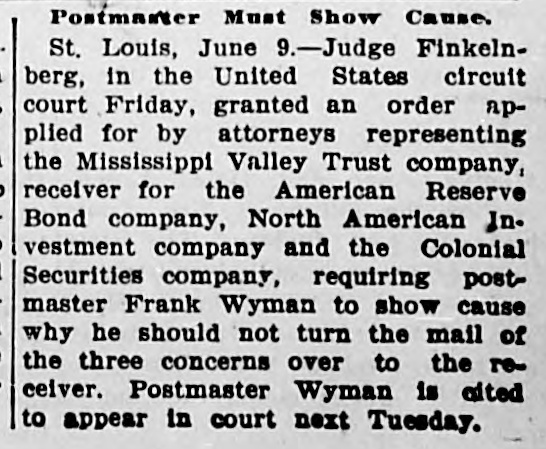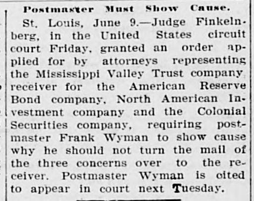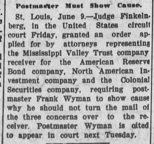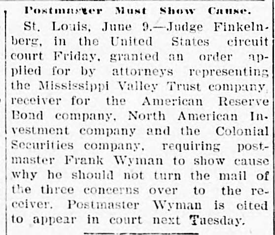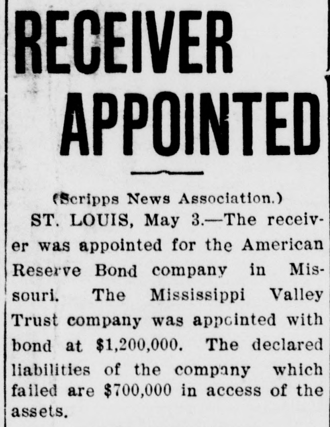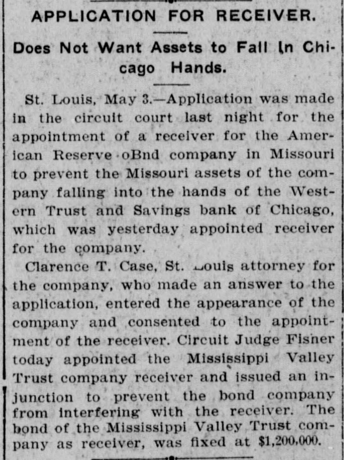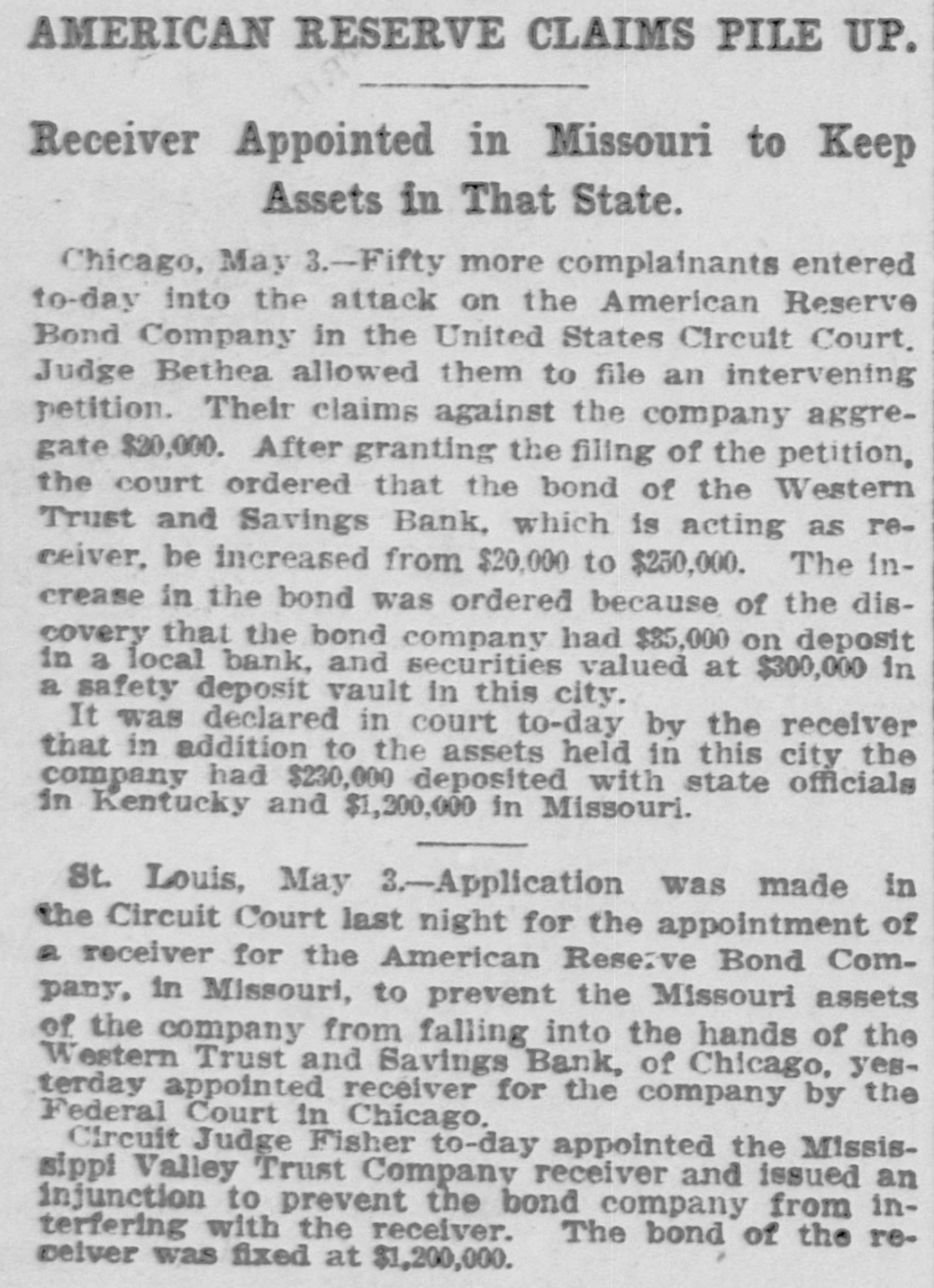 AMERICAN RESERVE CLAIMS PILE UP. Receiver Appointed in Missouri to Keep Assets in That State. Chicago, May 3.-Fifty more complainants entered to-day into the attack on the American Reserve Bond Company in the United States Circuit Court. Judge Bethea allowed them to file an intervening petition. Their claims against the company aggregate $20,000. After granting the filing of the petition, the court ordered that the bond of the Western Trust and Savings Bank, which is acting as receiver, be increased from $20,000 to $250,000. The increase in the bond was ordered because of the discovery that the bond company had $35,000 on deposit in a local bank, and securities valued at $300,000 in a safety deposit vault in this city. It was declared in court to-day by the receiver that in addition to the assets held in this city the company had $230,000 deposited with state officials in Kentucky and $1,200,000 in Missouri. St. Louis, May 3.-Application was made in the Circuit Court last night for the appointment of a receiver for the American Reserve Bond Company. in Missouri, to prevent the Missouri assets of the company from falling into the hands of the Western Trust and Savings Bank, of Chicago, yesterday appointed receiver for the company by the Federal Court in Chicago. Circuit Judge Fisher to-day appointed the Mississippi Valley Trust Company receiver and issued an injunction to prevent the bond company from interfering with the receiver. The bond of the recelver was fixed at $1,200,000.