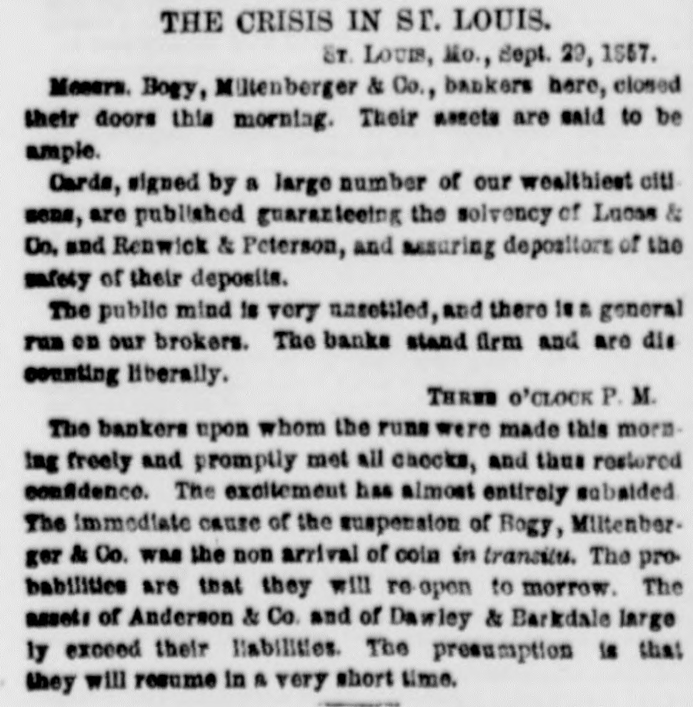Multiple contemporaneous newspaper dispatches (dated Sept 29, 1857) report Bogy, Miltenberger & Co. closed their doors (suspended) after heavy withdrawals. The papers state the immediate cause was the non‑arrival of coin in transit (specie shortage). Bankers met checks, confidence was restored and the firm was expected to re‑open (reports say probabilities are that they will re-open to morrow), so the sequence is a run leading to a suspension with an anticipated reopening.