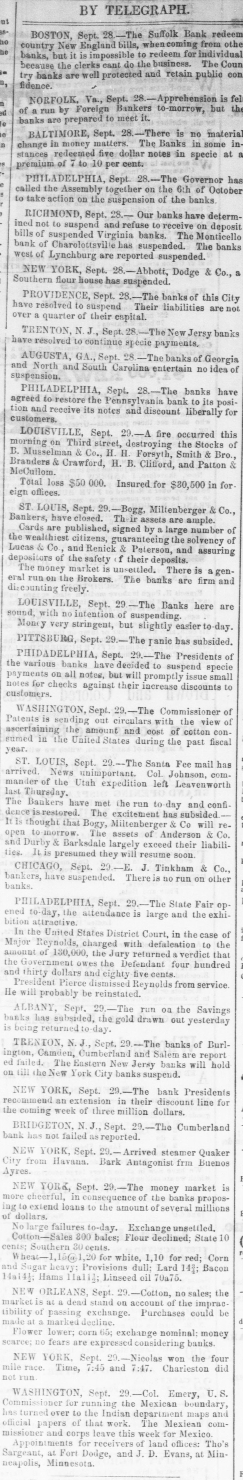 have resolved to suspend Their liabilities are not over a quarter of their capital. TRENTON, N. J., Sept. 28.-The New Jersy banks have resolved to continue specie payments. AUGUSTA, GA., Sept. 28.-The banks of Georgia and North and South Carolina entertain no idea of suspension. PHILADELPHIA, Sept. 28.-The banks have agreed to restore the Pennsylvania bank to its position and receive its notes and discount liberally for customers. LOUISVILLE, Sept. 29.-A fire occurred this morning on Third street, destroying the Stocks of B. Musselman & Co., H. H. Forsyth, Smith & Bro., Branders & Crawford, H. B. Clifford, and Patton & McCullom. Total loss $50 000. Insured for $80,500 in for. eign offices. ST. LOUIS, Sept. 29.-Bogg, Miltenberger & Co., Bankers, have closed. Their assets are ample. Cards are published, signed by a large number of the wealthiest citizens, guaranteeing the solvency of Lucas & Co., and Renick & Peterson, and assuring depositors of the safety of their deposits. The money market is unsettled. There is a general run on the Brokers. The banks are firm and discounting freely. LOUISVILLE, Sept. 29.-The Banks here are sound, with no intention of suspending. Money very stringent, but slightly easier to-day. PITTSBURG, Sept. 29.-The panic has subsided. PHIDADELPHIA, Sept. 29.-The Presidents of the various banks have decided to suspend specie payments on all notes, but will promptly issue small notes for checks against their increase discounts to customers. WASHINGTON, Sept. 29.-The Commissioner of Patents is sending out circulars with the view of ascertaining the amount and cost of cotton consumed in the United States during the past fiscal year. ST. LOUIS, Sept. 29.-The Santa Fee mail has arrived. News unimportant. Col. Johnson, commander of the Utah expedition left Leavenworth last Thursday. The Bankers have met the run to-day and confidence is restored. The excitement has subsided.It is thought that Bogy, Miltenberger & Co will reopen to morrow. The assets of Anderson & Co. and Durby & Barksdale largely exceed their liabilities. It is presumed they will resume soon. CHICAGO, Sept. 29.-E. J. Tinkham & Co., bankers, have suspended. There is no run on other banks. PHILADELPHIA, Sept. 29.-The State Fair opened to-day, the attendance is large and the exhibition attractive. In the United States District Court, in the case of Major Reynolds, charged with defalcation to the amount of 130,000, the Jury returned a verdict that the Government owes the Defendant four hundred and thirty dollars and eighty five cents. President Pierce dismissed Reynolds from service. He will probably be reinstated. ALBANY, Sept. 29.-The run on the Savings banks has subsided, the gold drawn out yesterday is being returned to day. TRENTON, N.J., Sept. 29.-The banks of Burlington, Camden, Cumberland and Salem are report ed failed. The Eastern New Jersy banks will hold on till the New York City banks suspend. NEW YORK, Sept. 29.-The bank Presidents recommend an extension in their discount line for the coming week of three million dollars. BRIDGETON, N. J., Sept. 29.-The Cumberland bank has not failed as reported. NEW YORK, Sept. 29.-Arrived steamer Quaker City from Havana. Bark Antagonist frm Buenos Ayres. NEW YORK, Sept. 29.-The money market is more cheerful, in consequence of the banks proposing to extend loans to the amount of several millions of dollars. No large failures to-day. Exchange unsettled. Cotton-Sales 300 bales; Flour declined; State 10 cents; Southern 30 cents. r Vheat-1,15@1,20 for white, 1,10 for red; Corn and Sugar heavy; Provisions dull: Lard 141; Bacon 14a14}; Hams llall]; Linseed oil 70a75. NEW ORLEANS, Sept. 29.-Cotton, no sales; the market is at a dead stand on account of the impractibility of passing exchange. Purchases could be d made at a marked decline. Flower lower; corn 65; exchange nominal: money scarce; no fears are expressed considering banks. NEW YORK, Sept. 29.-Nicolas won the four mile race. Time, 7:45 and 7:47. Charleston did not run. WASHINGTON, Sept. 29.-Col. Emery, U.S. Commissioner for running the Mexican boundary, has turned over to the Indian department maps and official papers of that work. The Mexican commissioner and corps leave this week for Mexico. Appointments for receivers of land offices: Tho's