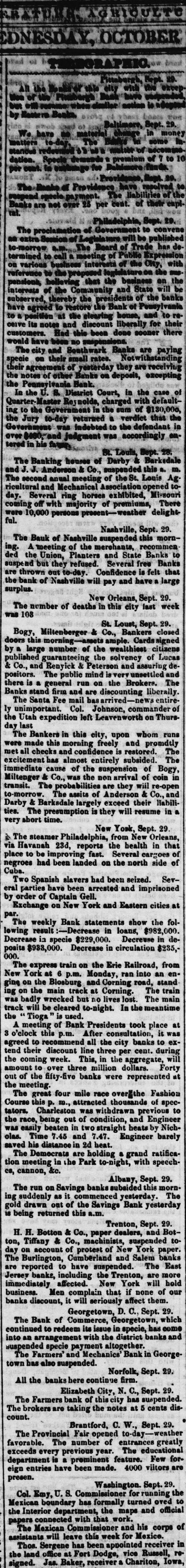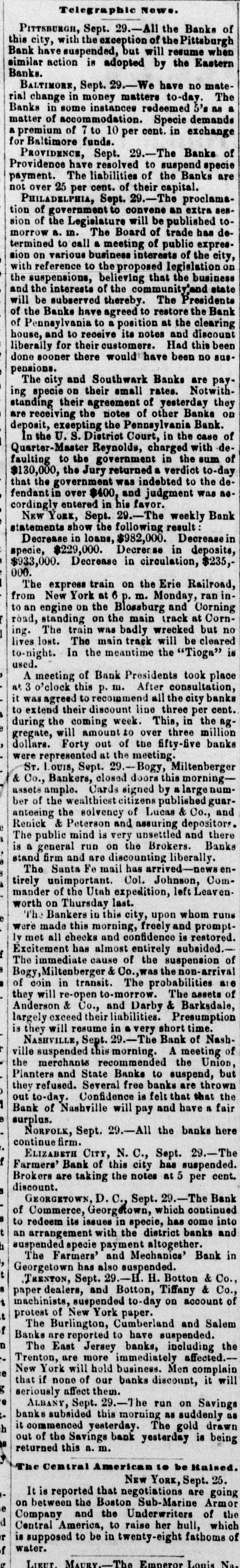 Telegraphic News. PITTSBURGH, Sept. 29.-All the Banks of this city, with the exception of the Pittsburgh Bank have suspended, but will resume when similar action is adopted by the Eastern Banks. BALTIMORE, Sept. 29.-We have no material change in money matters to-day. The Banks in some instances redeemed 5's as a matter of accommodation. Specie demands a premium of 7 to 10 per cent. in exchange for Baltimore funds. PROVIDENCE, Sept. 29.-The Banks of Providence have resolved to suspend specie payment. The liabilities of the Banks are not over 25 per cent. of their capital. Philadelphia, Sept. 29.-The proclamstion of government to convene an extra session of the Legislature will be published tomorrow a. m. The Board of trade has determined to call a meeting of public expression on various business interests of the city, with reference to the proposed legislation on the suspensions, believing that the business and the interests of the community'and state will be subserved thereby. The Presidents of the Banks have agreed to restore the Bank of Pennsylvania to a position at the clearing house, and to receive its notes and discount liberally for their customers. Had this been done sooner there would have been no suspensions. The city and Southwark Banks are paying specie on their small rates. Notwithstanding their agreement of yesterday they are receiving the notes of other Banks on deposit, excepting the Pennsylvania Bank. In the U. S. District Court, in the case of Quarter-Master Reynolds, charged with defaulting to the government in the sum of $130,000, the Jury returned a verdict to-day that the government was indebted to the defendant in over $400, and judgment was aecordingly entered in his favor. New YORK, Sept. 29.-The weekly Bank statements show the following result Decrease in loans, $982,000. Decreasein specie, $229,000. Decrease in deposits, $933,000. Decrease in circulation, $235,000. The express train on the Erie Railroad, from New York at 6 p. m. Monday, ran into an engine on the Blossburg and Corning road, standing on the main track at Corning. The train was badly wrecked but no lives lost. The main track will be cleared to-night. In the meantime the "Tioga" is used. A meeting of Bank Presidents took place at 3 o'clock this p. m. After consultation, it was agreed to recommend all the city banks to extend their discount line three per cent. during the coming week. This, in the aggregate, will amount to over three million dollars. Forty out of the fifty-five banks were represented at the meeting. Sr. LOUIS, Sept. 29.-Bogy, Miltenberger & Co., Bankers, closed doors this morningassets ample. Cards signed by alargenumber of the wealthiest citizens published guaranteeing the solvency of Lucas & Co., and Renick & Peterson and assuring depositors. The public mind is very unsettled and there is a general run on the Brokers. Banks stand firm and are discounting liberally. The Santa Fe mail has arrived-news entirely unimportant. Col. Johnson, Commander of the Utah expedition, left Leavenworth on Thursday last. The Bankers in this city, upon whom runs were made this morning, freely and promptly met all checks and confidence is restored. Excitement has almost entirely subsided.The immediate cause of the suspension of Bogy, Miltenberger & Co., the non-arrival of coin in transit. The probabilities are they will re-open to-morrow. The assets of Anderson & Co., and Darby & Barksdale, largely exceed their liabilities. Presumption is they will resume in a very short time. NASHVILLE, Sept. 29.-The Bank of Nashville suspended this morning. A meeting of the merchants recommended the Union, Planters and State Banks to suspend, but they refused. Several free banks are thrown out to-day. Confidence is felt that that the Bank of Nashville will pay and have a fair surplus. NORFOLK, Sept. 29.-All the banks here continue firm. ELIZABETH CITY, N. C., Sept. 29.-The Farmers' Bank of this city has suspended. Brokers are taking the notes at 5 per cent. discount. GEORGETOWN, D. C., Sept. 29.-The Bank of Commerce, Georgetown, which continued to redeem its issues in specie, has come into an arrangement with the district banks and suspended specie payment altogether. The Farmers' and Mechanics' Bank in Georgetown has also suspended. TRENTON, Sept. 29.-H. H. Botton & Co., paper dealers, and Botton, Tiffany & Co., machinists, suspended to-day on account of protest of New York paper. The Burlington, Cumberland and Salem f Banks are reported to have suspended. The East Jersey banks, including the Trenton, are more immediately affected.New York will hold business. Men complain that if none of our banks discount, it will seriously affect them. ALBANY, Sept. 29.-7 he run on Savings banks subsided this morning as suddenly as it commenced yesterday. The gold drawn out of the Savings bank yesterday is being returned this a. m. The Central American to be Haised. NEW YORK, Sept. 25. It is reported that negotiations are going on between the Boston Sub-Marine Armor Company and the Underwriters of the Central America, to raise her hull, which is supposed to be in twenty-eight fathoms of water.