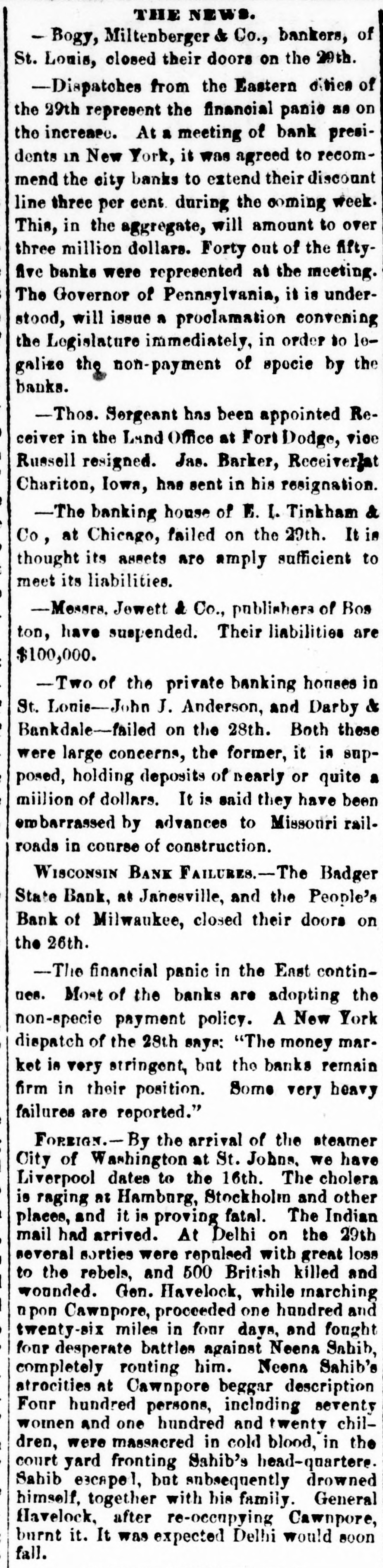 THE NEWS. - Bogy, Miltenberger & Co., bankers, of St. Louis, closed their doors on the 29th. -Dispatches from the Eastern dities of the 29th represent the financial panie as on the increase. At a meeting of bank presidents in New York, it was agreed to recommend the city banks to extend their discount line three per cent. during the coming week. This, in the aggregate, will amount to over three million dollars. Forty out of the fiftyfive banks were represented at the meeting. The Governor of Pennsylvania, it is understood, will issue a proclamation convening the Legislature immediately, in order to legalize the non-payment of spocie by the banks. -Thos. Sergeant has been appointed Receiver in the Land Office at Fort Dodge, vioe Russell resigned. Jas. Barker, Receiver}at Chariton, Iowa, has sent in his resignation. -The banking house of E. I. Tinkham & Co, at Chicago, failed on the 29th. It is thought its assets are amply sufficient to meet its liabilities. -Messrs. Jewett & Co., publishers of Bos ton, have suspended. Their liabilities are $100,000. -Two of the private banking houses in St. Lonis-John J. Anderson, and Darby & Bankdale-failed on the 28th. Both these were large concerns, the former, it is supposed, holding deposits of nearly or quite a miilion of dollars. It is said they have been embarrassed by advances to Missonri railroads in course of construction. WISCONSIN BANK FAILURES.-The Badger State Bank, at Janesville, and the People's Bank of Milwaukee, closed their doors on the 26th. -The financial panic in the East continues. Most of the banks are adopting the non-specie payment policy. A New York dispatch of the 28th says: "The money market is very stringent, but the banks remain firm in their position. Some very heavy failures are reported." FOREIGN.- By the arrival of the steamer City of Washington at St. Johns. we have Liverpool dates to the 16th. The cholera is raging at Hamburg, Stockholm and other places, and it is proving fatal. The Indian mail had arrived. At Delhi on the 29th several sorties were repulsed with great loss to the rebels, and 500 British killed and wounded. Gen. Havelock, while marching upon Cawnpore, proceeded one hundred and twenty-six miles in four days, and fought four desperate battles against Neena Sahib, completely routing him. Neena Sahib's atrocities at Cawnpore beggar description Four hundred persons, including seventy women and one hundred and twenty children, were massacred in cold blood, in the court yard fronting Sahib's head-quartere. Sahib escapel, but subsequently drowned himself, together with his family. General Havelock, after re-occupying Cawnpore, burnt it. It was expected Delhi would soon fall.