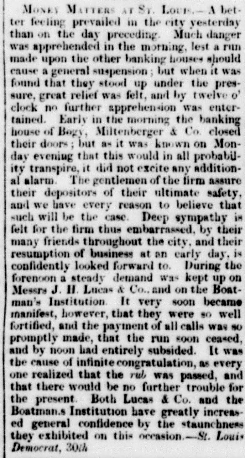 MONEY MATTERS AT Sr. LOUIS.-A better feeling prevailed in the city yesterday than on the day preceding. Much danger was apprehended in the morning, lest a run made upon the other banking houses should cause a general suspension; but when it was found that they stood up under the pressure, great relief was felt, and by twelve o' clock no further apprehension was entertained. Early in the morning the banking house of Bogy, Miltenberger & Co. closed their doors; but as it was known on Monday evening that this would in all probability transpire, it did not excite any additional alarm. The gentlemen of the firm assure their depositors of their ultimate safety, and we have every reason to believe that such will be the case. Deep sympathy is felt for the firm thus embarrassed, by their many friends throughout the city, and their resumption of business at an early day, is confidently looked forward to. During the forenoon a steady demand was kept up on Messrs J. II. Lucas & Co., and on the Boatman's Institution. It very soon became manifest, however, that they were so well fortified, and the payment of all calls was so promptly made, that the run soon ceased, and by noon had entirely subsided. It was the cause of infinite congratulation, as every one realized that the rub was passed, and that there would be no further trouble for the present. Both Lucas & Co. and the Boatman.s Institution have greatly increased general confidence by the staunchness they exhibited on this occasion.-St. Louis Democrat, 30th
