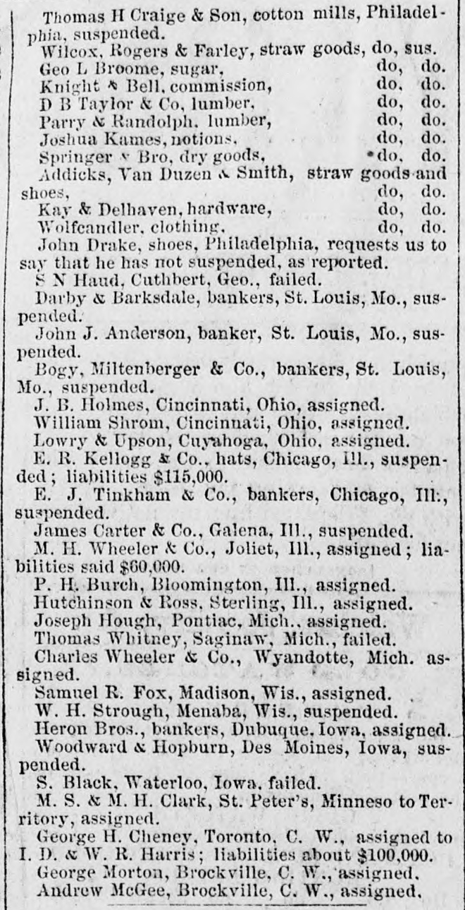 Thomas H Craige & Son, cotton mills, Philadelphia, suspended. Wilcox, Rogers & Farley, straw goods, do, sus. do, do. Geo L Broome, sugar, do, do. Knight & Bell, commission, do, do. D B Taylor & Co, lumber. do, do. Parry & Randolph. lumber, do, do. Joshua Kames, notions. do, do. Springer N Bro, dry goods, Addicks, Van Duzen in Smith, straw goods and do, do. shoes, do, do. Kay & Delhaven, hardware, Wolfcandler. clothing. do, do. John Drake, shoes, Philadelphia, requests us to say that he has not suspended, as reported. S N Haud, Cuthbert, Geo., failed. Darby & Barksdale, bankers, St. Louis, Mo., suspended. John J. Anderson, banker, St. Louis, Mo., suspended. Bogy, Miltenberger & Co., bankers, St. Louis, Mo., suspended. J. B. Holmes, Cincinnati, Ohio, assigned. William Shrom, Cincinnati, Ohio, assigned. Lowry & Upson, Cuyahoga, Ohio, assigned. E. R. Kellogg & Co., hats, Chicago, III., suspended; liabilities $115,000. E. J. Tinkham & Co., bankers, Chicago, III:, suspended. James Carter & Co., Galena, III., suspended. M. H. Wheeler & Co., Joliet, III., assigned; liabilities said $60,000. P. H. Burch, Bloomington, III., assigned. Hutchinson & Ross, Sterling, III., assigned. Joseph Hough, Pontiac, Mich., assigned. Thomas Whitney, Saginaw, Mich., failed. Charles Wheeler & Co., Wyandotte, Mich. assigned. Samuel R. Fox, Madison, Wis., assigned. W. H. Strough, Menaba, Wis., suspended. Heron Bros., bankers, Dubuque. Iowa, assigned. Woodward & Hopburn, Des Moines, Iowa, suspended. S. Black, Waterloo, Iowa. failed. M. S. & M. H. Clark, St. Peter's, Minneso to Territory, assigned. George H. Cheney, Toronto, C. W., assigned to I. D. & W. R. Harris; liabilities about $100,000. George Morton, Brockville, C. W., assigned. Andrew McGee, Brockville, C. W., assigned.
