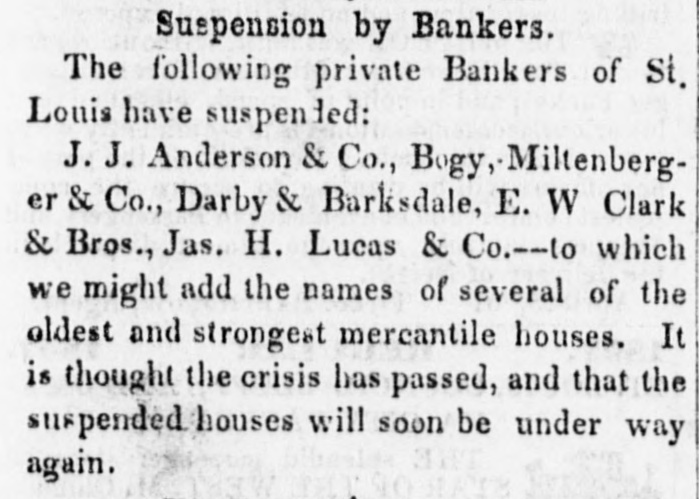 Suspension by Bankers. The following private Bankers of St. Louis have suspended: J. J. Anderson & Co., Bogy, Miltenberger & Co., Darby & Barksdale, E. W Clark & Bros., Jas. H. Lucas & Co.--to which we might add the names of several of the oldest and strongest mercantile houses. It is thought the crisis has passed, and that the suspended houses will soon be under way again.