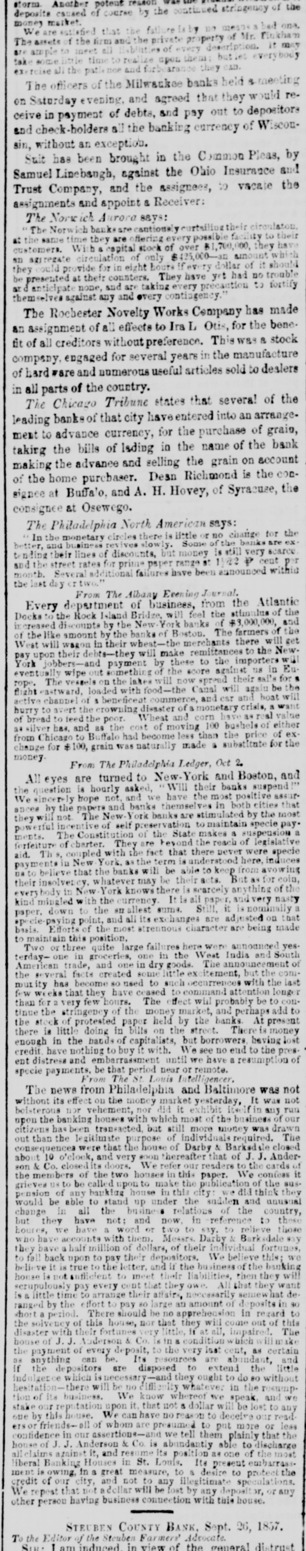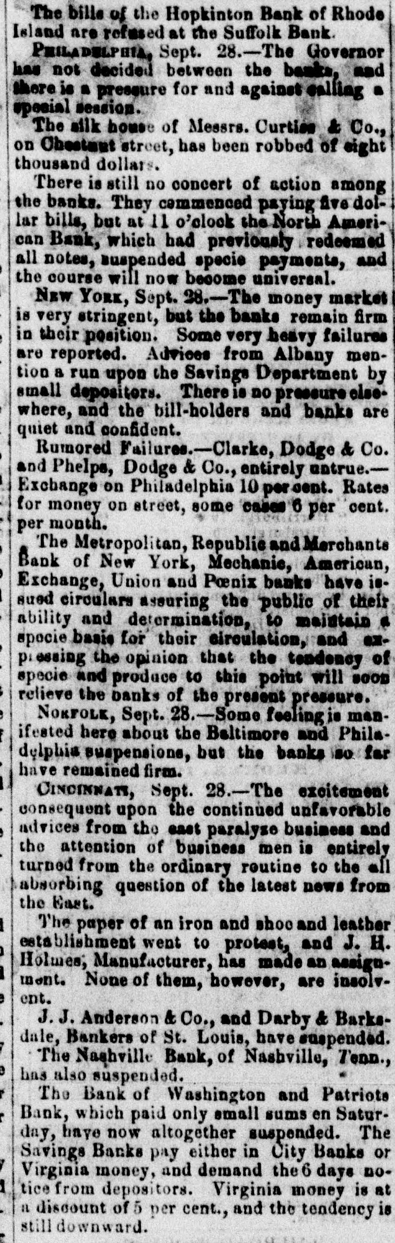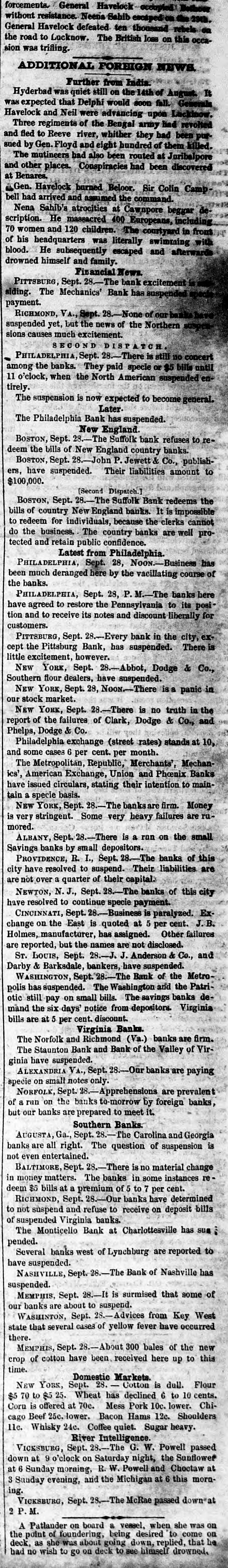 forcements. General Havelock occupied Bothous without resistance. Neena Sahib General Havelock defeated ten thousand rebelside the road to Locknow. The British loss on this occasion was trilling. ADDITIONAL FORHIGN NEWS Further from India Hyderbad was quiet still on the 14th of August It was expected that Delphi would soon fall. Generals Havelock and Neil were advancing upon Lackbnow. Three regiments of the Bengal army Had revolted and fied to Reeve river, whither they had been pursued by Gen. Floyd and eight hundred of them killed. The motineers had also been routed at Juribalpore and other places. Conspiracies had been discovered at Benares. Gen. Havelock burned Beloor. Sir Colin Camp bell had arrived and assumed the command. Nena Sahib's atrocities at Cawnpore beggar description. He massacred 400 Europeans, including 70 women and 120 children. The courtyard in front of his beadquarters was literally swimming with blood. He subsequently escaped and afterwards drowned himself and family. Financial News. PITTSBURG, Sept. bank excitement siding. The Mechanics' Bank has suspended payment. RICHMOND, VA., Sept. 28. None of our banksha suspended yet, but the news of the Northern suspes sions causes much excitement SECOND D ISPATCH PHILADELPHIA Sept. There is still no concert among the banks. They paid specie or $5 bills until 11 o'clock, when the North American suspended entirely. The suspension is now expected to become general. Later The Philadelphia Bank has suspended. New England BOSTON, Sept. 28.-The Suffolk bank refuses toredeem the bills of New England country banks. BOSTON, Sept. 28. John P. Jewett Co., publishers, have suspended. Their liabilities amount to $100,000. [Second Dispatch.] BOSTON, Sept. -The Suffolk Bank redeems the bills of country New England banks. It is impossible to redeem for individuals, because the clerks cannot do the business. The country banks are well protected and retain public confidence. Latest from Philadelphia. PHILADELPHIA, Sept. 28, Noon.-Business has been much deranged here by the vacillating course of the banks. PHILADELPHIA, Sept. 28, P. The ban here have agreed to restore the Pennsylvania to its posi tion and to receive its notes and discount liberally for customers. PITTSBURG, Sept. Every bank in the city, except the Pittsburg Bank, has suspended. There is little excitement, however. NEW YORK, Sept. 28.-Abbot, Dodge & Co., Southern flour dealers, have suspended. NEW YORK, Sept. 28, NOON. There is a panic in our stock market. NEW YORK, Sept. 28 -There is no truth in the report of the failures of Clark, Dodge & Co., and Phelps, Dodge Co. Philadelphia exchange (street rates) stands at 10, and some cases 6 per cent. per month. The Metropolitan, Republic, Merchants', Mechanics', American Exchange, Union and Phonix Banks have issued circulars, stating their intention to maintain specie basis. NEW YORK, Sept. 28. -The banksare firm. Money is very stringent. Some very heavy failures are rumored. ALBANY, Sept. -There is a run on the small Savings banks by small depositors. PROVIDENCE, R. I., Sept. 28. The banks of this are city have resolved to suspend. Their liabilities. are not over a quarter of their capital. NEWTON, N. J., Sept. 28. The banks of this city have resolved to continue specie payment. CINCINNATI, Sept. 28. Business is paralyzed. Exchange on the East is quoted at 5 per cent. J.B. Holmes, manufacturer, has assigned. Other failures are reported, but the names are not disclosed. Sr. LOUIS, Sept. 28.-J. J. Anderson & Co., and Darby & Barksdale, bankers, have suspended. WASHINGTON, Sept. 28.-- The Bank of the Metropolis has suspended. The Washington and the Patriotic still pay on small bills. The savings banks demand the six days' notice from depositors. Virginia bills are at 5 per cent. discount. Virginia Banks. The Norfolk and Richmond (Va.) banks are firm. The Staunton Bank and Bank of the Valley of Virginia have suspended. ALEXANDRIA VA., Sept. 28.- Our banks are paying specie on small notes only. NORFOLK, Sept. 28.- Apprehensions are prevalent of run on the banks to-morrow by foreign banks, but our banks are prepared to meet it. Southern Banks. AUGUSTA Ga., Sept. 28.-The Carolina and Georgia banks are all right. The question of suspension is not even entertained. BALTIMORE, Sept. -There is no material change in money matters. The banks in some instances re deem $5 bills at a premium of to 7 per cent. RICHMOND, Sept. 28.-- Our banks have determined to not suspend and refuse to receive on deposit bills of suspended Virginia banks. The Monticello Bank at Charlottesville has sua : pended. Several banks west of Lynchburg are reported to have suspended. NASHVILLE, Sept. 28.-The Bank of Nashville has suspended. MEMPHIS Sept. 28.-It is surmised that some of our banks are about to suspend. WASHINTON, Sept. -Advices from Key West state that several cases of yellow fever have occurred there. MEMPHIS, Sept. -About 300 bales of the new crop of cotton have been received here up to this time. Domestic Markets. NEW York, Sept. 28. Cotton is dull. Flour $5 70 to $5 25. Wheat has declined 6 to 10 cents. Corn is offered at 70c. Mess Pork 10c. lower. Chicago Beef 25c. lower. Bacon Hams 12c. Shoulders 11c. Whisky 24c. Coffee quiet. Sugar heavy. River Intelligence. VICKSBURG, Sept. 28.-The G. W. Powell passed down at 9 o'clock on Saturday night, the Sunflower at 6 Sunday morning, R. W. Powell and Choctaw at 3 Sunday evening, and the Michigan at 6 this moraing. VICKSBURG, Sept. 28.- The McRae passed down at 2 M. A Patlander on board a vessel, when she was on point of foundering, being desired to come on he the as she was about going down, replied, that had deck, no wish to go on deck to see himself drowned.