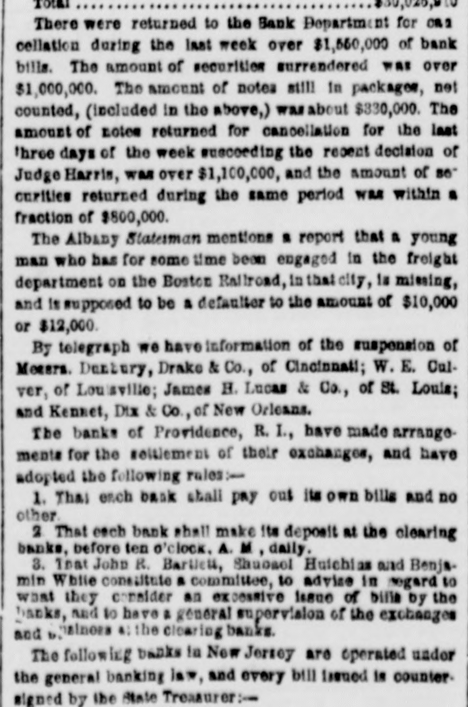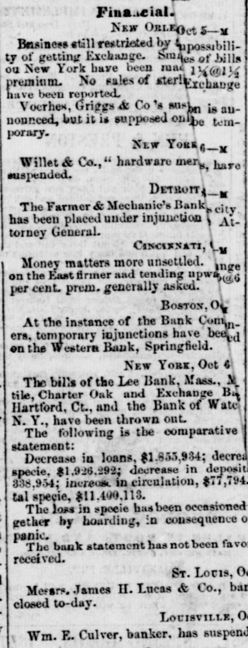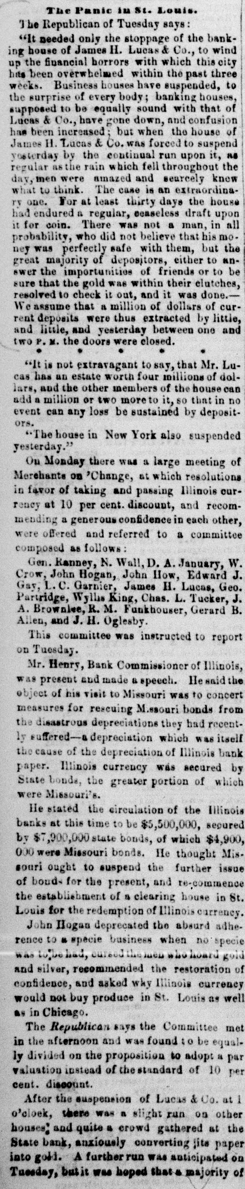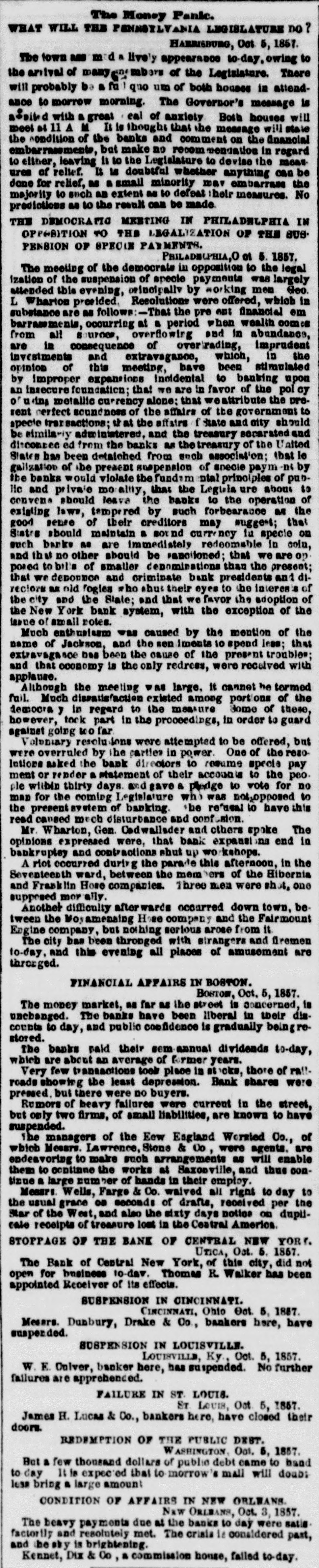The Money Panic. WHAT WILL THE PENNSYLVANIA LEGISLATURE no HARRISBURG, Det 5, 1857. The town am med a lively appearable to-day, owing to the anival of of the Legislature. There will probably be a fu quo um of both houses in attendance to morrow morning. The Governor's message is a-aind with a great eal of anxiety Both houses will meet at 11 A M It is thought that he message will state the condition of the banks and comment on the financial embarrassments, but make no recom mendation in regard to either, leaving is to the Legislature to devise the meas. ures of relief. It is doubtful whether anything can be done for relief, M a small minority mav embarrass the majority to such an extent as to defeat heir measures. No predictions as to the result can be made THE DEMOCRATIC MEETING IN PHILADHLPHIA IN OPPOSITION TO THE LEGALIZATION OF THE BUS PENSION OF SPECIN PAYMENTS. Philadhuphia, ot 5. 1857. The meeting of the democrate in opposition to the legal ization of the suspension of specie payments was largely attended this evening, orincipally by working men Geo. L Wharton preeided, Resolutions were offered, which in substance are as follows:-That the pre ent financial em barrasoments, occurring at a period when wealth comes from all sources, overflowing and in abundance, are in consequence of over rading, imprudent investments and extravagance, which, in the opinion of this meeting, have been stimulated by improper expansions incidental to banking upon an insecure foundation; that we are in favor of the pol cy of usins metallic currency alone: that eattribute the present cerfect scundness of the affairs of the government to specie areactions; at the affairs f State and city should be similarly administered, and the treasury secarated and discounce ed from the banks as the treasury of the United States has been detaiched from such association; that le galization of be present suspension of specie paym nt by the banks would violate thefundam ntal principles of public and private mo ality, that the Legisla ure about to convens should leave the banks to the operation of existing laws, tempered by such forbearauce M the good sense of their creditors may suggest; that States should maintain a sound currency tu specie on such banks as are immediately redeomable in coin, and that no other should be panciloned; that we are on posed to bills of smaller denominations than the present; that we decomece and criminate bank presidents and directors as old fogies who shut their eyes to the interes's of the city and the State; and that we favor the adoption of the New York bank system, with the exception of the issue of small notes. Much enthusissm was caused by the mention of the name of Jackson, and the sen iments 10 spend leas; that extravagance bas been the cause of the present troubles; and that economy is the only redress, were received with applause. Although the meeting was large, it cannet be termed fail. Much dissatisfaction existed among portions of the democra , in regard to the measure Some of these, however, took part in the proceedings, in order to guard against going too far Volumary resolutions were attempted to be offered, but were overruled by the parties in power. One of the resoIntions asked the bank directors to resume specia pay ment or render a statement of their accounts to the peo. ple within thirty days. and save & pledge to vote for no man for the coming Legislature who was not-opposed to the present system of banking. the refusal to have this read caused much disturbance and confusion. Mr. Wharton, Gen. Cadwallsder and others spoke The opinions expressed were, that bank expanst na end in bankruptey and contractions shut up workshops. A riot occurred during the parade this afternoon, in the Seventeenth ward, between the mem hers of the Hibernia and Frasklin Hose companies. Three men were shot, one supposed mor ally. Another difficulty afterwards occurred down town, between the Moy amensing Hose company and the Fairmount Engine company, but nothing serious arose from it. The city bas been thronged with sirangers and firemen to-day, and this evening all places of amusement are throrged. FINANCIAL AFFAIRS IN BOSTON. BOSTON, Oct. 5, 1857. The money market, as far as the street is concerned, is unchanged. The banks have been liberal in their discounts to day, and public confidence is graduaily beingrestored. The banks paid their sem-annual dividends to-day, which are about an average of former years. Very few transactions took place in stocks, those of railroads showing the least depression. Bank shares were pressed. but there were no buyers. Rumors of heavy failures were current in the street, but only two firms, of small liabilities, are known to have suspended. The managers of the Eew England Worsted Co., of which Messrs. Lawrence, Stone & Oo, were agents, are endeavoring to make such arrangements as will enable them to continue the works at Saxonville, and thus contirue a large number of hands in their employ. Messr: Wells, Farge & Co. waived all right to day to the usual grace on seconds of drafts, received per the Star of the West, and also the sixty days notice on duplicate receipts of treasure lost in the Central America. STOPPAGE OF THE BANK OF CENTRAL NEW YOR!. UTICA, Oct. 5. 1857. The Bank of Central New York, of this city, did not open for business to-day. Thomas R. Walker has been appointed Receiver of its effects. SUSPENSION IN CINCINNATI. CINCINNATI, Ohio Oct. 5, 1887. Measrs. Dunbury, Drake & Co., bankers here, have suspended. SUSPENSION IN LOUISVILLE. LOUISVILLE, Ky, Oct. 5, 1857. W. E. Onlver, banker here, has suspended. No further failures are apprehended. FAILURE IN ST. LOUIS. Sr LOUIS, Oct 5, 1857. James H. Lucas & Co., bankers here, have closed their doors. REDEMPTION OF THE PUBLIC DEST. WASHINGTON, Oct. 5, 1857. But a few thousand dollars of public debt came to hand to day It is expected that to morrow's mall will doub: less bring a large amount CONDITION OF AFFAIR