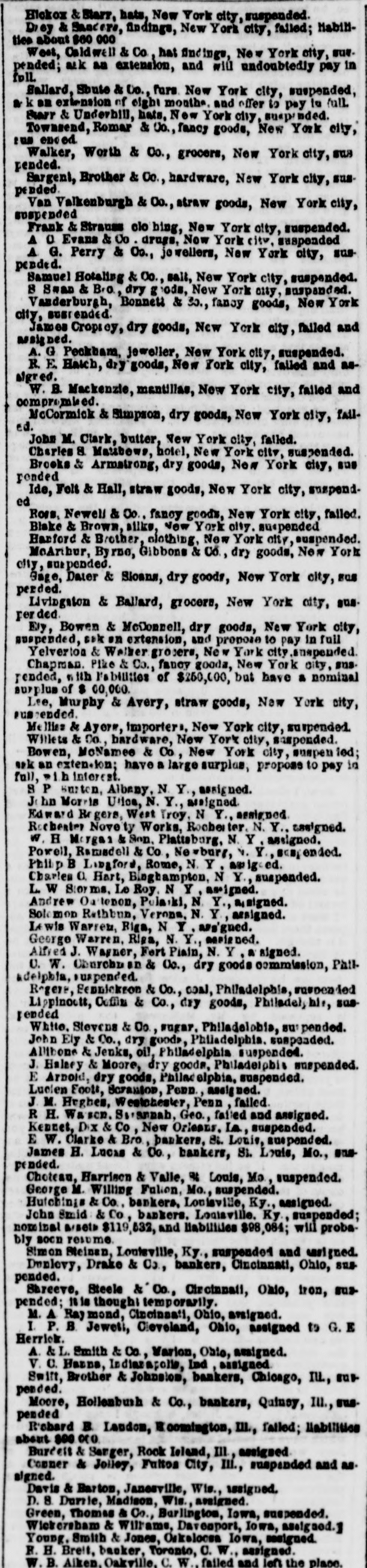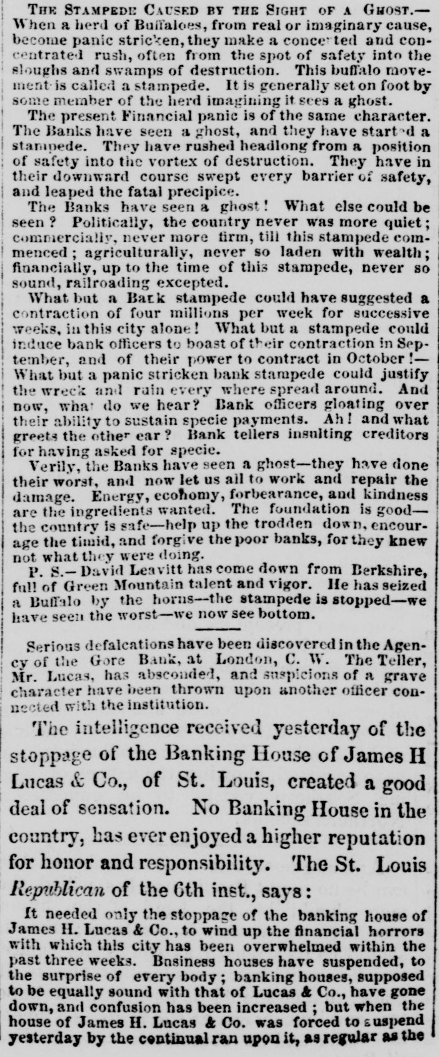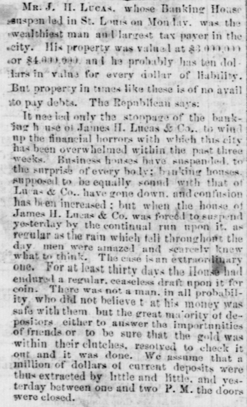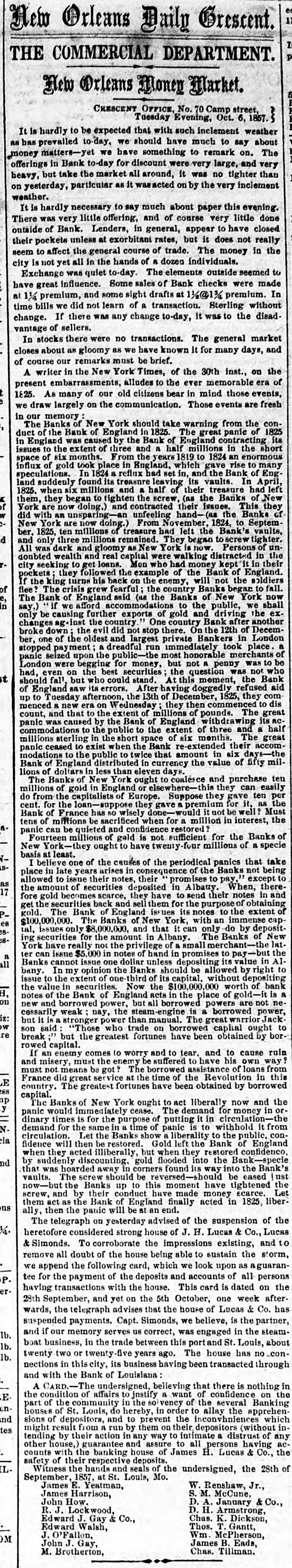 The Money Panic. WHAT WILL THE PENNSYLVANIA LEGISLATURE no HARRISBURG, Det 5, 1857. The town am med a lively appearable to-day, owing to the anival of of the Legislature. There will probably be a fu quo um of both houses in attendance to morrow morning. The Governor's message is a-aind with a great eal of anxiety Both houses will meet at 11 A M It is thought that he message will state the condition of the banks and comment on the financial embarrassments, but make no recom mendation in regard to either, leaving is to the Legislature to devise the meas. ures of relief. It is doubtful whether anything can be done for relief, M a small minority mav embarrass the majority to such an extent as to defeat heir measures. No predictions as to the result can be made THE DEMOCRATIC MEETING IN PHILADHLPHIA IN OPPOSITION TO THE LEGALIZATION OF THE BUS PENSION OF SPECIN PAYMENTS. Philadhuphia, ot 5. 1857. The meeting of the democrate in opposition to the legal ization of the suspension of specie payments was largely attended this evening, orincipally by working men Geo. L Wharton preeided, Resolutions were offered, which in substance are as follows:-That the pre ent financial em barrasoments, occurring at a period when wealth comes from all sources, overflowing and in abundance, are in consequence of over rading, imprudent investments and extravagance, which, in the opinion of this meeting, have been stimulated by improper expansions incidental to banking upon an insecure foundation; that we are in favor of the pol cy of usins metallic currency alone: that eattribute the present cerfect scundness of the affairs of the government to specie areactions; at the affairs f State and city should be similarly administered, and the treasury secarated and discounce ed from the banks as the treasury of the United States has been detaiched from such association; that le galization of be present suspension of specie paym nt by the banks would violate thefundam ntal principles of public and private mo ality, that the Legisla ure about to convens should leave the banks to the operation of existing laws, tempered by such forbearauce M the good sense of their creditors may suggest; that States should maintain a sound currency tu specie on such banks as are immediately redeomable in coin, and that no other should be panciloned; that we are on posed to bills of smaller denominations than the present; that we decomece and criminate bank presidents and directors as old fogies who shut their eyes to the interes's of the city and the State; and that we favor the adoption of the New York bank system, with the exception of the issue of small notes. Much enthusissm was caused by the mention of the name of Jackson, and the sen iments 10 spend leas; that extravagance bas been the cause of the present troubles; and that economy is the only redress, were received with applause. Although the meeting was large, it cannet be termed fail. Much dissatisfaction existed among portions of the democra , in regard to the measure Some of these, however, took part in the proceedings, in order to guard against going too far Volumary resolutions were attempted to be offered, but were overruled by the parties in power. One of the resoIntions asked the bank directors to resume specia pay ment or render a statement of their accounts to the peo. ple within thirty days. and save & pledge to vote for no man for the coming Legislature who was not-opposed to the present system of banking. the refusal to have this read caused much disturbance and confusion. Mr. Wharton, Gen. Cadwallsder and others spoke The opinions expressed were, that bank expanst na end in bankruptey and contractions shut up workshops. A riot occurred during the parade this afternoon, in the Seventeenth ward, between the mem hers of the Hibernia and Frasklin Hose companies. Three men were shot, one supposed mor ally. Another difficulty afterwards occurred down town, between the Moy amensing Hose company and the Fairmount Engine company, but nothing serious arose from it. The city bas been thronged with sirangers and firemen to-day, and this evening all places of amusement are throrged. FINANCIAL AFFAIRS IN BOSTON. BOSTON, Oct. 5, 1857. The money market, as far as the street is concerned, is unchanged. The banks have been liberal in their discounts to day, and public confidence is graduaily beingrestored. The banks paid their sem-annual dividends to-day, which are about an average of former years. Very few transactions took place in stocks, those of railroads showing the least depression. Bank shares were pressed. but there were no buyers. Rumors of heavy failures were current in the street, but only two firms, of small liabilities, are known to have suspended. The managers of the Eew England Worsted Co., of which Messrs. Lawrence, Stone & Oo, were agents, are endeavoring to make such arrangements as will enable them to continue the works at Saxonville, and thus contirue a large number of hands in their employ. Messr: Wells, Farge & Co. waived all right to day to the usual grace on seconds of drafts, received per the Star of the West, and also the sixty days notice on duplicate receipts of treasure lost in the Central America. STOPPAGE OF THE BANK OF CENTRAL NEW YOR!. UTICA, Oct. 5. 1857. The Bank of Central New York, of this city, did not open for business to-day. Thomas R. Walker has been appointed Receiver of its effects. SUSPENSION IN CINCINNATI. CINCINNATI, Ohio Oct. 5, 1887. Measrs. Dunbury, Drake & Co., bankers here, have suspended. SUSPENSION IN LOUISVILLE. LOUISVILLE, Ky, Oct. 5, 1857. W. E. Onlver, banker here, has suspended. No further failures are apprehended. FAILURE IN ST. LOUIS. Sr LOUIS, Oct 5, 1857. James H. Lucas & Co., bankers here, have closed their doors. REDEMPTION OF THE PUBLIC DEST. WASHINGTON, Oct. 5, 1857. But a few thousand dollars of public debt came to hand to day It is expected that to morrow's mall will doub: less bring a large amount CONDITION OF AFFAIR
