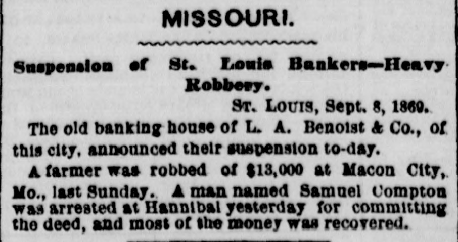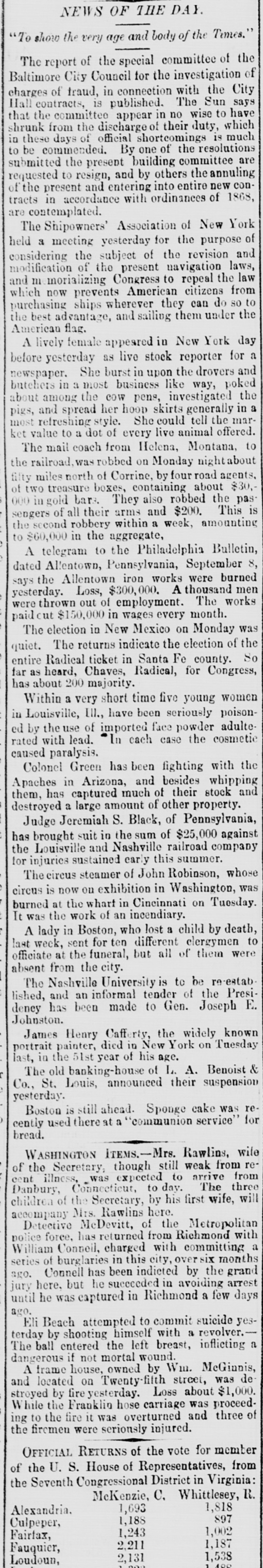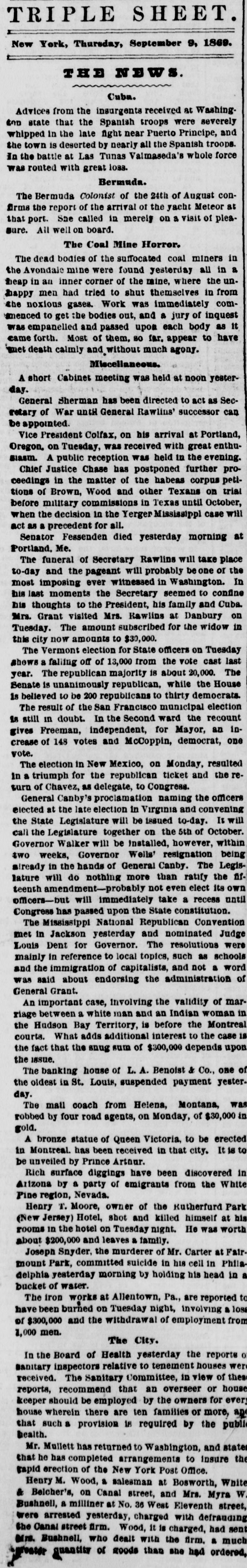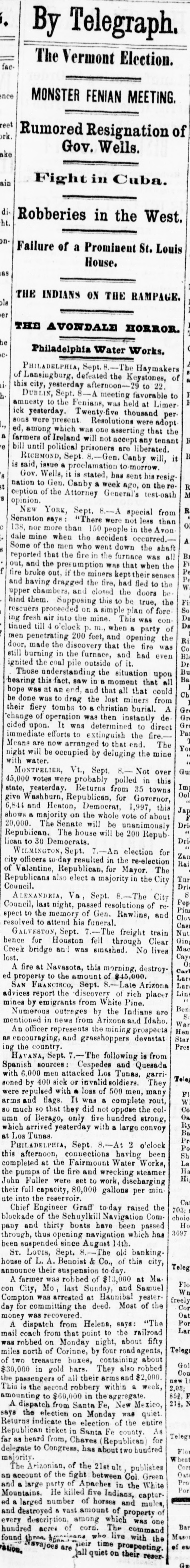 i. By Telegraph. The Vermont Election. fac nce MONSTER FENIAN MEETING. reet ork Rumored Resignation of Gov. Wells. ake ain Fight in Cuba. di ht. Robberies in the West. n Failure of a Prominent St. Louis House. as ole THE INDIANS ON THE RAMPAGE. er THE AVONDALE HORROR. he c Philadelphia Water Works. PHILADELPHIA, Sept. The Haymakers of Lansingburg, defeated the Keystones, of i this city, yeaterday afternoon- 29 to 22 DUBLIN, Sept. A meeting favorable to amnesty to the Fenians, was held at Limer ick yesterday. Twenty five thousand persons were present Resolutions were adopt 1., ed. among which was one asserting that the a farmers of Ireland will not accept any tenant e bill until political prisoners are liberated it RICHMOND, Sept. 8.-Gen. Canby will, is said, issue proclamation to morrow. Gov. Wells, it is stated. has sent his resig 's nation to Gen. Canby a week ago, on the s t ception of the Attorney General's test-oath opinion. NEW YORK, Sept. 8.--A special from Seranton says There were not less than 138, nor more than 150 people in the Avon dale mine when the accident occurred.Some of the men who went down the shaft reported that the fire in the furnace was al out, and the presumption was that when the fire broke out. if the miners kept their senses and having dragged the fire, had fled to the be upper chambers, and closed the doors hind them. Supposing this to be true, the rescuers proceede on simple plan of forc ing fresh air into the mine. This was con tinued till 'clock p. m. when party of R men penetrating 200 feet, and opening the door, made the discovery that the fire was still burning in the furnace, and had even ignited the coal pile outside of it. Bt Ba Those understanding the situation upon hearing this fact. saw in moment that all Cb hope was at end, and that all that could be done was to drag the lost miners from A Gr their fiery tombs to christian burial Gr "change of operation was then instantly de Pa cided upon. It was determined to direct immediate efforts to extinguish the fire.Yo Means are now arranged to that end. The night will be occupied by deluging the mine with water. Gu MONTPELIER, Vt., Sept. Not over Im 45,000 votes were probably polled in this Oo vesterday. Returns from 35 towns state, Washburn, Republican, for Governor, Ja 6,844 and give Heaton, Democrat, 1,997, this shows majority on the whole vote of about Dr 20,000. The Senate will be unanimously Dr Republican The house will be 200 Repub lican 30 Democrats. Za WILMINGTON, Sept. An election for Rai officers to day resulted in the re-election of city Valentine, Republican, for Mayor. The Tur Dri Republicans also elect a majority in the City Pep Council. ALEXANDRIA, Va Sept. The City Council, last night, passed resolutions of re Clo spect to the memory of Gen. Rawline, and Cas resolved to attend his funeral Nut GALVESTON, Sept. 7 The freight train Gin Ma for Houston fell through Clear Cay hence Creek bridge an was smashed. No lives Car lost. A fire at Navasota, this morning, destroy Lar Lar ed property to the amount of $45,000. Sept. 8.-- Late Arizona Lin report SAN FRANCISCO, the discovery of rich placer Be advices by emigrants from White Pine. mines Numerous outrages by the Indians are We mentioned in news from rizona and Idaho. Hen Star An officer represents the mining prospects devastat as encouraging, and grasshoppers Pret ing the country. HAYANA, Sept. 7 - Cespedes The following and Quesada is from Tele Spanish 6,000 sources men attacked Los Tunas. garriwith 400 sick or valid soldiers. They goned repulsed by with a loss of 500 men, many arms and were flags. It was a comple the rout, col80 that they did not oppose 80 much of Berago, only five hundred strong, Los Tunas umn which arrived yeaterday with a large convoy at PHILADELPHIA, Sept. At 2 o'clock been afternoon, connections having Works, completed this at the Fairmount Water steamer of the fire and wrecking the pumps Fuller were set to work, discharging John their full capacity, 80,000 gallons per min 703 ute into the reservoir Engineer Graff today raised Com the blockade Chief of the Schuylki Navigation passed 3097 and thirty boats have been which has pany through, thus opening navigation been suspended since August 14th. Louis, Sept. 8. The old banking Teleg house Sr. of L. A. Benoist & Co., of this city, announce their suspension today. Ma F A farmer was robbed of $13,000 and Samuel at City, Mo, last Sunday, yester freely con was arrested at Hannibal the Oat Compton day for committing the deed. Most of Lar money A dispatch was recovered from Helena, says: the railroad "The coach from that point to about fifty Telegt mail robbed on Monday night, road agents, miles was north of Corinne, by containing four about Go in gold two treasure boxes, bars. They also robbed $2,000 new 2.03; the $30,000 passengers of all their arms within and week, This is the second robbery 852, 211. amounting to $60,000 in the aggregate Mexico A dispatch from Santa Fe, New quiet says the electien on Monday was entire Returns indicate the election of the As for Republican ticket in Santa Fe county far as heard from, Chaves (Republican W delegate to Congress, has about two hundred majority The Arizonian, of the 21st ult publisbes account of the fight between Coi. Green Por an party of Apaches in the White and a large He killed five Indians, capturMountains. number of horses and mules, ed larged a vast amount of property of and destroyed among which was one Bar every description of corn. The command Ms hundred acrea who live with the of Navajoes es found three time prospecting ration. are jall quiet on their reser Gz