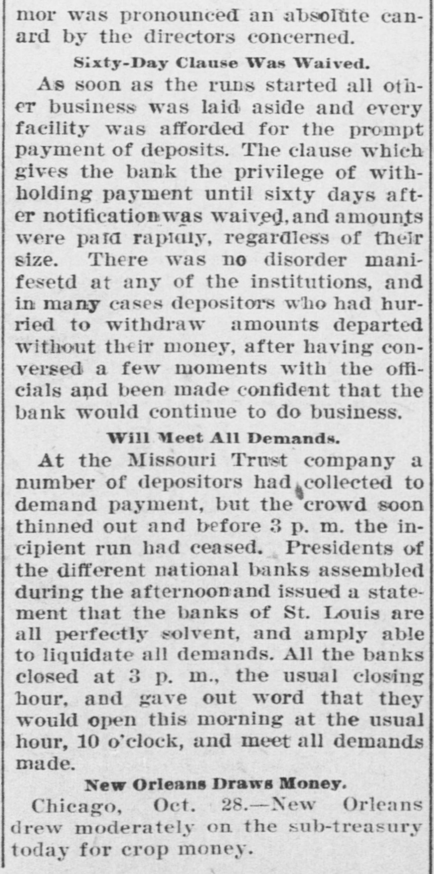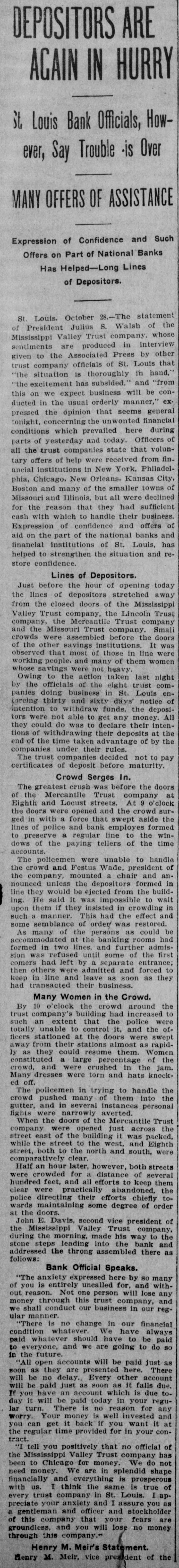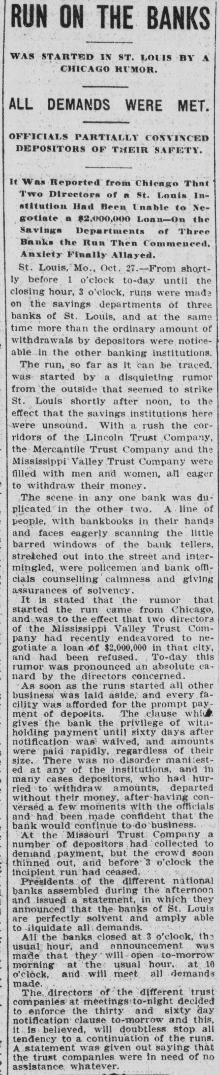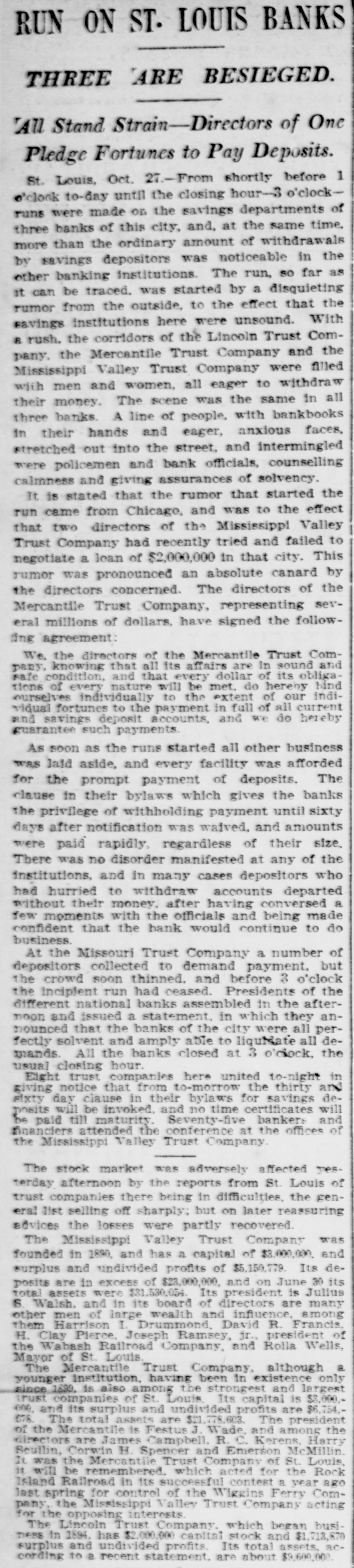 RUN ON ST. LOUIS BANKS THREE ARE BESIEGED. All Stand Strain-Directors of One Pledge Fortunes to Pay Deposits. St. Louis, Oct. 27.-From shortly before 1 o'clock to-day until the closing hour-3 o'clockruns were made on the savings departments of three banks of this city, and, at the same time. more than the ordinary amount of withdrawals by savings depositors was noticeable in the other banking institutions. The run, so far as it can be traced. was started by a disquieting rumor from the outside, to the effect that the savings institutions here were unsound. With 8 rush. the corridors of the Lincoln Trust Company. the Mercantile Trust Company and the Mississippi Valley Trust Company were filled with men and women, all eager to withdraw their money. The scene was the same in all three banks. A line of people, with bankbooks in their hands and eager, anxious faces, stretched out into the street, and intermingled were policemen and bank officials, counselling calmness and giving assurances of solvency. It is stated that the rumor that started the run came from Chicago, and was to the effect that two directors of the Mississippi Valley Trust Company had recently tried and failed to negotiate a loan of $2,000,000 in that city. This rumor was pronounced an absolute canard by the directors concerned. The directors of the Mercantile Trust Company, representing several millions of dollars. have signed the followting agreement: We. the directors of the Mercantile Trust Company. knowing that all its affairs are in sound and safe condition, and that every dollar of its obligations of every nature will be met. do hereby bind ourselves individually to the extent of our individual fortunes to the payment in full of all current and savings deposit accounts, and we do hereby guarantee such payments. As soon as the runs started all other business was laid aside, and every facility was afforded for the prompt payment of deposits. The clause in their bylaws which gives the banks the privilege of withholding payment until sixty days after notification was waived. and amounts were paid rapidly, regardless of their size. There was no disorder manifested at any of the institutions, and in many cases depositors who had hurried to withdraw accounts departed without their money. after having conversed a few moments with the officials and being made confident that the bank would continue to do business. At the Missouri Trust Company a number of depositors collected to demand payment, but the crowd soon thinned. and before 3 o'clock the incipient run had ceased. Presidents of the different national banks assembled in the afternoon and issued a statement, in which they announced that the banks of the city were all perfectly solvent and amply able to liquidate all demands. All the banks closed at 3 o'clock. the usual closing hour. Eight trust companies here united to-night in giving notice that from to-morrow the thirty and sixty day clause in their bylaws for savings deposits will be invoked. and no time certificates will be paid till maturity. Seventy-five bankers and financiers attended the conference at the offices of the Mississippi Valley Trust Company. The stock market was adversely affected yesterday afternoon by the reports from St. Louis of trust companies there being in difficulties, the general list selling off sharply; but on later reassuring advices the losses were partly recovered. The Mississippi Valley Trust Company was founded in 1890, and has a capital of $3,000,000. and surplus and undivided profits of $5,150,779 Its deposits are in excess of $23,000,000. and on June 30 its total assets were $31,530,054. Its president is Julius S Walsh. and in its board of directors are many other men of large wealth and influence, among them Harrison I Drummond David R. Francis. H. Clay Pierce, Joseph Ramsey, jr., president of the Wabash Railroad Company, and Rolla Wells, Mayor of St. Louis The Mercantile Trust Company, although a younger institution, having been in existence only since is also among the strongest and largest trust companies of St. Louis Its capital is $3,000.000, and its surplus and undivided profits are $6,754.678. The total assets are $21,778,603. The president of the Mercantile is Festus J Wade, and among the directors are James Campbell, R. C. Kerens, Harry Scullin, Corwin H Spencer and Emerson McMillin. It was the Mercantile Trust Company of St. Louis, it will be remembered. which acted for the Rock Island Railroad in its successful contest a year ago last spring for control of the Wiggins Ferry Company, the Mississippi Valley Trust Company acting for the opposing interests The Lincoln Trust Company. which began busiDESE in 1894, has $2,000,000 capital stock and $1,713,870 surplus and undivided profits Its total assets, according to a recent statement. are about $9,600 000