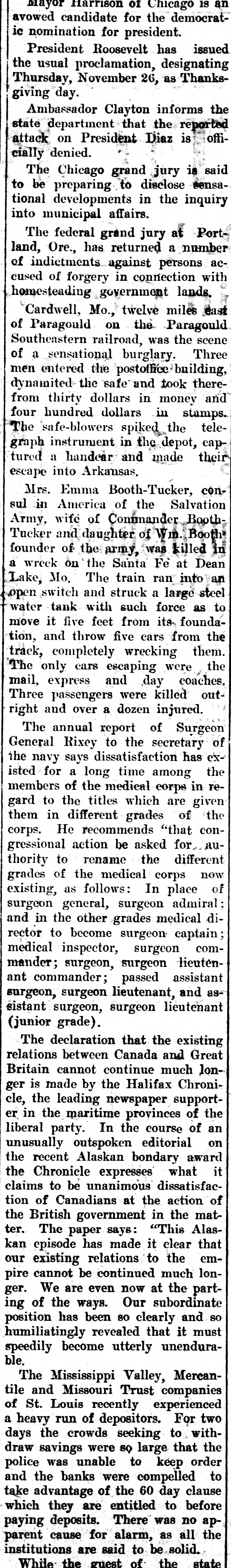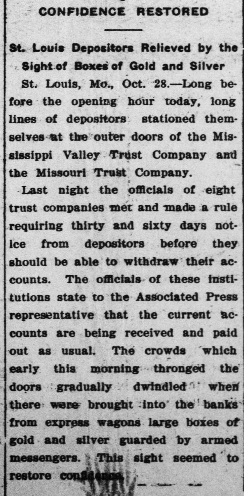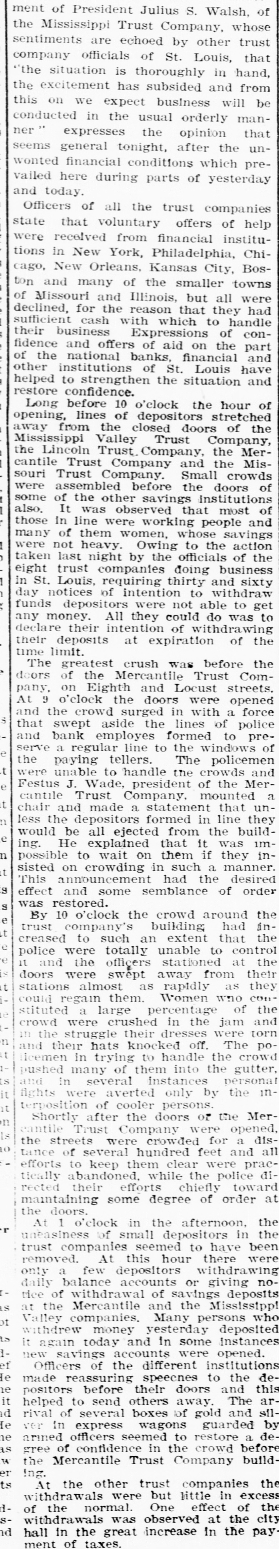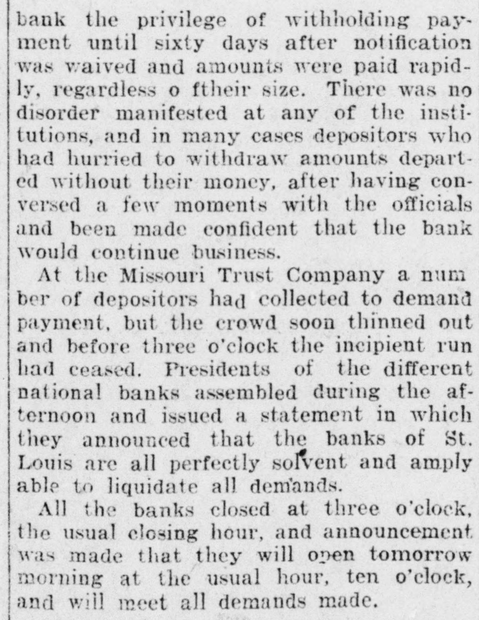 RUN ON ST. LOUIS BANKS THREE ARE BESIEGED. All Stand Strain-Directors of One Pledge Fortunes to Pay Deposits. St. Louis, Oct. 27.-From shortly before 1 o'clock to-day until the closing hour-3 o'clockruns were made on the savings departments of three banks of this city, and, at the same time. more than the ordinary amount of withdrawals by savings depositors was noticeable in the other banking institutions. The run, so far as it can be traced. was started by a disquieting rumor from the outside, to the effect that the savings institutions here were unsound. With 8 rush. the corridors of the Lincoln Trust Company. the Mercantile Trust Company and the Mississippi Valley Trust Company were filled with men and women, all eager to withdraw their money. The scene was the same in all three banks. A line of people, with bankbooks in their hands and eager, anxious faces, stretched out into the street, and intermingled were policemen and bank officials, counselling calmness and giving assurances of solvency. It is stated that the rumor that started the run came from Chicago, and was to the effect that two directors of the Mississippi Valley Trust Company had recently tried and failed to negotiate a loan of $2,000,000 in that city. This rumor was pronounced an absolute canard by the directors concerned. The directors of the Mercantile Trust Company, representing several millions of dollars. have signed the followting agreement: We. the directors of the Mercantile Trust Company. knowing that all its affairs are in sound and safe condition, and that every dollar of its obligations of every nature will be met. do hereby bind ourselves individually to the extent of our individual fortunes to the payment in full of all current and savings deposit accounts, and we do hereby guarantee such payments. As soon as the runs started all other business was laid aside, and every facility was afforded for the prompt payment of deposits. The clause in their bylaws which gives the banks the privilege of withholding payment until sixty days after notification was waived. and amounts were paid rapidly, regardless of their size. There was no disorder manifested at any of the institutions, and in many cases depositors who had hurried to withdraw accounts departed without their money. after having conversed a few moments with the officials and being made confident that the bank would continue to do business. At the Missouri Trust Company a number of depositors collected to demand payment, but the crowd soon thinned. and before 3 o'clock the incipient run had ceased. Presidents of the different national banks assembled in the afternoon and issued a statement, in which they announced that the banks of the city were all perfectly solvent and amply able to liquidate all demands. All the banks closed at 3 o'clock. the usual closing hour. Eight trust companies here united to-night in giving notice that from to-morrow the thirty and sixty day clause in their bylaws for savings deposits will be invoked. and no time certificates will be paid till maturity. Seventy-five bankers and financiers attended the conference at the offices of the Mississippi Valley Trust Company. The stock market was adversely affected yesterday afternoon by the reports from St. Louis of trust companies there being in difficulties, the general list selling off sharply; but on later reassuring advices the losses were partly recovered. The Mississippi Valley Trust Company was founded in 1890, and has a capital of $3,000,000. and surplus and undivided profits of $5,150,779 Its deposits are in excess of $23,000,000. and on June 30 its total assets were $31,530,054. Its president is Julius S Walsh. and in its board of directors are many other men of large wealth and influence, among them Harrison I Drummond David R. Francis. H. Clay Pierce, Joseph Ramsey, jr., president of the Wabash Railroad Company, and Rolla Wells, Mayor of St. Louis The Mercantile Trust Company, although a younger institution, having been in existence only since is also among the strongest and largest trust companies of St. Louis Its capital is $3,000.000, and its surplus and undivided profits are $6,754.678. The total assets are $21,778,603. The president of the Mercantile is Festus J Wade, and among the directors are James Campbell, R. C. Kerens, Harry Scullin, Corwin H Spencer and Emerson McMillin. It was the Mercantile Trust Company of St. Louis, it will be remembered. which acted for the Rock Island Railroad in its successful contest a year ago last spring for control of the Wiggins Ferry Company, the Mississippi Valley Trust Company acting for the opposing interests The Lincoln Trust Company. which began busiDESE in 1894, has $2,000,000 capital stock and $1,713,870 surplus and undivided profits Its total assets, according to a recent statement. are about $9,600 000