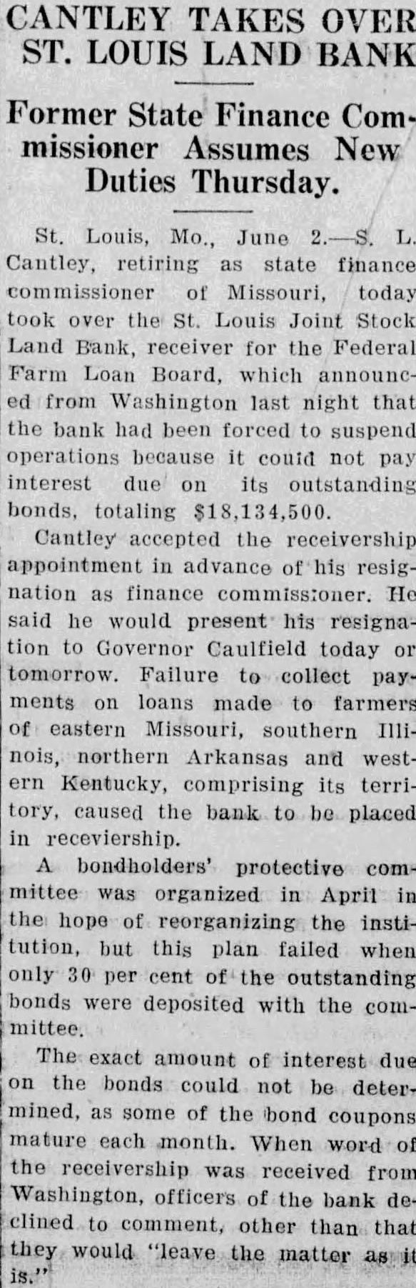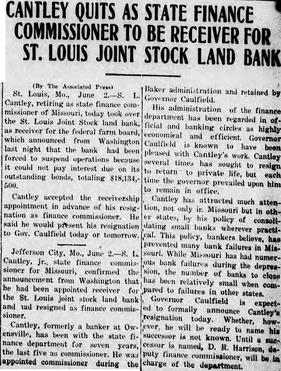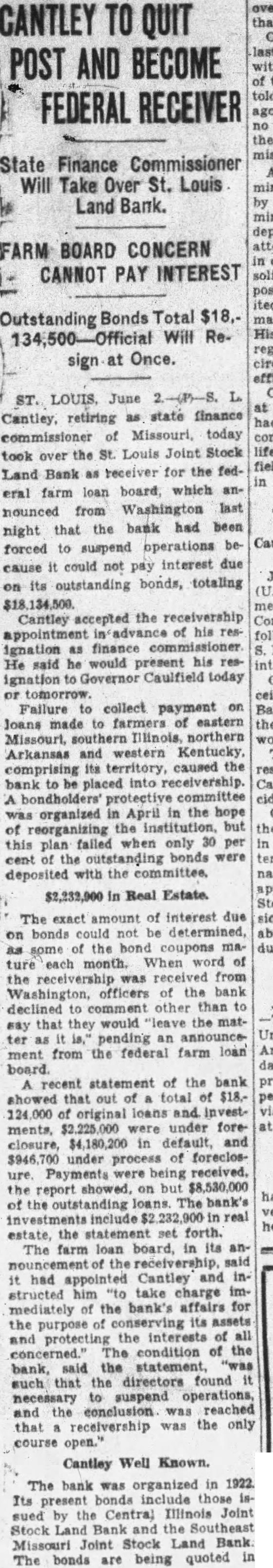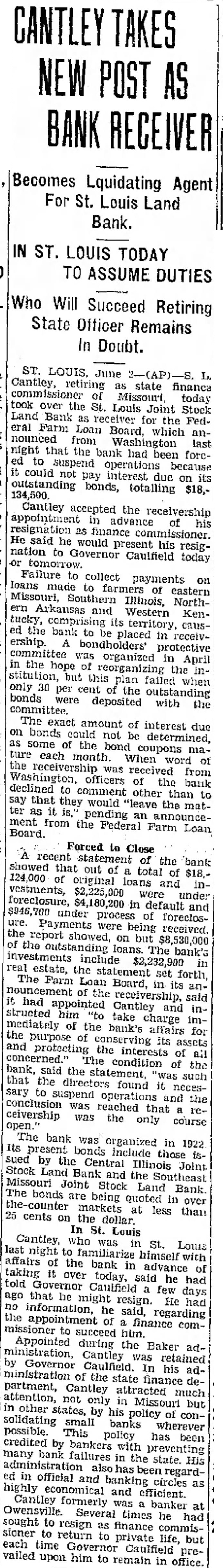 CANTLEY QUITS AS STATE FINANCE COMMISSIONER TO BE RECEIVER FOR ST. LOUIS JOINT STOCK LAND BANK (By The Associated Press) St. Louis, Mo., June 2.-S. L. Cantley, retiring as state finance commissioner of Missouri, today took over the St. Louis Joint Stock land bank, as receiver for the federal farm board, which announced from Washington last night that the bank had been forced to suspend operations because it could not pay interest due on its outstanding bonds, totaling $18,134,500. Cantley accepted the receivership appointment in advance of his resignation as finance commissioner. He said he would present his resignation to Gov. Caulfield today or tomorrow. Jefferson City, Mo., June 2.-S. L. Cantley, jr., state finance commissioner for Missouri, confirmed the announcement from Washington that he had been appointed receiver for the St. Louis joint stock land bank and had resigned as finance commissioner. Cantley, formerly a banker at Owensville, has been with the state finance department for seven years, the last five as commissioner. He was appointed commissioner during the Baker administration and retained by Governor Caulfield. His administration of the finance department has been regarded in official and banking circles as highly economical and efficient. Governor Caulfield is known to have been pleased with Cantley's work. Cantley several times has sought to resign to return to private life, but each time the governor prevailed upon him to remain in office. Cantley has attracted much attention, not only in Missouri but in other states, by his policy of consoltdating small banks wherever practical. This policy, bankers believe, has prevented many bank failures in Missouri. While Missouri has had numerous bank failures during the depression, the number of banks to close has been relatively small when compared to failures in other states. Governor Caulfield is expected to formally announce Cantley's resignation today. Whether, however, he will be ready to name his successor is not known. Until a successor is named, D. R. Harrison, deputy finance commissioner, will be in charge of the department.