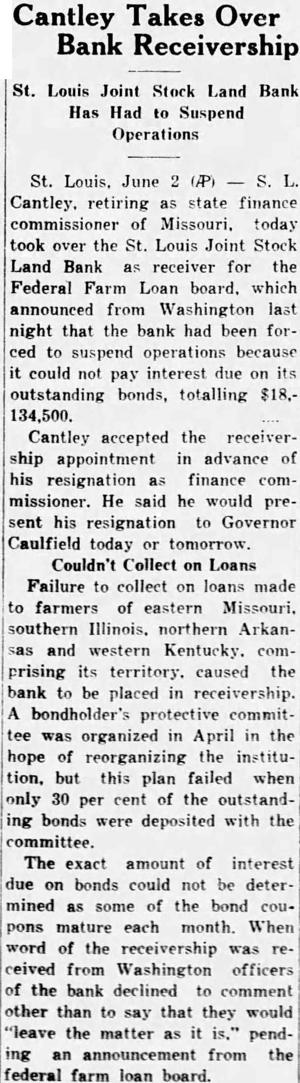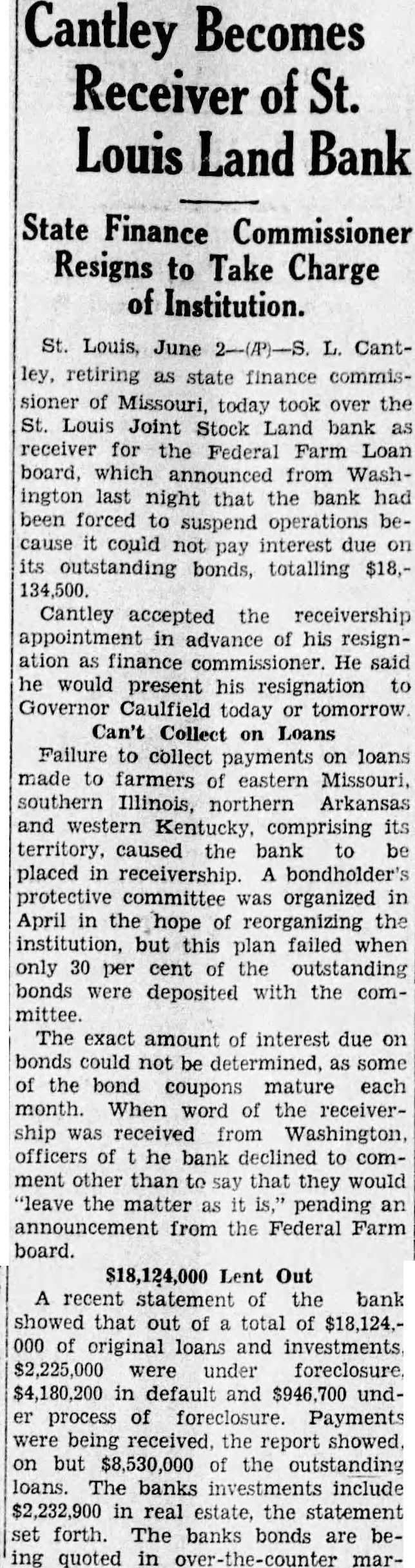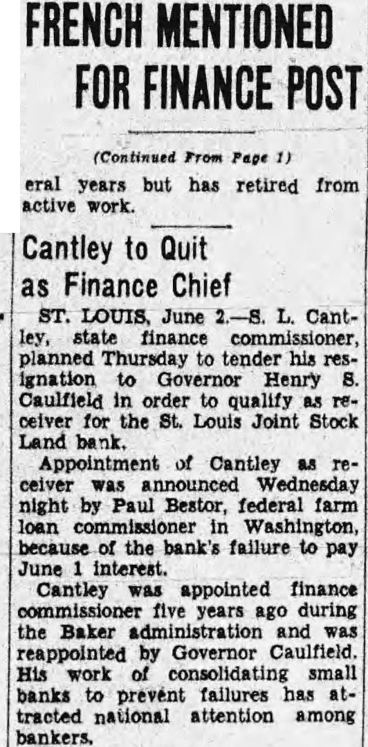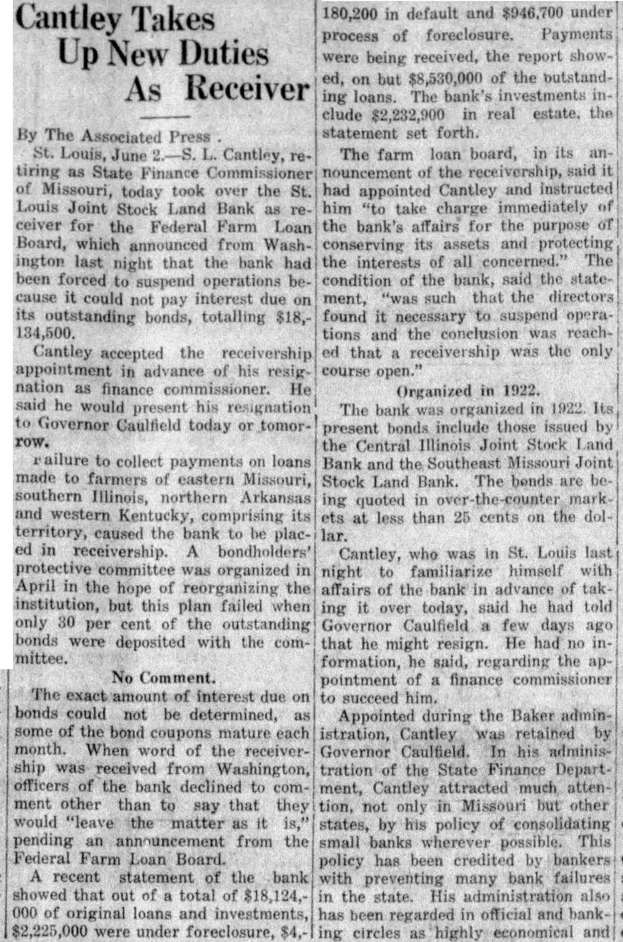 CANTLEY QUITS AS STATE FINANCE COMMISSIONER TO BE RECEIVER FOR ST. LOUIS JOINT STOCK LAND BANK (By The Associated Press) St. Louis, Mo., June 2.-S. L. Cantley, retiring as state finance commissioner of Missouri, today took over the St. Louis Joint Stock land bank, as receiver for the federal farm board, which announced from Washington last night that the bank had been forced to suspend operations because it could not pay interest due on its outstanding bonds, totaling $18,134,500. Cantley accepted the receivership appointment in advance of his resignation as finance commissioner. He said he would present his resignation to Gov. Caulfield today or tomorrow. Jefferson City, Mo., June 2.-S. L. Cantley, jr., state finance commissioner for Missouri, confirmed the announcement from Washington that he had been appointed receiver for the St. Louis joint stock land bank and had resigned as finance commissioner. Cantley, formerly a banker at Owensville, has been with the state finance department for seven years, the last five as commissioner. He was appointed commissioner during the Baker administration and retained by Governor Caulfield. His administration of the finance department has been regarded in official and banking circles as highly economical and efficient. Governor Caulfield is known to have been pleased with Cantley's work. Cantley several times has sought to resign to return to private life, but each time the governor prevailed upon him to remain in office. Cantley has attracted much attention, not only in Missouri but in other states, by his policy of consoltdating small banks wherever practical. This policy, bankers believe, has prevented many bank failures in Missouri. While Missouri has had numerous bank failures during the depression, the number of banks to close has been relatively small when compared to failures in other states. Governor Caulfield is expected to formally announce Cantley's resignation today. Whether, however, he will be ready to name his successor is not known. Until a successor is named, D. R. Harrison, deputy finance commissioner, will be in charge of the department.