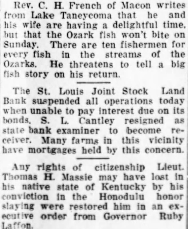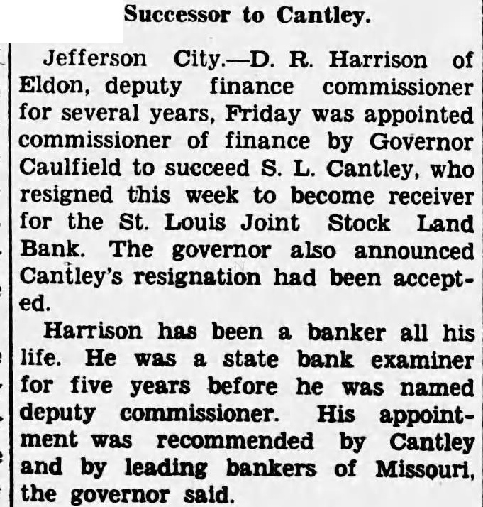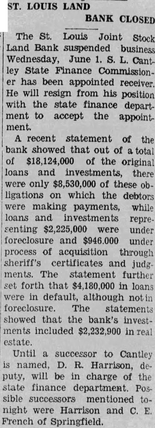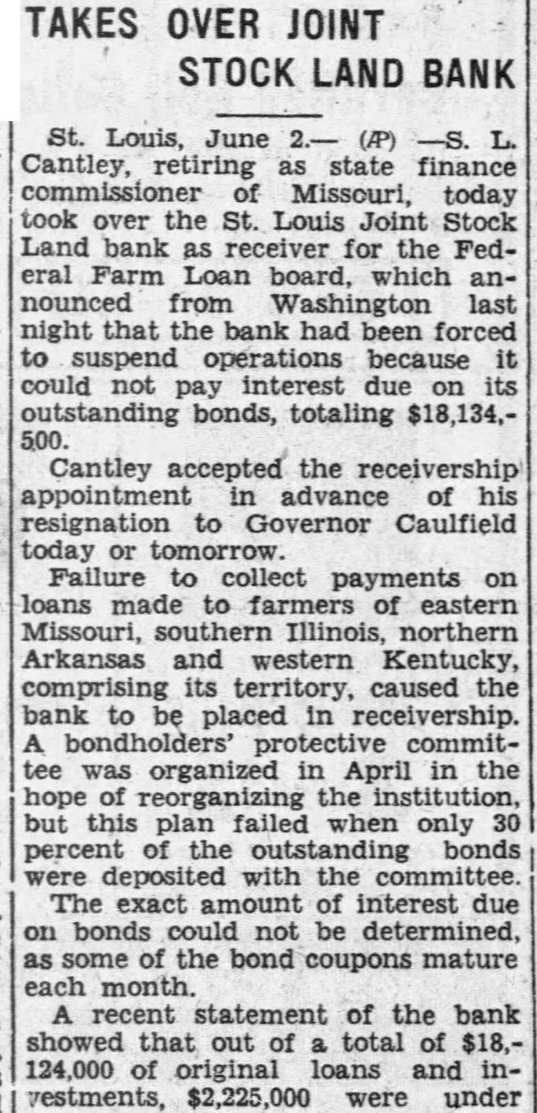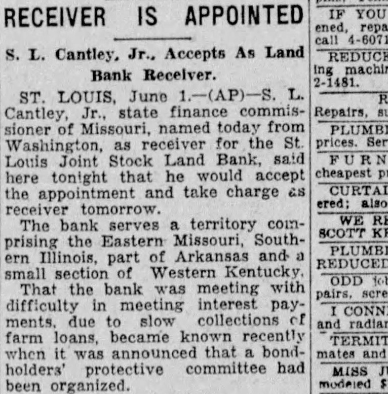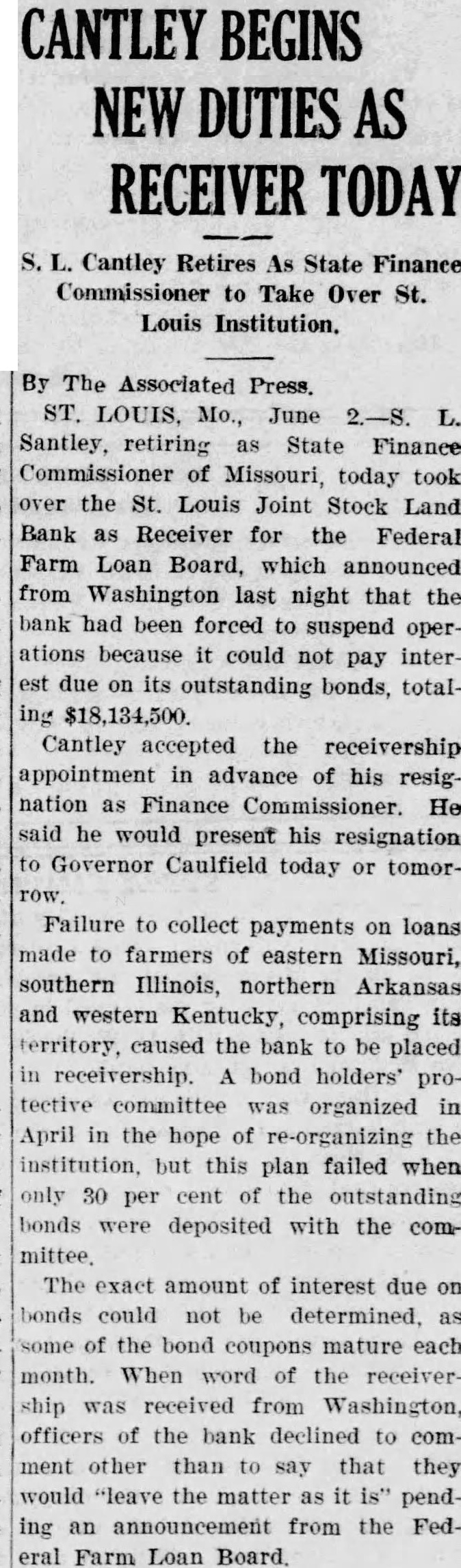 CANTLEY QUITS AS STATE FINANCE COMMISSIONER TO BE RECEIVER FOR ST. LOUIS JOINT STOCK LAND BANK (By The Associated Press) St. Louis, Mo., June 2.-S. L. Cantley, retiring as state finance commissioner of Missouri, today took over the St. Louis Joint Stock land bank, as receiver for the federal farm board, which announced from Washington last night that the bank had been forced to suspend operations because it could not pay interest due on its outstanding bonds, totaling $18,134,500. Cantley accepted the receivership appointment in advance of his resignation as finance commissioner. He said he would present his resignation to Gov. Caulfield today or tomorrow. Jefferson City, Mo., June 2.-S. L. Cantley, jr., state finance commissioner for Missouri, confirmed the announcement from Washington that he had been appointed receiver for the St. Louis joint stock land bank and had resigned as finance commissioner. Cantley, formerly a banker at Owensville, has been with the state finance department for seven years, the last five as commissioner. He was appointed commissioner during the Baker administration and retained by Governor Caulfield. His administration of the finance department has been regarded in official and banking circles as highly economical and efficient. Governor Caulfield is known to have been pleased with Cantley's work. Cantley several times has sought to resign to return to private life, but each time the governor prevailed upon him to remain in office. Cantley has attracted much attention, not only in Missouri but in other states, by his policy of consoltdating small banks wherever practical. This policy, bankers believe, has prevented many bank failures in Missouri. While Missouri has had numerous bank failures during the depression, the number of banks to close has been relatively small when compared to failures in other states. Governor Caulfield is expected to formally announce Cantley's resignation today. Whether, however, he will be ready to name his successor is not known. Until a successor is named, D. R. Harrison, deputy finance commissioner, will be in charge of the department.