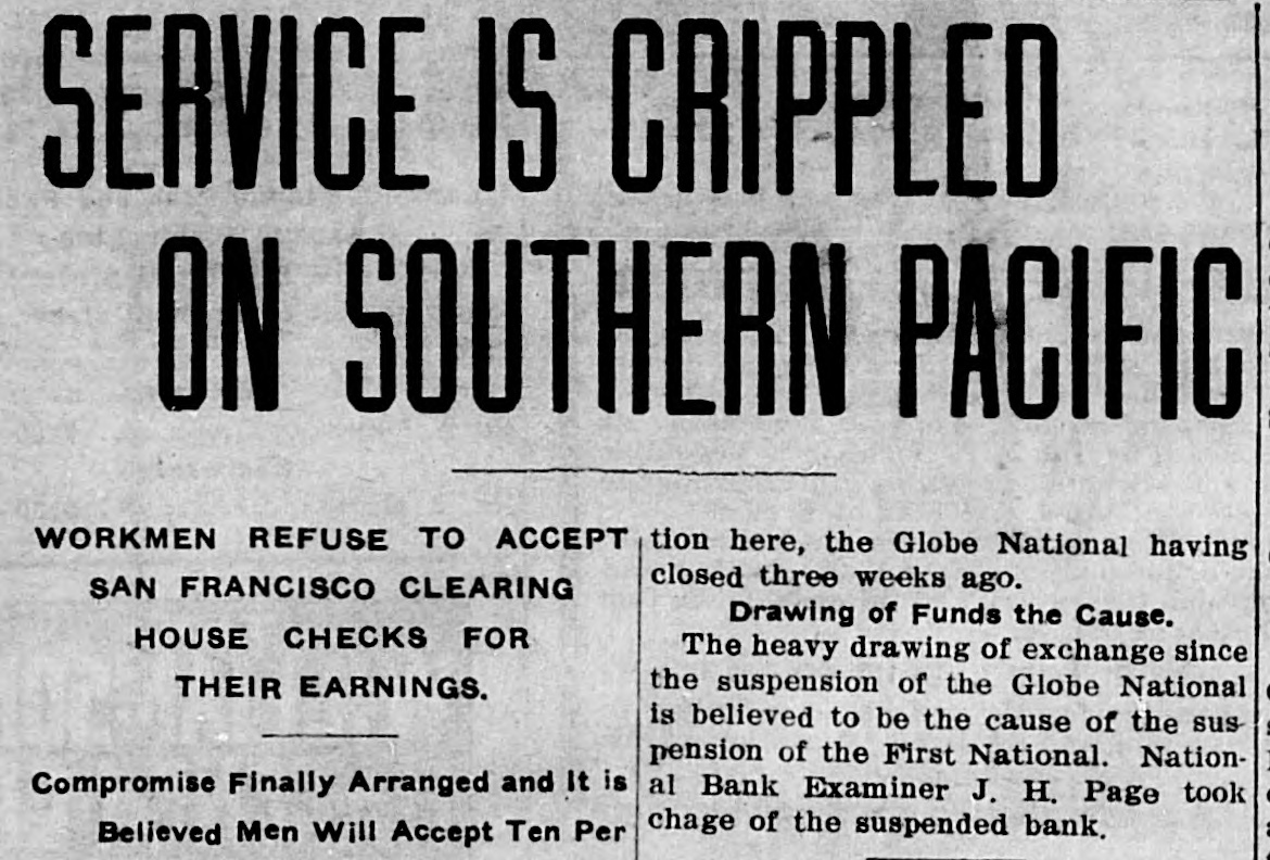 HOLIDAYS END; BANKS ARE IN GOOD CONDITION By Associated Press. SAN FRANCISCO, Dec. 23.-The period of legal holidays declared by Governor Gillett to meet the recent at financial stringency having of expired the leadmidnight last Saturday all ing banks transacted business as usual today. Normal conditions prevailed, and there was no run nor crush of peopl anywhere. Many deposits were made, and the withdrawal of funds did not exceed the ar unt customary during a day's business. Clearing house certificates continued in circulation, but when coin was required it was readily obtainable. The principal bankers unite in declaring that the financial trouble, which for a time caused some inconvenience, is a thing of the past. "The public seems perfectly quiet the and calms" said R. M. Tobin of Hibernia Savings bank, the largest savings institution in the city. "We are doing the usual Christmas business to enable the depositors to make their holiday purchases. Beyond that there are practically no requests for withdrawals. Any withdrawals made at present mean the loss of six months' interest. The situation so far as the savings banks are concerned is excellent. We are not even enforcing the rule of requiring notices of thirty to ninety days and such notices as were given during the holidays have practically all been cancelled." Certificates were generally accepted and in only a few instances was coin demanded and insisted upon. The savings banks have the protection of from thirty to ninety days' notice required for withdrawals. Beyond the drawing of small sums with which to make Christmas purchases there were few requests for withdrawals from the savings banks. Irving S. Moulton, cashier of the Bank of California, said: "Business today is normal. I have not noticed any differences between today and any Monday during the past three weeks. "So far as this bank is concerned it has met all demands made upon it for several weeks." Little Demand for Coin "There has been little or no demand from country banks for shipments of coin, which indicates that they are in good shape to take care of their business," said Cashier King of the WellsFargo Nevada National bank. I. W. Hellman, jr., vice president and manager of the Union Trust company. declared that today was the quietest Monday his Institution had experienced for several weeks. E. W. Wilson, vice president of the American National bank. said: 'Business today is about the same with us as on any Monday during the past month, with a possible improvement. As a matter of fact the balances of the clients of nearly all the banks have been growing smaller since the holidays were declared because of the inability of merchants and others to make collections. I think the financial situation in this city would have been he'ter had the holidays been declared off three weeks ago." At the First Nationau bank it was stated that owing to the scarcity of gold certificates would continue in circulation for some weeks yet, but that the smaller denominations were being rapidly retired. Demands for money were met with half coin and half in certificates. President Homer S. King of the Clearing House association in an interview said: "There is no excitement and no uneasiness. Business is going along just as it has been going on for the past month. Patrons who need gold are getting it and have been gretting it for three weeks. If we think the applicants want to hoard it they do not get it. Whenever there is a need for gold we supply it." When asked as to what action would be taken in regard to the, retirement of clearing house certificates President King said: "We are retiring the certificates gradually, but it will take some time. Just how long I can't say. No more certificates are being issued. The total amount in circulation is about $5.000,000. Everybody realizes that they are as good as gold and they find ready acceptance." "The clearances today." he said,