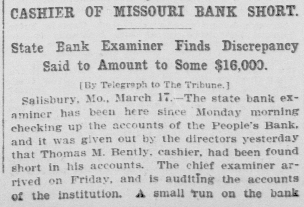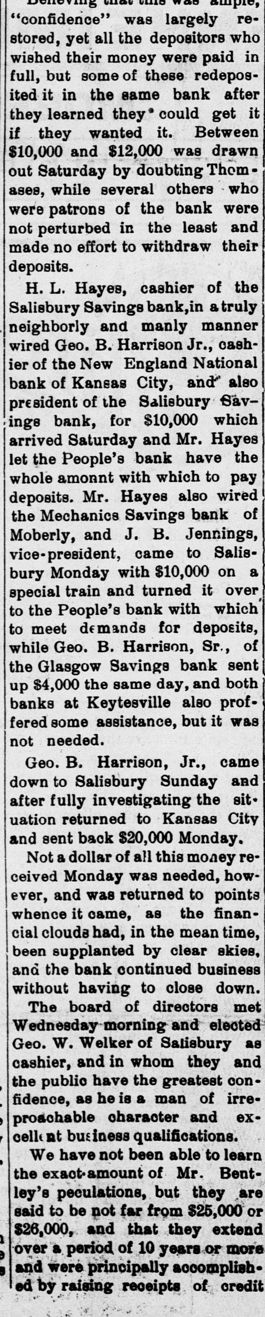 Delivering mau was ample, "confidence" was largely restored, yet all the depositors who wished their money were paid in full, but some of these redeposited it in the same bank after they learned they' could get it if they wanted it. Between $10,000 and $12,000 was drawn out Saturday by doubting Thomases, while several others who were patrons of the bank were not perturbed in the least and made no effort to withdraw their deposits. H. L. Hayes, cashier of the Salisbury Savings bank, in a truly neighborly and manly manner wired Geo. B. Harrison Jr., cashier of the New England National bank of Kansas City, and also president of the Salisbury Savings bank, for $10,000 which arrived Saturday and Mr. Hayes let the People's bank have the whole amonnt with which to pay deposits. Mr. Hayes also wired the Mechanics Savings bank of Moberly, and J. B. Jennings, vice-president, came to Salisbury Monday with $10,000 on a special train and turned it over to the People's bank with which to meet demands for deposits, while Geo. B. Harrison, Sr., of the Glasgow Savings bank sent up $4,000 the same day, and both banks at Keytesville also proffered some assistance, but it was not needed. Geo. B. Harrison, Jr., came down to Salisbury Sunday and after fully investigating the sit. uation returned to Kansas City and sent back $20,000 Monday. Not a dollar of all this money received Monday was needed, however, and was returned to points whence it came, as the financial clouds had, in the mean time, been supplanted by clear skies, and the bank continued business without having to close down. The board of directors met Wednesday morning and elected Geo. W. Welker of Salisbury as cashier, and in whom they and the public have the greatest confidence, as he is a man of irreproachable character and excell nt business qualifications. We have not been able to learn the exact amount of Mr. Bentley's peculations, but they are said to be not far from $25,000 or $26,000, and that they extend over a period of 10 years or more and were principally accomplished by raising receipts of credit