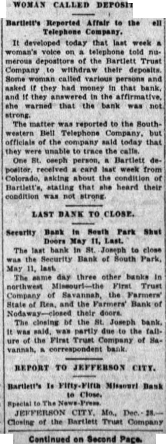 Bartlett's Reported Affair the ell Telephone Company. developed today that week telephone told numerous the Bartlett Trust Company deposits. Some asked had money that and they the she warned that the bank was not strong. The matter reported to the Southwestern Telephone Company, officials the company said today that they unable trace the calls. One oseph person, Bartlett depositor. received card last week from Colorado, asking the condition Bartlett's, stating that heard their condition strong. LAST BANK TO CLOSE. Security Bank South Park Shut Doors May Last. The last bank to the Security Bank of Park, The day three other banks First Trust Savannah, the Company and the Bank their The closing the bank. was said, partly fallure the First Trust Company of Savannah, bank. REPORT TO JEFFERSON CITY. Bartlett's Missouri Bank Mo., Closing of Bartlett Trust Company Continued on Second Page.