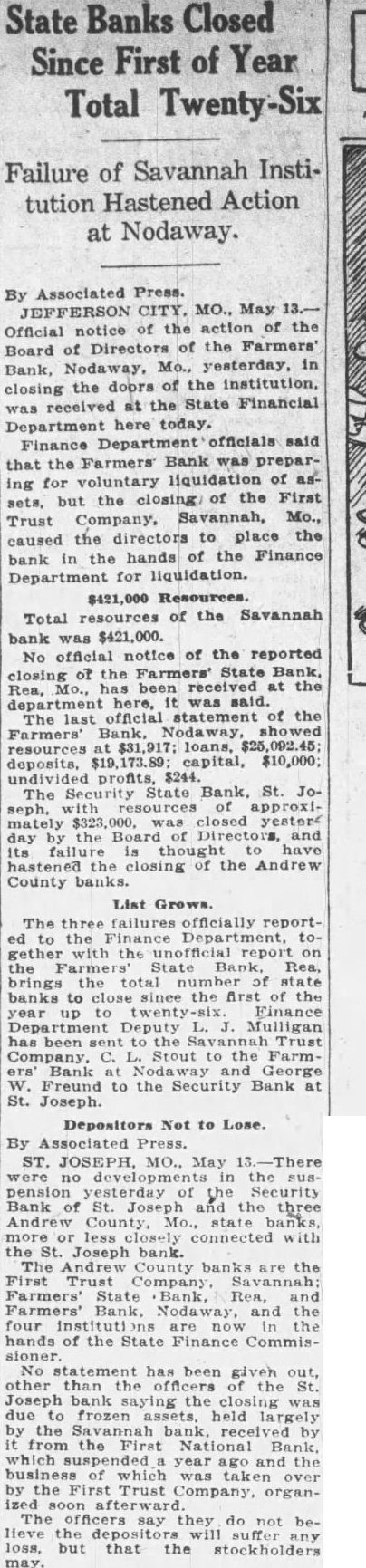 State Banks Closed Since First of Year Total Twenty-Six Failure of Savannah Institution Hastened Action at Nodaway. By Associated Press. JEFFERSON CITY. MO., May 13.Official notice of the action of the Board of Directors of the Farmers' Bank, Nodaway, Mo., yesterday, in closing the doors of the institution, was received at the State Financial Department here today. Finance Department officials said that the Farmers Bank was preparing for voluntary liquidation of assets, but the closing of the First Trust Company, Savannah, Mo., caused the directors to place the bank in the hands of the Finance Department for liquidation. $421,000 Resources. Total resources of the Savannah bank was $421,000. No official notice of the reported closing of the Farmers' State Bank, Rea, has been received at the here, was said. The last official statement of the Farmers' Bank, Nodaway, showed resources at $31,917: loans, $25, 45 deposits, $19,173.89: capital, $10,000; undivided profits, $244. The Security State Bank, St. Jo. seph, with of approximately $323,000. was closed yester day by the Board of Directors, and its failure is thought to have hastened the closing of the Andrew County banks. List Grows. The three failures officially reported to the Finance Department, together with the unofficia report the Farmers' State Bank, Rea, brings the total of state banks to close since the first of the year up to twenty-six. Finance Department Deputy L. J. Mulligan has been sent to the Trust Company. C. L. Stout to the Farmers' Bank at and George W. Freund to the Security Bank at St. Joseph. Depositors Not to Lose. By Associated Press. ST. JOSEPH, MO., May 13.-There were no developments in the suspension yesterday of the Security Bank of St. Joseph and the three Andrew County, Mo., state banks, more or less closely connected with the St. Joseph bank. The Andrew County banks are the First Trust Company Savannah: Farmers' State Bank, Rea, and Farmers' Bank, Nodaway, and the four are now the hands of the State Finance Commissioner No statement has been given out, other than the officers of the St. Joseph bank saying the closing was due to frozen assets. held largely by the Savannah bank by it from the First National Bank which suspended year ago and the business of which was taken over by the First Trust Company, organized soon afterward. The say they do not be. lieve the depositors will suffer any loss, but that the stockholders may.