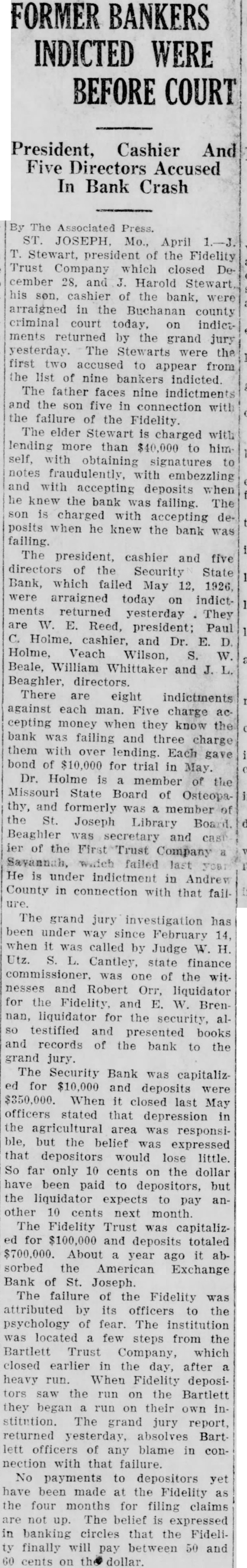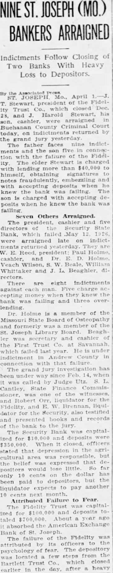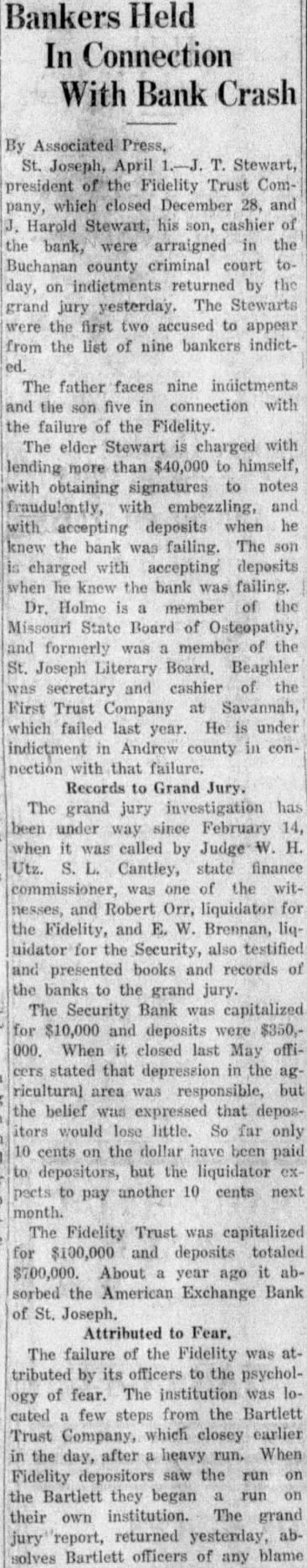 Bankers Held In Connection With Bank Crash By Associated Press. St. Joseph, April 1.-J. T. Stewart, president of the Fidelity Trust Company, which closed December 28, and J. Harold Stewart, his son, cashier of the bank, were arraigned in the Buchanan county criminal court today, on indictments returned by the grand jury yesterday. The Stewarts were the first two accused to appear from the list of nine bankers indicted. The father faces nine indictments and the son five in connection with the failure of the Fidelity. The elder Stewart is charged with lending more than $40,000 to himself, with obtaining signatures to notes fraudulently, with embezzling, and with accepting deposits when he knew the bank was failing. The son is charged with accepting deposits when he knew the bank was failing. Dr. Holme is a member of the Missouri State Board of Osteopathy, and formerly was a member of the St. Joseph Literary Board. Beaghler was secretary and cashier of the First Trust Company at Savannah, which failed last year. He is under indictment in Andrew county in connection with that failure. Records to Grand Jury. The grand jury investigation has been under way since February 14, when it was called by Judge W. H. Utz. S. L. Cantley, state finance commissioner, was one of the witnesses, and Robert Orr, liquidator for the Fidelity, and E. W. Brennan, liquidator for the Security, also testified and presented books and records of the banks to the grand jury. The Security Bank was capitalized for $10,000 and deposits were $350,000. When it closed last May officers stated that depression in the agricultural area was responsible, but the belief was expressed that depositors would lose little. So far only 10 cents on the dollar have been paid to depositors, but the liquidator expects to pay another 10 cents next The Fidelity Trust was capitalized for $100,000 and deposits totaled $700,000. About a year ago it absorbed the American Exchange Bank of St. Joseph. Attributed to Fear. The failure of the Fidelity was attributed by its officers to the psychology of fear. The institution was located a few steps from the Bartlett Trust Company, which closey earlier in the day, after a heavy run. When Fidelity depositors saw the run on the Bartlett they began a run on their own institution. The grand jury report, returned yesterday, absolves Bartlett officers of any blame
