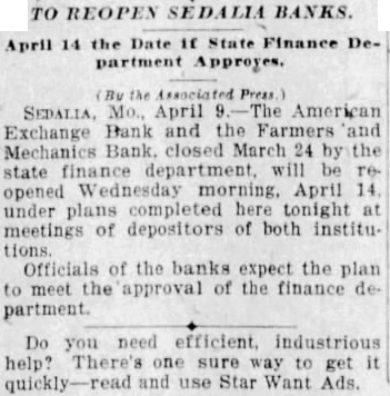 TO REOPEN April Date State Finance partment SEDALIA April American Exchange Bank and the Farmers Mechanics Bank closed March the state finance will opened Wednesday April under plans tonight meetings of depositors of both instituOfficials of the banks expect the plan meet the approval the finance partment. Do need industrious help? There's get and use Star Want Ads.