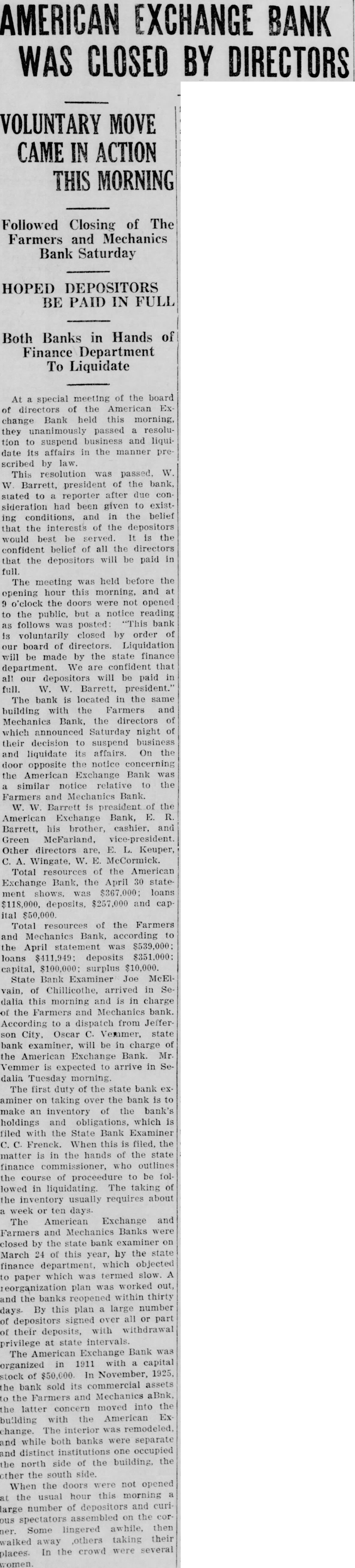 AMERICAN EXCHANGE BANK WAS CLOSED BY DIRECTORS VOLUNTARY MOVE CAME IN ACTION THIS MORNING Followed Closing of The Farmers and Mechanics Bank Saturday HOPED DEPOSITORS BE PAID IN FULL Both Banks in Hands of Finance Department To Liquidate special meeting the board directors of the American Ex change Bank held this morning, they passed resolution suspend and liquiits affairs in the manner scribed by law. This resolution was passed. W. Barrett, president of the bank, stated reporter after due consideration had been given to existand in the belief conditions, that interests of the depositors would best be served. is the confident belief of all the directors that the depositors will be paid full. The meeting was held before the opening hour this morning, and o'clock the doors were not opened the public, but notice reading follows posted bank voluntarily closed by order of board of directors. Liquidation be made by the state finance department. We are confident that all our depositors will be paid full. W. W. president.' The bank located in the same building with the Farmers and Mechanics the directors of which announced Saturday night of their decision to suspend business and liquidate its affairs. On the door opposite notice concerning the American Exchange Bank was similar notice relative to the Farmers and Mechanics Bank. Barrett president of the American Exchange Bank, Barrett, his brother, cashier, and Green vice-president. Other directors are, Keuper, Wingate, W. E. McCormick. Total resources the American Exchange Bank, the April 30 statement loans deposits, and capital $50,000. Total resources of the Farmers and Mechanics Bank, according the April statement was loans $411,949: deposits $351,000: capital, $100,000: surplus $10,000. State Bank Examiner Joe McElvain, of Chillicothe, arrived in dalia this morning and is in charge the Farmers and Mechanics bank. According to dispatch from JefferOscar state bank examiner, will be in charge of the American Exchange Bank. Mr. Vemmer expected to arrive in SeTuesday morning. The first duty of the state bank aminer taking over the bank to make inventory the bank's holdings and obligations, which filed with the State Bank Examiner Frenck. When this filed, the matter in the hands the state finance outlines the proceedure to be followed in liquidating. The taking requires about the inventory usually week days. The American Exchange and Farmers and Mechanics Banks closed by the state bank examiner on March of this year, hy the state finance department, which objected paper which was termed slow. reorganization plan worked out, and the banks reopened within thirty large number days. By this plan signed over all or part depositors with withdrawal their deposits, privilege at state intervals. The American Exchange Bank 1911 with capital organized in In November, 1925, stock of $50,000. sold its commercial assets the bank and Mechanics aBnk, to the Farmers moved into the latter concern building with the American change. The interior while both banks were separate and distinct institutions one occupied the building, the north side other the south side. the doors were not opened When usual hour this morning the number of depositors and large on the ous spectators awhile, then Some lingered ,others taking their walked away crowd were several In the places. women.
