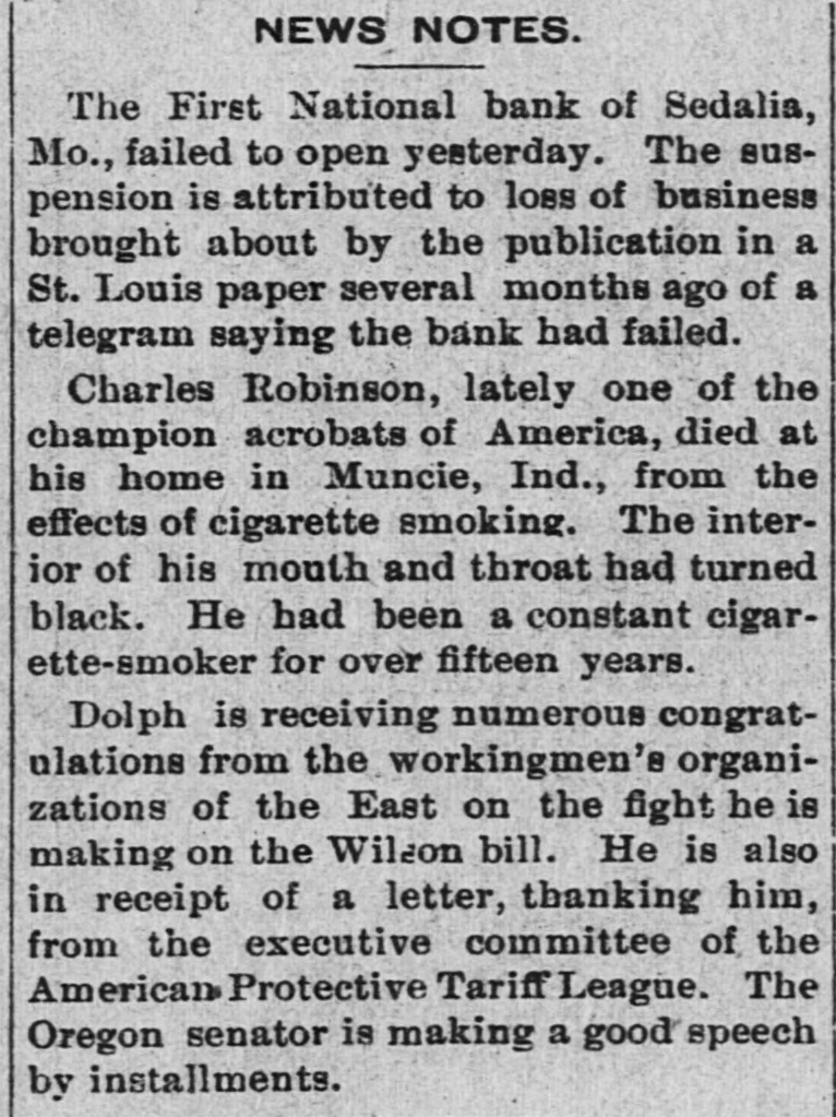 NEWS NOTES. The First National bank of Sedalia, Mo., failed to open yesterday. The suspension is attributed to loss of business brought about by the publication in a St. Louis paper several months ago of a telegram saying the bank had failed. Charles Robinson, lately one of the champion acrobats of America, died at his home in Muncie, Ind., from the effects of cigarette smoking. The interior of his mouth and throat had turned black. He had been a constant cigarette-smoker for over fifteen years. Dolph is receiving numerous congratulations from the workingmen's organizations of the East on the fight he is making on the Wilson bill. He is also in receipt of a letter, thanking him, from the executive committee of the American Protective Tariff League. The Oregon senator is making a good speech by installments.
