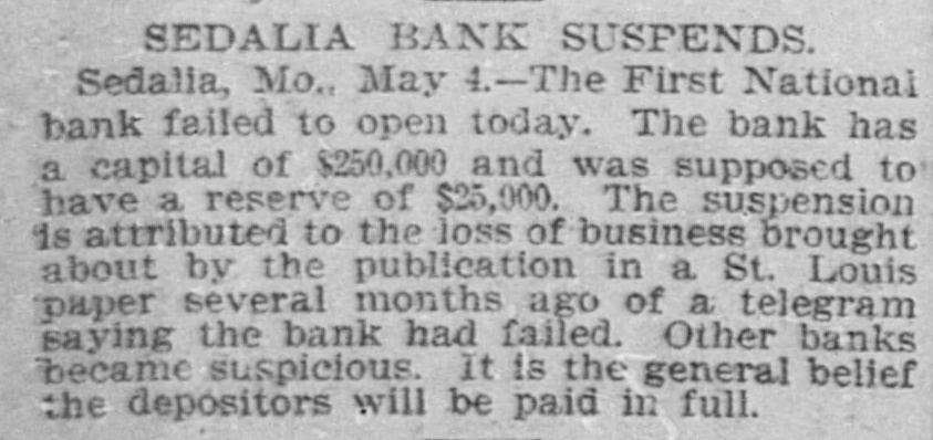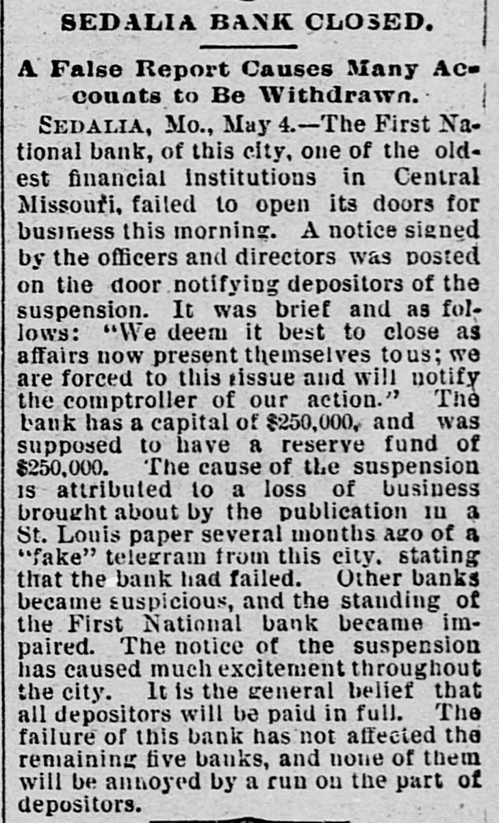 SEDALIA BANK CLOSED. A False Report Causes Many Ac⑉ counts to Be Withdrawn. SEDALIA, Mo., May 4.-The First National bank, of this city, one of the oldest financial institutions in Central Missouri, failed to open its doors for business this morning. A notice signed by the officers and directors was posted on the door notifying depositors of the suspension. It was brief and as follows: "We deem it best to close as affairs now present themselves to us; we are forced to this issue and will notify the comptroller of our action." The bank has a capital of $250,000, and was supposed to have a reserve fund of $250,000. The cause of the suspension IS attributed to a loss of business brought about by the publication 111 a St. Louis paper several months ago of a "fake" telegram from this city. stating that the bank had failed. Other banks became suspicious, and the standing of the First National bank became impaired. The notice of the suspension has caused much excitement throughout the city. It is the general belief that all depositors will be paid in full. The failure of this bank has not affected the remaining five banks, and none of them will be annoyed by a run on the part of depositors.