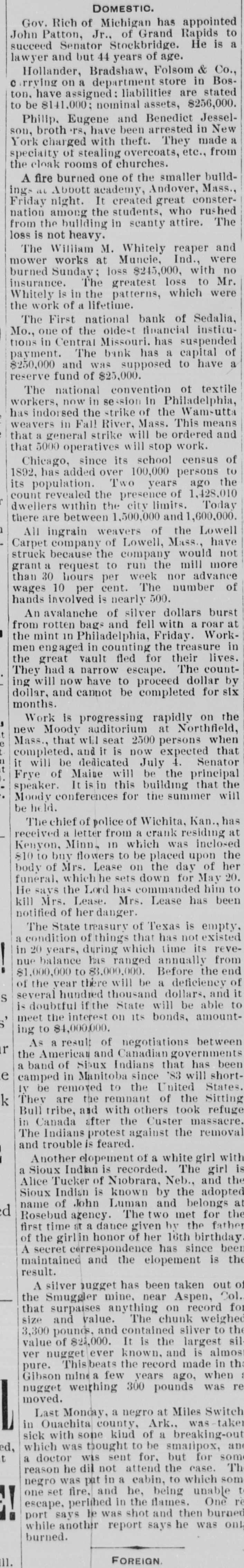 DOMESTIC. Gov. Rich of Michigan has appointed John Patton, Jr., of Grand Rapids to succeed Senator Stockbridge. He is a lawyer and but 44 years of age. Hollander, Bradshaw, Folsom & Co., c rrying on a department store in Boston. have assigned: liabilities are stated to be $141,000; nominal assets, $256,000. Philip, Eugene and Benedict Jesselson, broth 'rs, have been arrested in New York charged with theft. They made a specialty of stealing overcoats, etc., from the cloak rooms of churches. A fire burned one of the smaller buildings at Aboott academy, Andover, Mass., Friday night. It created great consternation among the students, who rushed from the building in scanty attire. The loss is not heavy. The William M. Whitely reaper and mower works at Muncie, Ind., were burned Sunday loss $245,000, with no insurance. The greatest loss to Mr. Whitely is in the patterns, which were the work of a lifetime. The First national bank of Sedalia, Mo., one of the oldest financial insticutions in Central Missouri. has suspended payment. The bank has a capital of $250,000 and was supposed to have a reserve fund of $25,000. The national convention of textile workers, now in session in Philadelphia, has indorsed the strike of the Wamsutta weavers in Fall River, Mass. This means that a general strike will be ordered and that 5000 operatives will stop work. Chicago, since its school census of 1892, has added over 100,000 persons to its population. Two years ago the count revealed the presence of 1,428,010 dwellers within the city limits. Today there are between 1,500,000 and 1,600,000. All ingrain weavers of the Lowell Carpet company of Lowell, Mass., have struck because the company would not grant a request to run the mill more than 30 hours per week nor advance wages 10 per cent. The number of hands involved is nearly 500. An avalanche of silver dollars burst from rotten bags and fell with a roar at the mint in Philadelphia, Friday. Workmen engaged in counting the treasure in the great vault fled for their lives. They had a narrow escape. The counting will now have to proceed dollar by dollar, months. and cannot be completed for six Work is progressing rapidly on the new Moody auditorium at Northfield, Mass., that will seat 2500 persons when completed. and it is now expected that it will be dedicated July 4. Senator Frye of Maine will be the principal speaker. It is in this building that the Moody conferences for the summer will be he Id. The chief of police of Wichita, Kan., has received a letter from a crank residing at Kenyon, Minn, in which was inclosed $10 to buy flowers to be placed upon the body of Mrs. Lease on the day of her funeral, which he sets down for May 20. He savs the Lord has commanded him to kill Mrs. Lease. Mrs. Lease has been notified of her danger. The State treasury of Texas is empty, a condition of things that has not existed in 20 years, during which time its revenue balance has ranged annually from $1,000,000 to $3,000,000. Before the end of the year there will be a deficiency of S several hundred thousand dollars, and it is doubtful if the State will be able to meet the interest on its bonds, amounting to $4,000,000. As a result of negotiations between r the American and Canadian governments a band of Sioux Indians that has been e camped in Manitoba since '83 will short1v be removed to the United States. k They are the remnant of the Sitting Bull tribe, and with others took refuge in Canada after the Custer massacre. The Indians protest against the removal and trouble is feared. Another elopement of a white girl with a Sioux Indian is recorded. The girl is Alice Tucker of Niobrara, Neb., and the Sioux Indian is known by the adopted name of John Luman and belongs at d Rosebud agency. The two met for the first time at a dance given by the father of the girlin honor of her 16th birthday A secret correspondence has since been maintained and the elopement is the result. A silver jugget has been taken out of the Smuggler mine, near Aspen, Col. that surpaises anything on record for size and value. The chunk weighed 3,300 pounds, and contained silver to the value of $21,000. It is the largest sil ver nugget|ever known, and is almos pure. This beats the record made in the Gibson mine a few years ago, when nugget weighing 300 pounds was re moved. Last Monday, a negro at Miles Switch in Quachita county, Ark., was-take sick with some kind of a breaking-out d, which was thought to be smallpox, and t a doctor wis sent for, but for some reason he dil not attend the case. The negro was pat in a cabin, to which som one set fire, and he, being unable escape, perished in the flames. One re port says le was shot and then burned burned. while another report says he was onl FOREIGN 11.