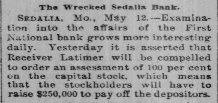 The Wrecked Sedalia Bank. SEDALIA, Mo., May 12.-Examination into the affairs of the First National bank grows more interesting daily. Yesterday it is asserted that Receiver Latimer will be compelled to order an assessment of 100 per cent on the capital stock, which means that the stockholders will have to raise $250,000 to pay off the depositors.