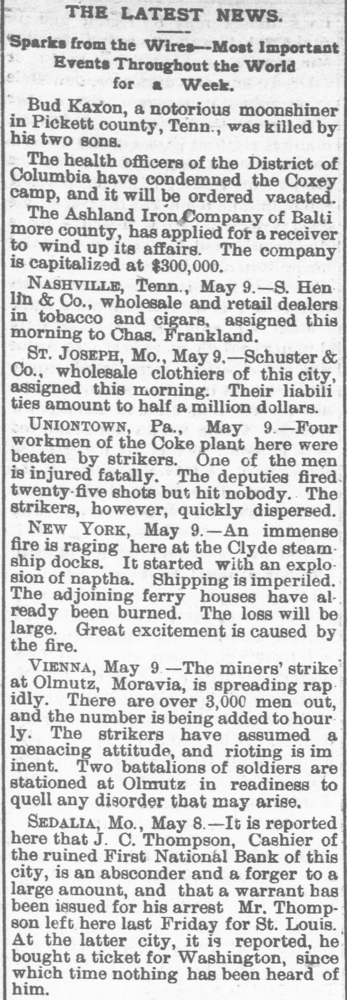 THE LATEST NEWS. Sparks from the Wires--Most Important Events Throughout the World for a Week. Bud Kaxon, a notorious moonshiner in Pickett county, Tenn., was killed by his two sons. The health officers of the District of Columbia have condemned the Coxey camp, and it will be ordered vacated. The Ashland Iron Company of Balti more county, has applied for a receiver to wind up its affairs. The company is capitalized at $300,000. NASHVILLE, Tenn., May 9.-S. Hen lin & Co., wholesale and retail dealers in tobacco and cigars, assigned this morning to Chas. Frankland. ST. JOSEPH, Mo., May 9.-Schuster & Co., wholesale clothiers of this city, assigned this morning. Their liabili ties amount to half a million dollars. UNIONTOWN, Pa., May 9.-Four workmen of the Coke plant here were beaten by strikers. One of the men is injured fatally. The deputies fired twenty-five shots but hit nobody. The strikers, however, quickly dispersed. NEW YORK, May 9.-An immense fire is raging here at the Clyde steamship docks. It started with an explosion of naptha. Shipping is imperiled. The adjoining ferry houses have already been burned. The loss will be large. Great excitement is caused by the fire. VIENNA, May 9 -The miners' strike at Olmutz, Moravia, is spreading rap idly. There are over 3,000 men out, and the number is being added to hour ly. The strikers have assumed a menacing attitude, and rioting is im inent. Two battalions of soldiers are stationed at Olmutz in readiness to quell any disorder that may arise. Sedalia, Mo., May 8.-It is reported here that J. C. Thompson, Cashier of the ruined First National Bank of this city, is an absconder and a forger to a large amount, and that a warrant has been issued for his arrest Mr. Thompson left here last Friday for St. Louis. At the latter city, it is reported, he bought a ticket for Washington, since which time nothing has been heard of him.