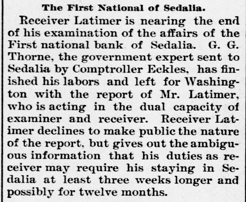 # THE FIRST NATIONAL OF SEDALIA. Receiver Latimer is nearing the end of his examination of the affairs of the First national bank of Sedalia. G. G. Thorne, the government expert sent to Sedalia by Comptroller Eckles, has finished his labors and left for Washington with the report of Mr. Latimer, who is acting in the dual capacity of examiner and receiver. Receiver Latimer declines to make public the nature of the report, but gives out the ambiguous information that his duties as receiver may require his staying in Sedalia at least three weeks longer and possibly for twelve months.