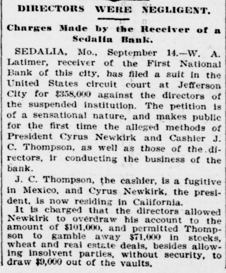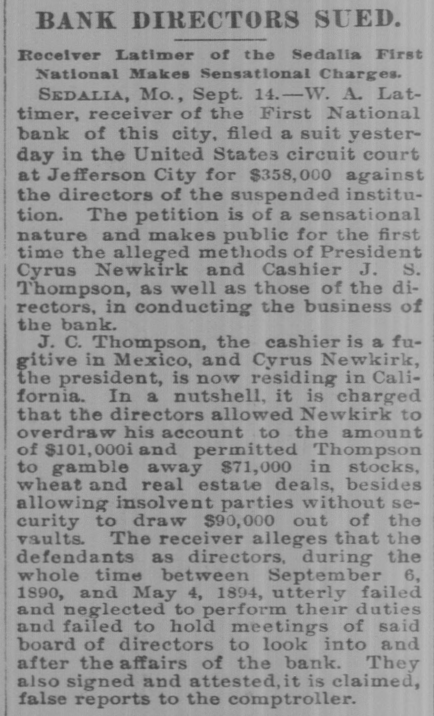 BANK DIRECTORS SUED. Receiver Latimer of the Sedalia First National Makes Sensational Charges. SEDALIA, Mo., Sept. 14.-W. A. Lattimer, receiver of the First National bank of this city, filed a suit yesterday in the United States circuit court at Jefferson City for $358,000 against the directors of the suspended institution. The petition is of a sensational nature and makes public for the first time the alleged methods of President Cyrus Newkirk and Cashier J. S. Thompson, as well as those of the directors, in conducting the business of the bank. J. C. Thompson, the cashier is a fugitive in Mexico, and Cyrus Newkirk, the president, is now residing in California. In a nutshell, it is charged that the directors allowed Newkirk to overdraw his account to the amount of $101,000iand permitted Thompson to gamble away $71,000 in stocks, wheat and real estate deals, besides allowing insolvent parties without security to draw $90,000 out of the vaults. The receiver alleges that the defendants as directors, during the whole time between September 6, 1890, and May 4, 1894, utterly failed and neglected to perform their duties and failed to hold meetings of said board of directors to look into and after the affairs of the bank. They also signed and attested, it is claimed, false reports to the comptroller.