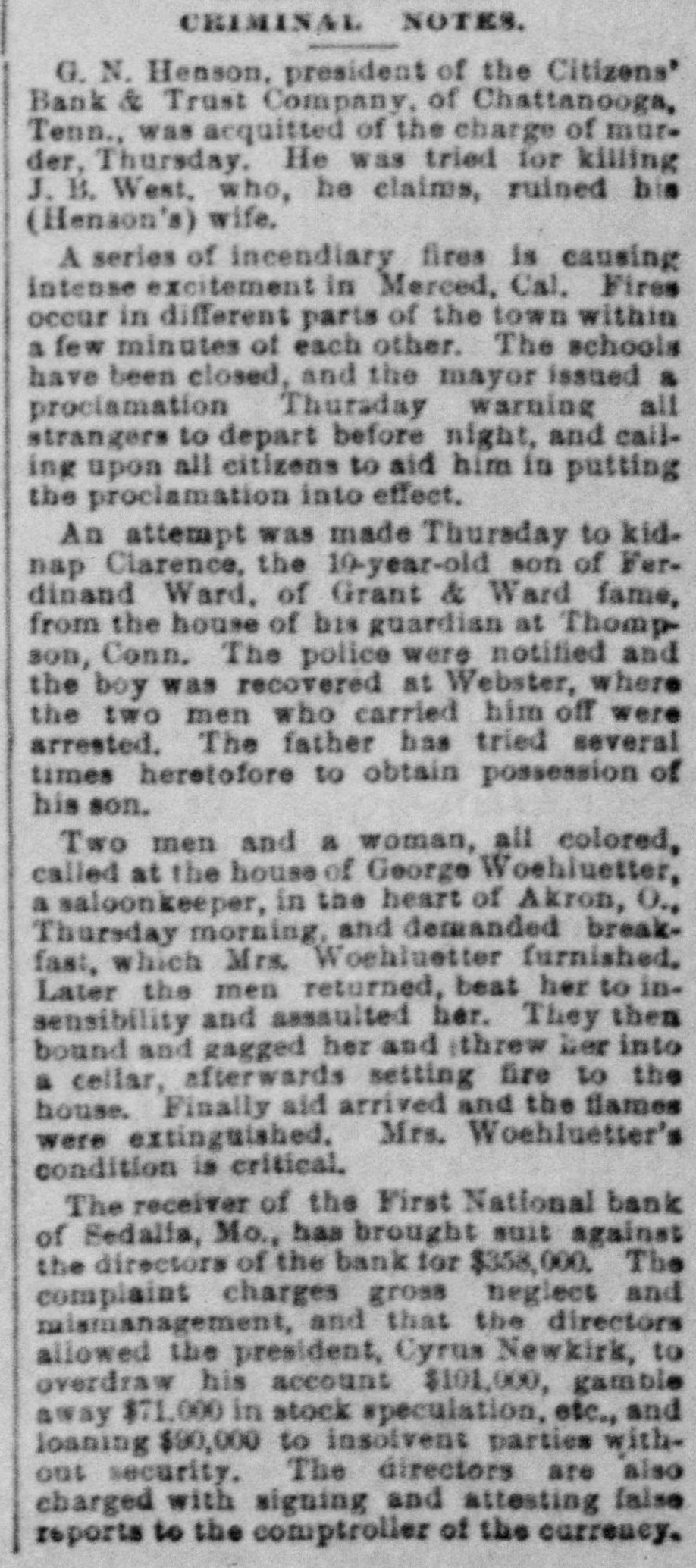 CRIMINAL NOTES. G. N. Henson, president of the Citizens' Bank & Trust Company, of Chattanooga, Tenn., was acquitted of the charge of murder, Thursday. He was tried for killing J. B. West, who, he claims, ruined his (Henson's) wife, A series of incendiary fires is causing intense excitement in Merced, Cal. Fires occur in different parts of the town within a few minutes of each other. The schools have been closed, and the mayor issued & prociamation Thursday warning all strangers to depart before night, and calling upon all citizens to aid him in putting the proclamation into effect. An attempt was made Thursday to kidnap Clarence, the 10-year-old son of Ferdinand Ward, of Grant & Ward fame, from the house of bis guardian at Thompson, Conn. The police were notified and the boy was recovered at Webster, where the two men who carried him off were arrested. The father has tried several times heretofore to obtain possession of his son. Two men and a woman, all colored, called at the house of George Woehluetter, a saloonkeeper, in the heart of Akron, O., Thursday morning, and demanded breakfast, which Mrs. Woshluetter furnished. Later the men returned, beat her to insensibility and asssulted her. They then bound and gagged her and (threw her into a cellar, afterwards setting fire to the house. Finally aid arrived and the flames were extinguished, Mrs. Woehluetter's condition is critical. The receiver of the First National bank of Sedalia, Mo., has brought suit against the directors of the bank for $358,000. The complaint charges gross neglect and mismanagement, and that the directors allowed the president, Cyrus Newkirk, to overdraw his account $101,000, gamble away $71,000 in stock speculation, etc., and loaning $90,000 to insolvent parties without security. The directors are also charged with signing and attesting false reports to the comptroller of the currency.
