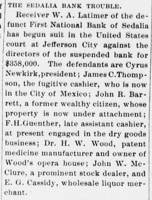 THE SEDALIA BANK TROUBLE. f Receiver W. A. Latimer of the defunct First National Bank of Sedalia has begun suit in the United States court at Jefferson City against the directors of the suspended bank for $358,000. The defendants are Cyrus Newkirk,president; James C.Thompson, the fugitive cashier, who is now in the City of Mexico; John R. Barrett, a former wealthy citizen, whose property is now under attachment; F.H.Guenther, late assistant cashier, at present engaged in the dry goods business; Dr. H. W. Wood, patent medicine manufacturer and owner of Wood's opera house; John W. McClure, a prominent stock dealer, and E. G. Cassidy, wholesale liquor merchant.