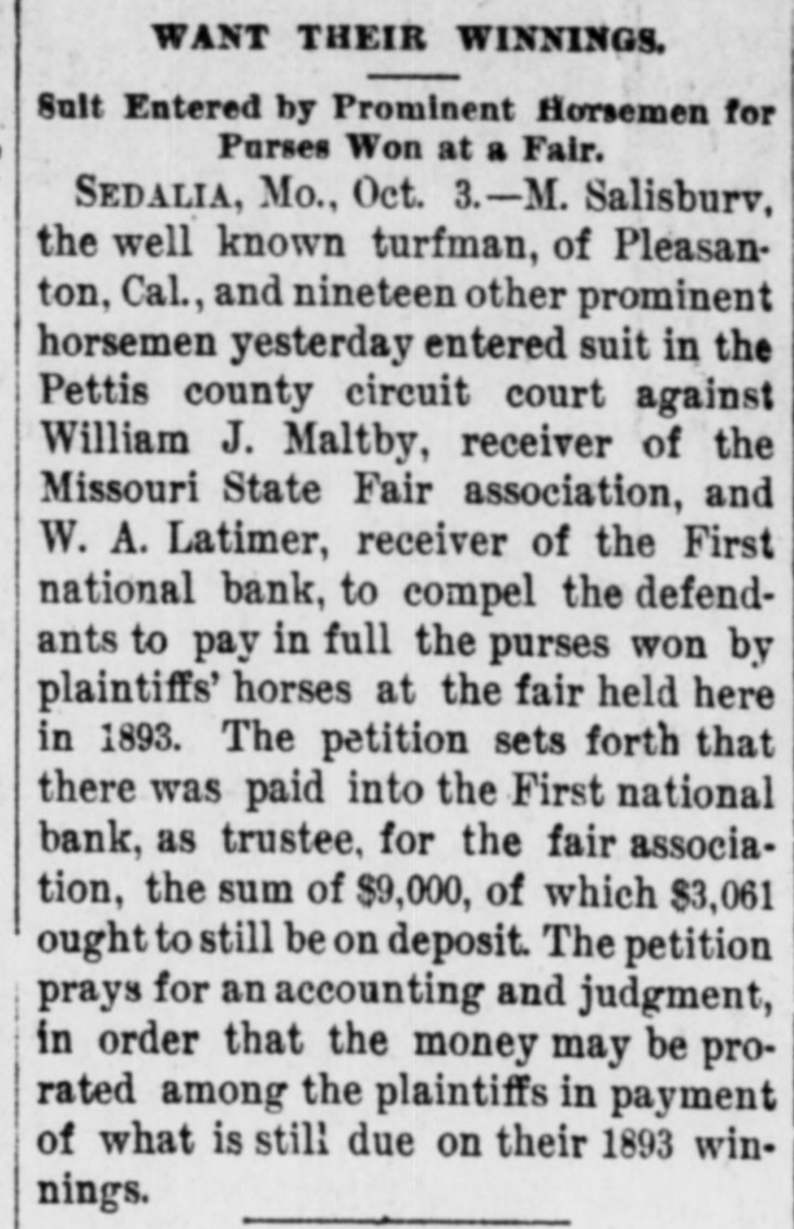 WANT THEIR WINNINGS, Sult Entered by Prominent Horsemen for Purses Won at a Fair. SEDALIA, Mo., Oct. 3.-M. Salisburv, the well known turfman, of Pleasanton, Cal., and nineteen other prominent horsemen yesterday entered suit in the Pettis county circuit court against William J. Maltby, receiver of the Missouri State Fair association, and W. A. Latimer, receiver of the First national bank, to compel the defendants to pay in full the purses won by plaintiffs' horses at the fair held here in 1893. The petition sets forth that there was paid into the First national bank, as trustee, for the fair association, the sum of $9,000, of which $3,061 ought to still be on deposit. The petition prays for an accounting and judgment, in order that the money may be prorated among the plaintiffs in payment of what is still due on their 1893 winnings.