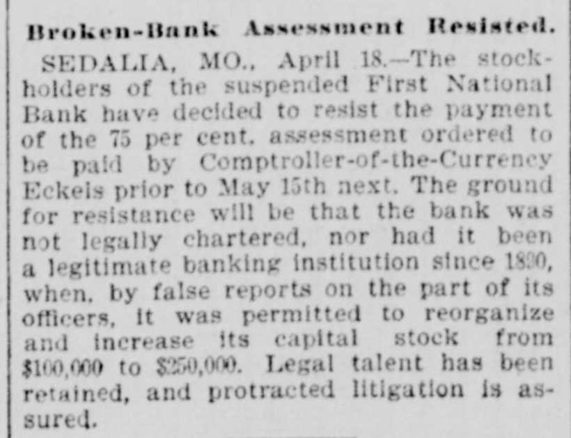 Broken-Bank Assessment Resisted. SEDALIA, MO., April 18.-The stockholders of the suspended First National Bank have decided to resist the payment of the 75 per cent. assessment ordered to be paid by Comptroller-of-the-Currency Eckels prior to May 15th next. The ground for resistance will be that the bank was not legally chartered, nor had it been a legitimate banking institution since 1830, when, by false reports on the part of its officers, it was permitted to reorganize and increase its capital stock from $100,000 to $250,000. Legal talent has been retained, and protracted litigation is assured.