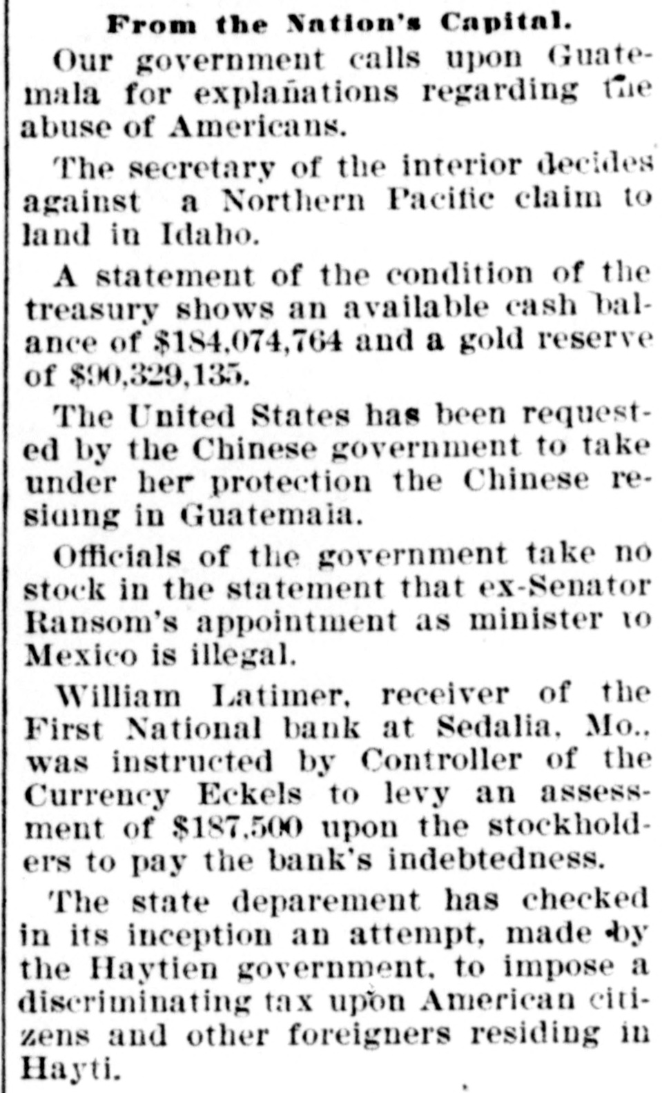 From the Nation's Capital. Our government calls upon Guatemala for explanations regarding the abuse of Americans. The secretary of the interior decides against a Northern Pacific claim to land in Idaho. A statement of the condition of the treasury shows an available cash balance of $184,074,764 and a gold reserve of $90,329,135. The United States has been requested by the Chinese government to take under her protection the Chinese residing in Guatemala. Officials of the government take no stock in the statement that ex-Senator Ransom's appointment as minister to Mexico is illegal. William Latimer, receiver of the First National bank at Sedalia, Mo., was instructed by Controller of the Currency Eckels to levy an assessment of $187,500 upon the stockholders to pay the bank's indebtedness. The state deparement has checked in its inception an attempt, made by the Haytien government, to impose a discriminating tax upon American citizens and other foreigners residing in Hayti.