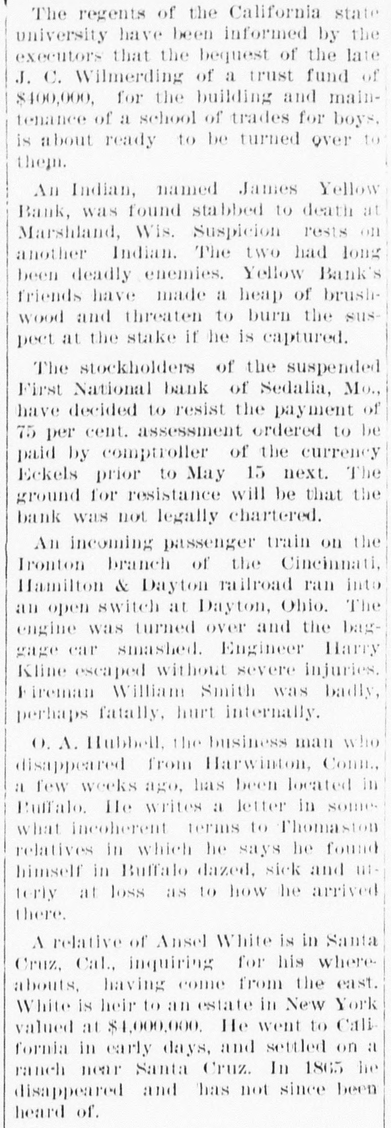 The regents of the California state university have been informed by the executors that the bequest of the late J. C. Wilmerding of a trust fund of $400,000, for the building and maintenance of a school of trades for boys, is about ready to be turned over to them. An Indian, named James Yellow Bank, was found stabbed to death at Marshland, Wis. Suspicion rests on another Indian. The two had long been deadly enemies. Yellow Bank's friends have made a heap of brushwood and threaten to burn the suspect at the stake if he is captured. The stockholders of the suspended First National bank of Sedalia, Mo., have decided to resist the payment of 75 per cent. assessment ordered to be paid by comptroller of the currency Eckels prior to May 15 next. The ground for resistance will be that the bank was not legally chartered. An incoming passenger train on the Ironton branch of the Cincinnati, Hamilton & Dayton railroad ran into an open switch at Dayton, Ohio. The engine was turned over and the baggage car smashed. Engineer Harry Kline escaped without severe injuries. Fireman William Smith was badly, perhaps fatally, hurt internally. O. A. Hubbell, the business man who disappeared from Harwinton, Conn., a few weeks ago, has been located in Buffalo. He writes a letter in somewhat incoherent terms to Thomaston relatives in which he says he found himself in Buffalo dazed, sick and 111terly at loss as to how he arrived there. A relative of Ansel White is in Santa Cruz, Cal., inquiring for his whereabouts, having come from the east. White is heir to an estate in New York valued at $4,000,000. He went to California in early days, and settled on a ranch near Santa Cruz. In 1865 he disappeared and has not since been heard of.