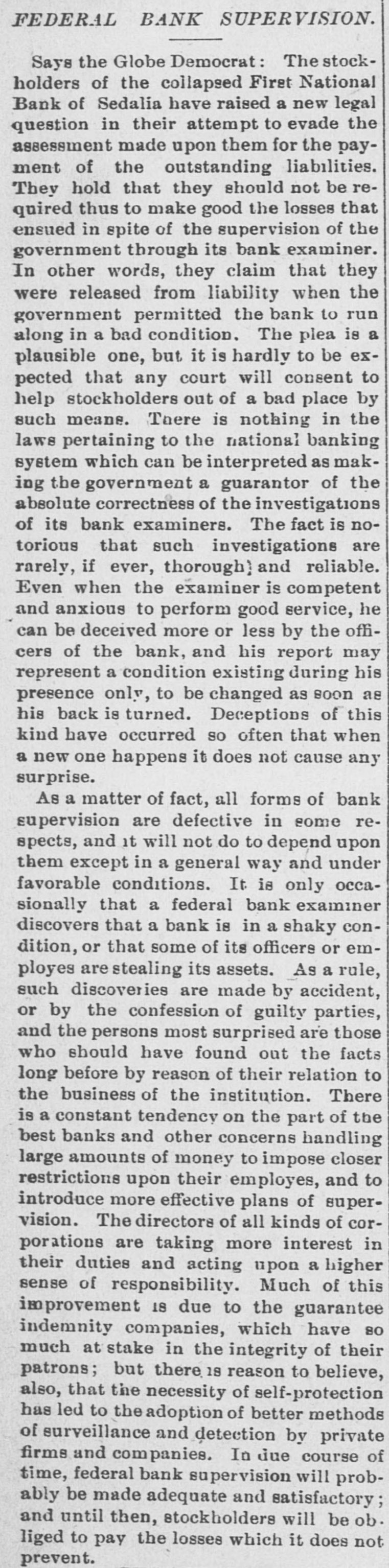 # FEDERAL BANK SUPERVISION. Says the Globe Democrat: The stockholders of the collapsed First National Bank of Sedalia have raised a new legal question in their attempt to evade the assessment made upon them for the payment of the outstanding liabilities. They hold that they should not be required thus to make good the losses that ensued in spite of the supervision of the government through its bank examiner. In other words, they claim that they were released from liability when the government permitted the bank to run along in a bad condition. The plea is a plausible one, but it is hardly to be expected that any court will consent to help stockholders out of a bad place by such means. There is nothing in the laws pertaining to the national banking system which can be interpreted as making the government a guarantor of the absolute correctness of the investigations of its bank examiners. The fact is notorious that such investigations are rarely, if ever, thorough and reliable. Even when the examiner is competent and anxious to perform good service, he can be deceived more or less by the officers of the bank, and his report may represent a condition existing during his presence only, to be changed as soon as his back is turned. Deceptions of this kind have occurred so often that when a new one happens it does not cause any surprise. As a matter of fact, all forms of bank supervision are defective in some respects, and it will not do to depend upon them except in a general way and under favorable conditions. It is only occasionally that a federal bank examiner discovers that a bank is in a shaky condition, or that some of its officers or employes are stealing its assets. As a rule, such discoveries are made by accident, or by the confession of guilty parties, and the persons most surprised are those who should have found out the facts long before by reason of their relation to the business of the institution. There is a constant tendency on the part of the best banks and other concerns handling large amounts of money to impose closer restrictions upon their employes, and to introduce more effective plans of supervision. The directors of all kinds of corporations are taking more interest in their duties and acting upon a higher sense of responsibility. Much of this improvement is due to the guarantee indemnity companies, which have so much at stake in the integrity of their patrons; but there is reason to believe, also, that the necessity of self-protection has led to the adoption of better methods of surveillance and detection by private firms and companies. In due course of time, federal bank supervision will probably be made adequate and satisfactory; and until then, stockholders will be obliged to pay the losses which it does not prevent.