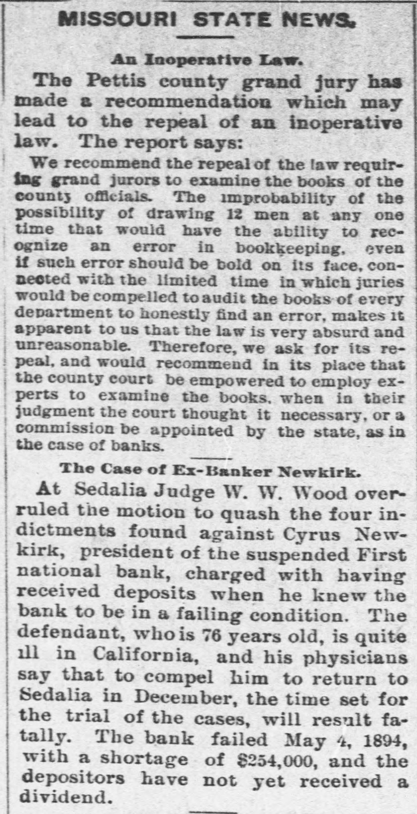 MISSOURI STATE NEWS, An Inoperative Law. The Pettis county grand jury has made a recommendation which may lead to the repeal of an inoperative law. The report says: We recommend the repeal of the law requiring grand jurors to examine the books of the county officials. The improbability of the possibility of drawing 12 men at any one time that would have the ability to recognize an error in bookkeeping, even if such error should be bold on its face, conneoted with the limited time in which juries would be compelled to audit the books of every department to honestly find an error, makes it apparent to us that the law is very absurd and unreasonable. Therefore, we ask for its repeal, and would recommend in its place that the county court be empowered to employ experts to examine the books, when in their judgment the court thought it necessary, or a commission be appointed by the state, as in the case of banks. The Case of Ex-Banker Newkirk. At Sedalia Judge W. W. Wood overruled the motion to quash the four indictments found against Cyrus Newkirk, president of the suspended First national bank, charged with having received deposits when he knew the bank to be in a failing condition. The defendant, whois 76 years old, is quite ill in California, and his physicians say that to compel him to return to Sedalia in December, the time set for the trial of the cases, will result fatally. The bank failed May 4, 1894, with a shortage of $254,000, and the depositors have not yet received a dividend.