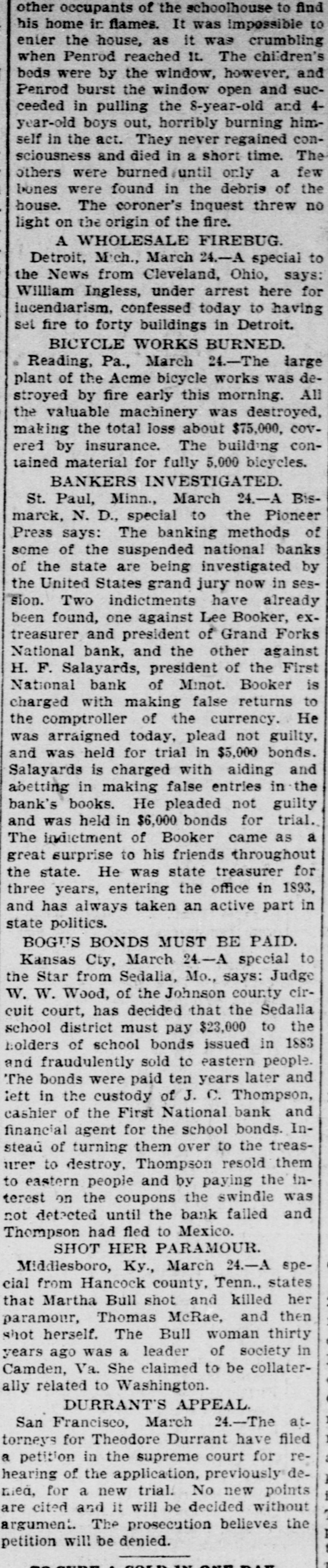 other occupants of the schoolhouse to find his home in flames. It was impossible to enter the house, as it was crumbling when Penrod reached It. The children's beds were by the window, however, and Penrod burst the window open and succeeded in pulling the 8-year-old and 4year-old boys out, horribly burning himself in the act. They never regained consciousness and died in a short time. The others were burned (until only a few bones were found in the debris of the house. The coroner's inquest threw no light on the origin of the fire. A WHOLESALE FIREBUG. Detroit, Mich., March 24.-A special to the News from Cleveland, Ohio, says: William Ingless, under arrest here for incendiarism. confessed today to having set fire to forty buildings in Detroit. BICYCLE WORKS BURNED. Reading, Pa., March 24.-The large plant of the Acme bicycle works was destroyed by fire early this morning. All the valuable machinery was destroyed, making the total loss about $75,000, covered by insurance. The building contained material for fully 5,000 bicycles. BANKERS INVESTIGATED. St. Paul, Minn., March 24.-A Bismarck, N. D., special to the Pioneer Press says: The banking methods of some of the suspended national banks of the state are being investigated by the United States grand jury now in session. Two indictments have already been found, one against Lee Booker, extreasurer and president of Grand Forks National bank, and the other against H. F. Salayards, president of the First National bank of Minot. Booker is charged with making false returns to the comptroller of the currency. He was arraigned today, plead not guilty, and was held for trial in $5,000 bonds. Salayards is charged with aiding and abetting in making false entries in the bank's books. He pleaded not guilty and was held in $6,000 bonds for trial. The indictment of Booker came as a great surprise to his friends throughout the state. He was state treasurer for three years, entering the office in 1893, and has always taken an active part in state politics. BOGUS BONDS MUST BE PAID. Kansas Cty, March 24.-A special to the Star from Sedalia, Mo., says: Judge W. W. Wood, of the Johnson county circuit court, has decided that the Sedalia school district must pay $23,000 to the holders of school bonds issued in 1883 and fraudulently sold to eastern people. The bonds were paid ten years later and left in the custody of J. C. Thompson, cashier of the First National bank and financial agent for the school bonds. Instead of turning them over to the treasurer to destroy, Thompson resold them to eastern people and by paying the interest on the coupons the swindle was not detected until the bank failed and Thompson had fled to Mexico. SHOT HER PARAMOUR. Middlesboro, Ky., March 24.-A special from Hancock county, Tenn., states that Martha Bull shot and killed her paramour, Thomas McRae, and then shot herself. The Bull woman thirty years ago was a leader of society in Camden, Va. She claimed to be collaterally related to Washington. DURRANTS APPEAL San Francisco, March 24.-The attorneys for Theodore Durrant have filed a petition in the supreme court for rehearing of the application, previously dei nied, for a new trial. No new points are cited and it will be decided without argument. The prosecution believes the I petition will be denied.