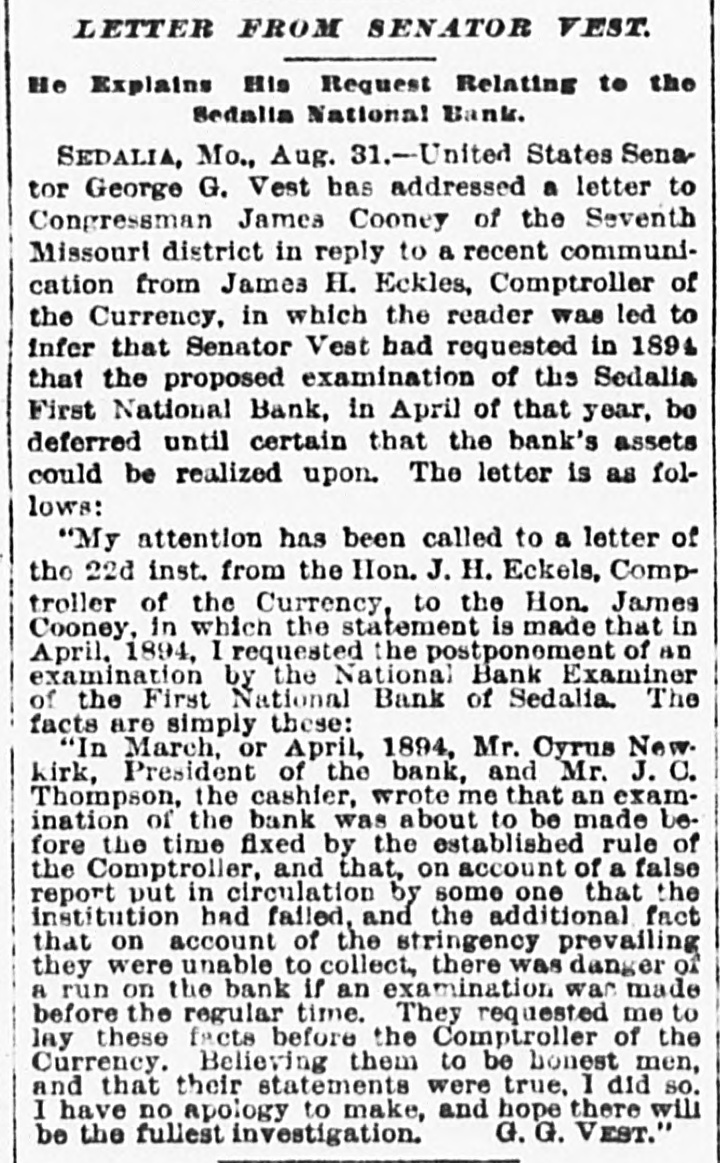 LETTER FROM SENATOR VEST. He Explains His Request Relating to the Sedalia National Bank. SEDALIA, Mo., Aug. 31.-United States Senator George G. Vest has addressed a letter to Congressman James Cooney of the Seventh Missouri district in reply to a recent communication from James H. Eckles, Comptroller of the Currency, in which the reader was led to infer that Senator Vest had requested in 1894 that the proposed examination of the Sedalia First National Bank, in April of that year, be deferred until certain that the bank's assets could be realized upon. The letter is as follows: "My attention has been called to a letter of the 22d inst. from the Hon. J. H. Eckels, Comptroller of the Currency, to the Hon. James Cooney, in which the statement is made that in April, 1894, I requested the postponement of an examination by the National Bank Examiner of the First National Bank of Sedalia. The facts are simply these: "In March, or April, 1894, Mr. Cyrus Newkirk, President of the bank, and Mr. J. C. Thompson, the cashier, wrote me that an examination of the bank was about to be made before the time fixed by the established rule of the Comptroller, and that, on account of a false report put in circulation by some one that the institution had failed, and the additional fact that on account of the stringency prevailing they were unable to collect, there was danger of a run on the bank if an examination was made before the regular time. They requested me to lay these facts before the Comptroller of the Currency. Believing them to be honest men, and that their statements were true, I did so. I have no apology to make, and hope there will G. G. VEST." be the fullest investigation.