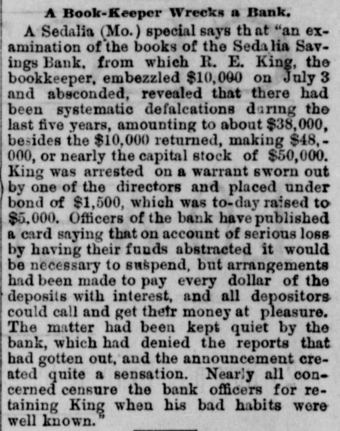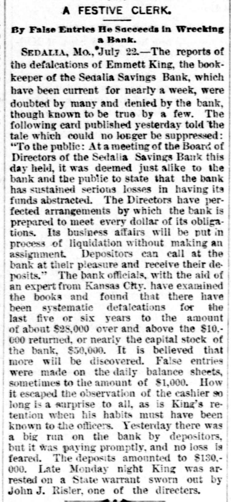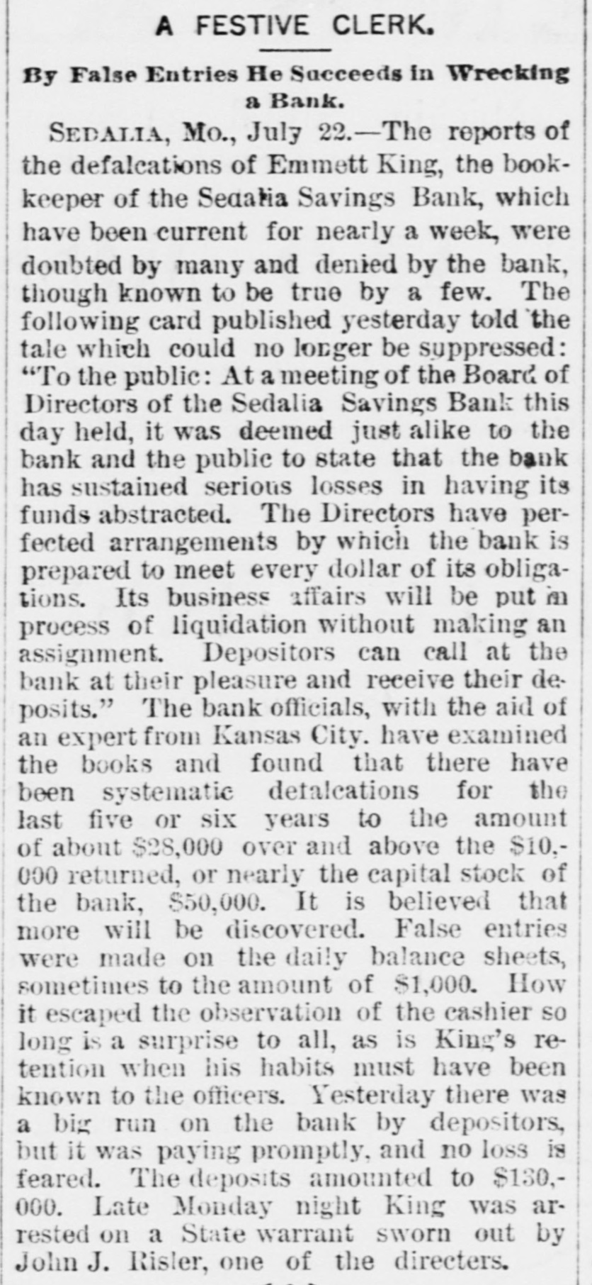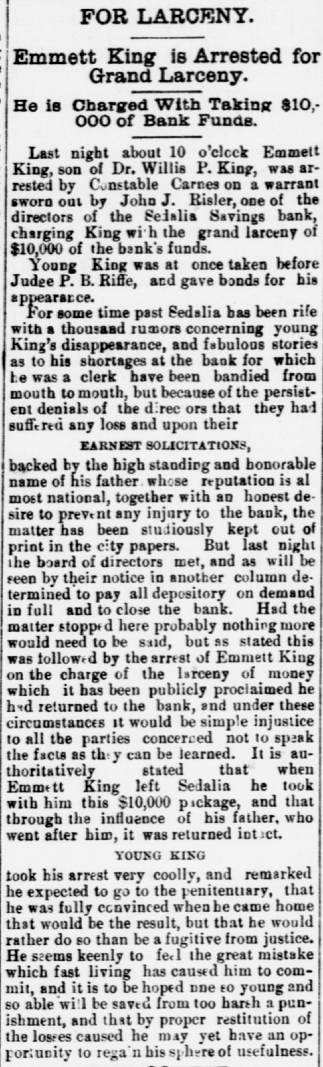 FOR LARCENY. Emmett King is Arrested for Grand Larceny. He is Charged With Taking $10,000 of Bank Funds. Last night about 10 o'clock Emmett King, son of Dr. Willis P. King, was arrested by Constable Carnes on a warrant sworn out by John J. Risler, one of the directors of the Sedalia Savings bank, charging King with the grand larceny of $10,000 of the bank's funds. Young King was at once taken before Judge P. B. Riffe, and gave bonds for his appearance. For some time past Sedalia has been rife with a thousand rumors concerning young King's disappearance, and fabulous stories as to his shortages at the bank for which he was a clerk have been bandied from mouth to mouth, but because of the persistent denials of the direc ors that they had suffered any loss and upon their EARNEST SOLICITATIONS, backed by the high standing and honorable name of his father whose reputation is al most national, together with an honest desire to prevent any injury to the bank, the matter has been studiously kept out of print in the city papers. But last night the board of directors met, and as will be seen by their notice in another column determined to pay all depository on demand in full and to close the bank. Had the matter stopped here probably nothing more would need to be said, but as stated this was followed by the arrest of Emmett King on the charge of the larceny of money which it has been publicly proclaimed he had returned to the bank, and under these circumstances It would be simple injustice to all the parties concerned not to speak the facts as they can be learned. It is authoritatively stated that when Emmett King left Sedalia he took with him this $10,000 pickage, and that through the influence of his father, who went after him, it was returned intact. YOUNG KING took his arrest very coolly, and remarked he expected to go to the penitentiary, that he was fully convinced when he came home that would be the result, but that he would rather do so than be a fugitive from justice. He seems keenly to fed the great mistake which fast living has caused him to commit, and it is to be hoped nne EO young and so able will be saved from too harsh a punishment, and that by proper restitution of the losses caused he may yet have an opportunity to regain his sphere of usefulness.