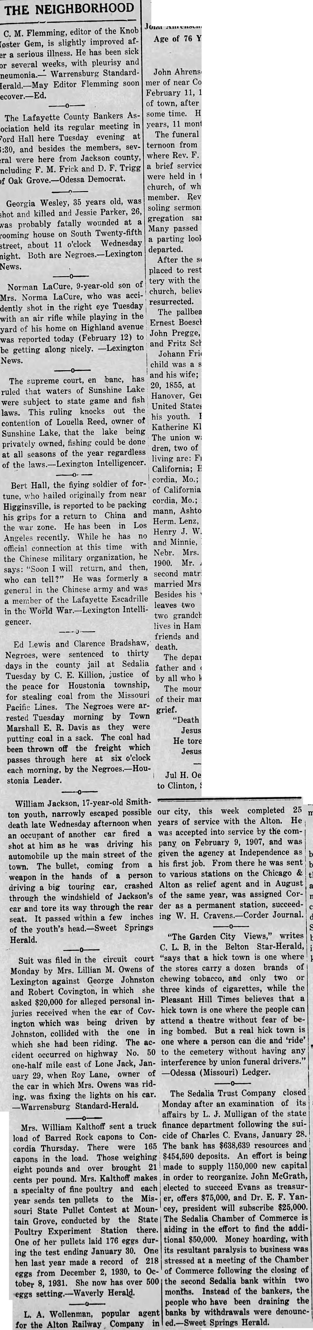 SmithWilliam Jackson, escaped possible our city, ton youth, narrowly when of death late Wednesday afternoon years car fired was accepted occupant of another an his pany on shot at him as he was driving street of the given the automobile up the main from his first job. town. The bullet, coming of to various in the hands a person weapon crashed Alton as driving big touring car, Jackson's of the same the windshield of through the rear der as a and tore its way through car ing W. H. It within few inches seat. passed of the youth's Springs "The Herald. circuit court "says that Suit was filed in the Lillian M. Owens of the stores by Mrs. Monday Johnston chewing Lexington against George which she three kinds Robert Covington, in and personal in- Pleasant asked $20,000 for alleged of Cov- hick town received when the car juries driven by attend ington which was being the in ing bombed. collided with one Johnston, The ac- one where which she had been riding. No. 50 to the cident occurred on highway Jan- interference mile east of Lone Jack, one-half owner of 29, when Roy Lane, uary which Mrs. Owens was ridthe car in the lights on his car. ing. was fixing -Warrensburg sent truck finance Mrs. William Kalthoff Rock to Con- cide of load of Barred capons 165 The bank cordia Thursday. There were Those weighing $454,590 in the load. capons 21 made to eight pounds and over brought Mrs. Kalthoff makes in order to cents per pound. a specialty of fine poultry and each the Mis- er, offers sends ten pullets to year Pullet Contest at Moun- cey, souri State tain Grove, conducted by the State Poultry Experiment Station there. One of her pullets laid 176 eggs durits resultant ing the test ending January 30. One stressed at hen last year made a record of 218 December 2, 1930, to Oceggs from 1931. She now has over 500 tober Herald. eggs agent banks by L. A. Wollenman, popular Alton Company in for the Railway this week completed 25 with the Alton. He service into service by the comFebruary 9, 1907, and was at Independence as agency From there he was sent stations the Chicago & on relief agent and in August was assigned Coryear, station, succeedpermanent Journal.