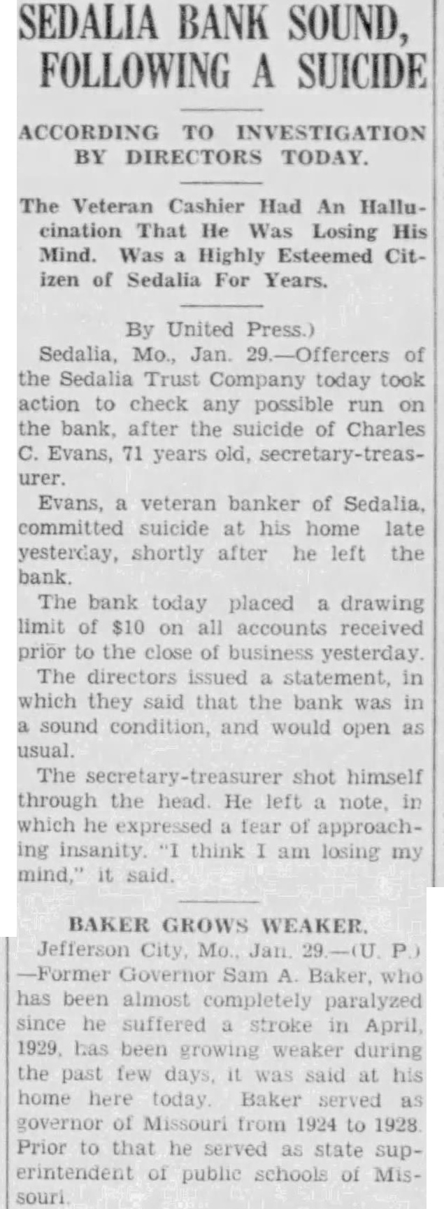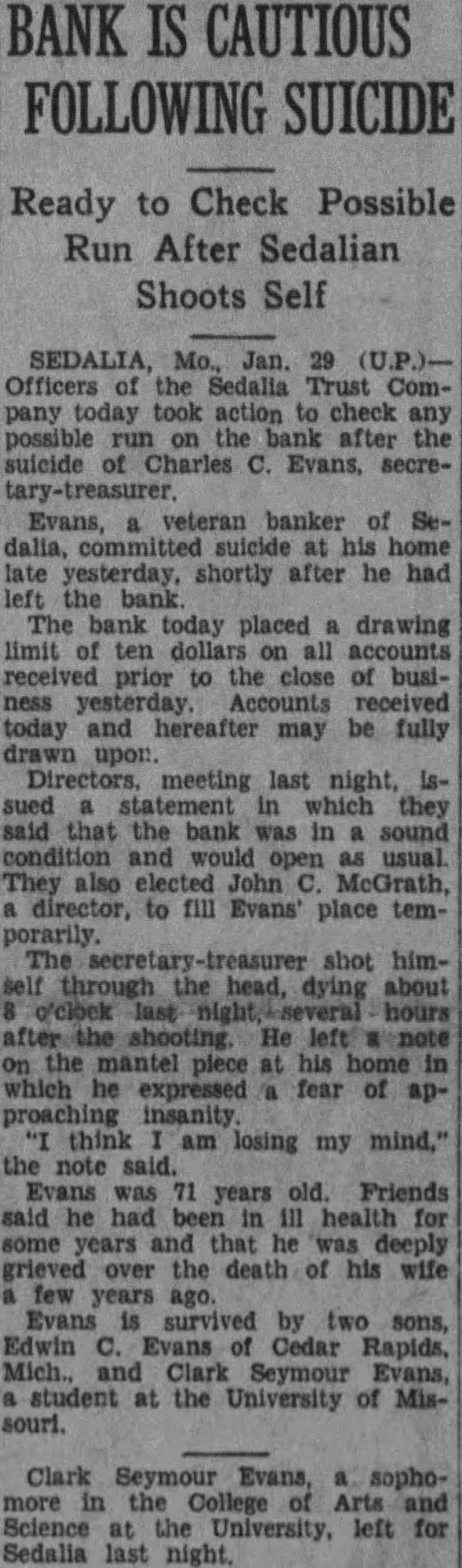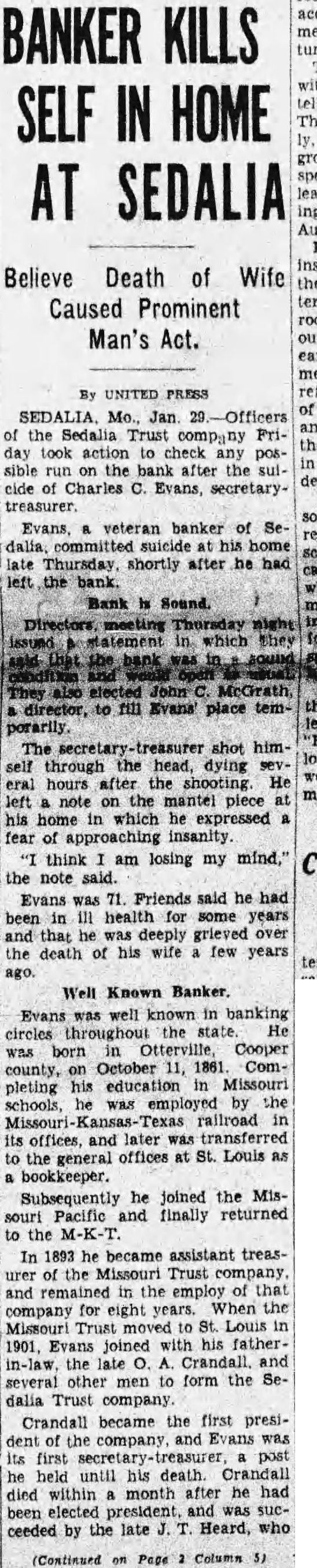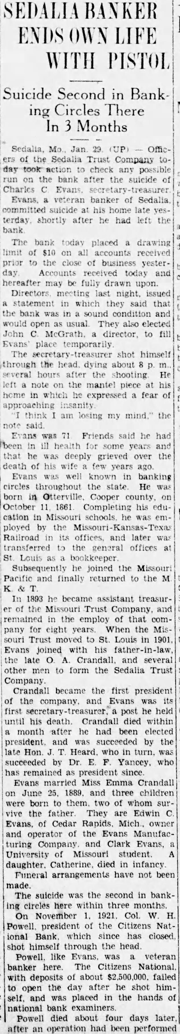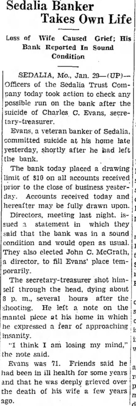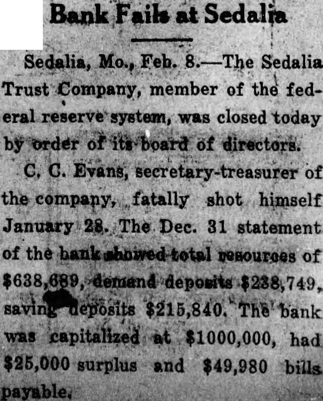 The Sedalia Trust Company closed Monday after an examination of its affairs by L. Mulligan of the state the suidepartment following Charles C. Evans, January 28. has $638,639 resources and deposits. An effort is being supply 1150,000 new capital reorganize. John McGrath, elected to succeed Evans as treasur$75,000, and Dr. Yanwill subscribe $25,000. president The Sedalia Chamber of Commerce is aiding in the effort to find the additional $50,000. Money hoarding, with paralysis to business was meeting of the Chamber of Commerce following the closing of the second Sedalia bank within two months. Instead of the bankers, the people who have been draining the withdrawals were denouncSprings Herald.