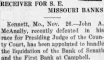 Nat'l Bank at Campbell Closed Other Bank There Receives Assurance From Its Correspondents. First National Bank Campbell failed open its doors Wednesday when the public greeted with this the door the bank November 1930 NOTICE bank closed by its Board Directors and placed the hands the National BankPresident Cashier The bank capitalized but according last published statement September of this year. had surplus The statement showed undivided profits $423.59 other liabilities ing notes. Due Bank and Demand deposits, Time Depos Bills payable making total principal items in lists according the published statements Banking house and fixtures, Real owned other than banking and from bankers other items total Cone Campbell president bank Wood signing statement Rice and This the second bank to closed in this county this month the Bank Senath closing vember The First State Bank which John Ponder cashier. Wednesday from corresponde banks in and to call upon them should threaten However. that day deposits more than equalled withdrawals and no uneasiness shown by depositors of that bank. NOTICE TO MAILERS Outgoing mail must be mailed cach day Big mailers and the business houses requested and urged to deposit their outgoing mail early Mailing should begin noi later than three-thirty each ternoon large amount of mail being deposited around five o'clock, cannot all be sent it takes much time to separate and prepare the mail for dispatch. To be assured of your mail being dispatched deposit between the hours and The cal postal force trying to the most efficient but do must have the co-operation those deposit mail in large